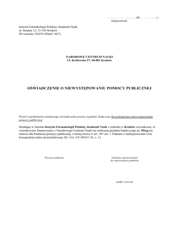 . . . . . . . . . . . . . . . . . . , dn. . . . . . . . . . . r. miejscowość Instytut Farmakologii Polskiej Akademii Nauk ul. Smętna 12, 31-343 Kraków ID wniosku 324193 (Panel: NZ7) NARODOWE CENTRUM NAUKI Ul. Królewska 57, 30-081 Kraków OŚWIADCZENIE O NIEWYSTĘPOWANIU POMOCY PUBLICZNEJ Przed wypełnieniem niniejszego oświadczenia proszę wypełnić dołączony Kwestionariusz niewystępowania pomocy publicznej. Działając w imieniu Instytut Farmakologii Polskiej Akademii Nauk z siedzibą w Kraków oświadczam, iż wnioskowane finansowanie z Narodowego Centrum Nauki na realizację projektu badawczego pt. Mózg nie stanowi dla Podmiotu pomocy publicznej, o której mowa w art. 107 ust. 1 Traktatu o funkcjonowaniu Unii Europejskiej (tekst skonsolidowany Dz. Urz. UE 2010 C 83, s. 1). Pieczęć podmiotu Osoba(y) uprawniona(e) do reprezentacji podmiotu podpis i pieczęć INSTRUKCJA DO KWESTIONARIUSZA Zgodnie z art. 107 ust. 1 Traktatu o funkcjonowaniu Unii Europejskiej (TFUE) wszelka pomoc przyznawana przez Państwo Członkowskie lub przy użyciu zasobów państwowych w jakiejkolwiek formie, która zakłóca lub grozi zakłóceniem konkurencji poprzez sprzyjanie niektórym przedsiębiorstwom lub produkcji niektórych towarów, jest niezgodna z rynkiem wewnętrznym w zakresie, w jakim wpływa na wymianę handlową między Państwami Członkowskimi. Od tej generalnej reguły zakazu udzielania pomocy publicznej istnieją jednak wyjątki, w tym np. możliwość udzielania, pod pewnymi warunkami, pomocy na działalność badawczą, rozwojową i innowacyjną (pomoc horyzontalna). Co istotne, pojęcie pomocy publicznej dotyczy tylko przedsiębiorcy, przez którego należy rozumieć przedsiębiorstwo w rozumieniu art. 1 załącznika I do rozporządzenia Komisji (UE) nr 651/2014 z dnia 17 czerwca 2014 r. uznające niektóre rodzaje pomocy za zgodne z rynkiem wewnętrznym w zastosowaniu art. 107 i 108. Przedsiębiorstwem jest każdy podmiot prowadzący działalność gospodarczą bez względu na jego formę prawną oraz źródła finansowania (orzeczenie Europejskiego Trybunału Sprawiedliwości w sprawie C-41/90 Höfner i Elser przeciwko Macrotron GmbH, Zb. Orz. TS 1991, s. I-1979). Mogą to być również podmioty nienastawione na zysk (non-profit organisation - np. orzeczenie z dnia 21 września 1999 r. w sprawie Albany, sprawa C-67/96, Zb. Orz. TS 1999, s. I-5751). Przedsiębiorstwem w myśl przepisów prawa Unii Europejskiej może być również podmiot sektora publicznego prowadzący działalność gospodarczą, w tym organizacja prowadząca badania i upowszechniająca wiedzę w zakresie w jakim prowadzi działalność gospodarczą. Organizacją prowadzącą badania i upowszechniającą wiedzę, zgodnie z definicją zawartą w art. 2 pkt. 83 rozporządzenia Komisji (UE) nr 651/2014 z dnia 17 czerwca 2014 r. uznające niektóre rodzaje pomocy za zgodne z rynkiem wewnętrznym w zastosowaniu art. 107 i 108 Traktatu jest podmiot (jak np. uniwersytet lub instytut badawczy, agencja zajmująca się transferem technologii, pośrednik w dziedzinie innowacji, fizyczny lub wirtualny podmiot prowadzący współpracę w dziedzinie badań i rozwoju) niezależnie od jego statusu prawnego (ustanowionego na mocy prawa publicznego lub prywatnego) lub sposobu finansowania, którego podstawowym celem jest samodzielne prowadzenie badań podstawowych, badań przemysłowych lub eksperymentalnych prac rozwojowych lub rozpowszechnianie na szeroką skalę wyników takich działań poprzez nauczanie, publikację lub transfer wiedzy. W przypadkach gdy tego rodzaju jednostka prowadzi również działalność gospodarczą finansowanie, koszty i dochody związane z tą działalnością gospodarczą należy rozliczać oddzielnie. Przedsiębiorstwa mogące wywierać decydujący wpływ na taki podmiot w charakterze, na przykład, jego udziałowców/akcjonariuszy czy członków mogą nie mieć preferencyjnego dostępu do uzyskanych przez niego wyników. Komisja Europejska w Zasadach ramowych dotyczących pomocy państwa na działalność badawczą, rozwojową i innowacyjną (2014/C 198/01) (Dz. Urz. UE C 198, 27.6.2014, s.1-29) (zwanych dalej „Zasadami ramowymi) określiła przykładowe rodzaje działalności gospodarczej i niegospodarczej organizacji prowadzących badania i upowszechniających wiedzę. Komisja jest jednak zdania, że zasadnicza działalność organizacji prowadzących badania i upowszechniających wiedzę ma zwykle charakter niegospodarczy, w szczególności: kształcenie mające na celu zwiększanie coraz lepiej wyszkolonych zasobów ludzkich, niezależna działalność B+R mająca na celu powiększanie zasobów wiedzy i lepsze zrozumienie, w tym działalności prowadzonej we współpracy, szerokie rozpowszechnianie wyników badań na zasadzie niedyskryminacji i braku wyłączności, np. przez nauczanie, dostępne bazy danych, otwarte publikacje i otwarte oprogramowanie. Za działalność gospodarczą organizacji prowadzących badania i upowszechniających wiedzę Komisja uznaje m.in. wynajem wyposażenia lub laboratoriów przedsiębiorstwom, świadczenie usług dla przedsiębiorstw lub prowadzenie badań na zlecenie. Jednocześnie w pkt. 18 Zasad ramowych Komisja wyjaśniła, że „Jeżeli ten sam podmiot prowadzi zarówno działalność o charakterze gospodarczym jak i niegospodarczym, to finansowanie publiczne działalności niegospodarczej nie wchodzi w zakres art. 107 ust. 1 Traktatu, jeśli oba rodzaje działalności oraz ich koszty, finansowanie i przychody można wyraźnie rozdzielić w celu uniknięcia subsydiowania skrośnego działalności gospodarczej. Dowodem na odpowiednie rozdzielenie kosztów, finansowania i przychodów mogą być roczne sprawozdania finansowe odpowiedniego podmiotu.” Zgodnie z art. 37 ust. 1 ustawy o Narodowym Centrum Nauki (Dz. U. Nr 96, poz. 617, z późn. zm.) za pośrednictwem Centrum może być udzielana pomoc publiczna w związku z realizacją zadań, o których