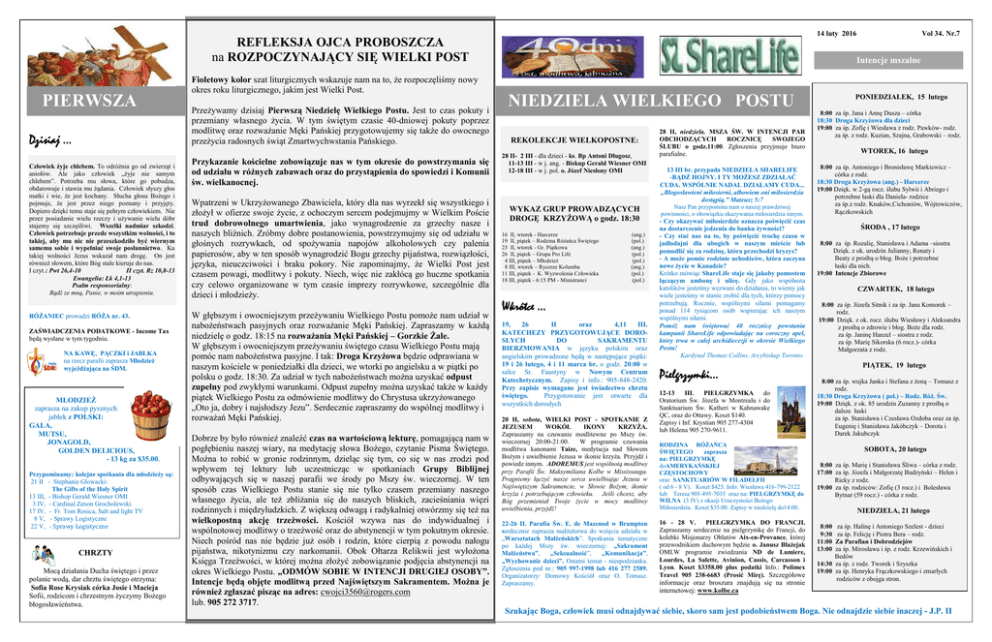 14 luty 2016 REFLEKSJA OJCA PROBOSZCZA na ROZPOCZYNAJĄCY SIĘ WIELKI POST PIERWSZA Dzisiaj … Człowiek żyje chlebem. To odróżnia go od zwierząt i aniołów. Ale jako człowiek „żyje nie samym chlebem”. Potrzeba mu słowa, które go pobudza, obdarowuje i stawia mu żądania. Człowiek słyszy głos matki i wie, że jest kochany. Słucha głosu Bożego i pojmuje, że jest przez niego poznany i przyjęty. Dopiero dzięki temu staje się pełnym człowiekiem. Nie przez posiadanie wielu rzeczy i używanie wielu dóbr stajemy się szczęśliwi. Wszelki nadmiar szkodzi. Człowiek potrzebuje przede wszystkim wolności, i to takiej, aby mu nic nie przeszkodziło być wiernym samemu sobie i wypełniać swoje posłannictwo. Ku takiej wolności Jezus wskazał nam drogę. On jest również słowem, które Bóg stale kieruje do nas. I czyt.: Pwt 26,4-10 II czyt. Rz 10,8-13 Ewangelia: Łk 4,1-13 Psalm responsorialny: Bądź ze mną, Panie, w moim utrapieniu. RÓŻANIEC prowadzi RÓŻA nr. 43. ZAŚWIADCZENIA PODATKOWE - Income Tax będą wysłane w tym tygodniu. NA KAWĘ, PĄCZKI i JABŁKA na rzecz parafii zaprasza Młodzież wyjeżdżająca na ŚDM. MŁODZIEŻ zaprasza na zakup pysznych jabłek z POLSKI: GALA, MUTSU, JONAGOLD, GOLDEN DELICIOUS, - 13 kg za $35.00. Przypominamy: kolejne spotkania dla młodzieży są: 21 II - Stephanie Glowacki: The Gifts of the Holy Spirit 13 III, - Bishop Gerald Wiesner OMI 3 IV, - Cardinal Zenon Grocholewski 17 IV, - Fr. Tom Rosica, Salt and light TV 8 V, - Sprawy Logistyczne 22 V, - Sprawy Logistyczne CHRZTY Mocą działania Ducha świętego i przez polanie wodą, dar chrztu świętego otrzyma: Sofia Rose Krysiak córka Josie i Macieja Sofii, rodzicom i chrzestnym życzymy Bożego błogosławieństwa. Fioletowy kolor szat liturgicznych wskazuje nam na to, że rozpoczęliśmy nowy okres roku liturgicznego, jakim jest Wielki Post. Przeżywamy dzisiaj Pierwszą Niedzielę Wielkiego Postu. Jest to czas pokuty i przemiany własnego życia. W tym świętym czasie 40-dniowej pokuty poprzez modlitwę oraz rozważanie Męki Pańskiej przygotowujemy się także do owocnego przeżycia radosnych świąt Zmartwychwstania Pańskiego. Przykazanie kościelne zobowiązuje nas w tym okresie do powstrzymania się od udziału w różnych zabawach oraz do przystąpienia do spowiedzi i Komunii św. wielkanocnej. Wpatrzeni w Ukrzyżowanego Zbawiciela, który dla nas wyrzekł się wszystkiego i złożył w ofierze swoje życie, z ochoczym sercem podejmujmy w Wielkim Poście trud dobrowolnego umartwienia, jako wynagrodzenie za grzechy nasze i naszych bliźnich. Zróbmy dobre postanowienia, powstrzymujmy się od udziału w głośnych rozrywkach, od spożywania napojów alkoholowych czy palenia papierosów, aby w ten sposób wynagrodzić Bogu grzechy pijaństwa, rozwiązłości, języka, nieuczciwości i braku pokory. Nie zapominajmy, że Wielki Post jest czasem powagi, modlitwy i pokuty. Niech, więc nie zakłócą go huczne spotkania czy celowo organizowane w tym czasie imprezy rozrywkowe, szczególnie dla dzieci i młodzieży. W głębszym i owocniejszym przeżywaniu Wielkiego Postu pomoże nam udział w nabożeństwach pasyjnych oraz rozważanie Męki Pańskiej. Zapraszamy w każdą niedzielę o godz. 18:15 na rozważania Męki Pańskiej – Gorzkie Żale. W głębszym i owocniejszym przeżywaniu świętego czasu Wielkiego Postu mają pomóc nam nabożeństwa pasyjne. I tak: Droga Krzyżowa będzie odprawiana w naszym kościele w poniedziałki dla dzieci, we wtorki po angielsku a w piątki po polsku o godz. 18:30. Za udział w tych nabożeństwach można uzyskać odpust zupełny pod zwykłymi warunkami. Odpust zupełny można uzyskać także w każdy piątek Wielkiego Postu za odmówienie modlitwy do Chrystusa ukrzyżowanego „Oto ja, dobry i najsłodszy Jezu”. Serdecznie zapraszamy do wspólnej modlitwy i rozważań Męki Pańskiej. Dobrze by było również znaleźć czas na wartościową lekturę, pomagającą nam w pogłębieniu naszej wiary, na medytację słowa Bożego, czytanie Pisma Świętego. Można to robić w gronie rodzinnym, dzieląc się tym, co się w nas zrodzi pod wpływem tej lektury lub uczestnicząc w spotkaniach Grupy Biblijnej odbywających się w naszej parafii we środy po Mszy św. wieczornej. W ten sposób czas Wielkiego Postu stanie się nie tylko czasem przemiany naszego własnego życia, ale też zbliżania się do naszych bliskich, zacieśniania więzi rodzinnych i międzyludzkich. Z większą odwagą i radykalniej otwórzmy się też na wielkopostną akcję trzeźwości. Kościół wzywa nas do indywidualnej i wspólnotowej modlitwy o trzeźwość oraz do abstynencji w tym pokutnym okresie. Niech pośród nas nie będzie już osób i rodzin, które cierpią z powodu nałogu pijaństwa, nikotynizmu czy narkomanii. Obok Ołtarza Relikwii jest wyłożona Księga Trzeźwości, w której można złożyć zobowiązanie podjęcia abstynencji na okres Wielkiego Postu. „ODMÓW SOBIE W INTENCJI DRUGIEJ OSOBY”. Intencje będą objęte modlitwą przed Najświętszym Sakramentem. Można je również zgłaszać pisząc na adres: [email protected] lub. 905 272 3717. Vol 34. Nr.7 Intencje mszalne którzy włożyli ogrom pracy w przygotowania przed Bożym Narodzeniem, i tym którzy swoją posługą uświetnili Liturgię NIEDZIELA WIELKIEGO POSTU REKOLEKCJE WIELKOPOSTNE: 28 II- 2 III - dla dzieci - ks. Bp Antoni Długosz, 11-13 III - w j. ang. - Biskup Gerald Wiesner OMI 12-18 III - w j. pol. o. Józef Niesłony OMI WYKAZ GRUP PROWADZĄCYCH DROGĘ KRZYŻOWĄ o godz. 18:30 16 II, wtorek - Harcerze 19 II, piątek – Rodzina Różańca Świętego 23 II, wtorek - Gr. Piątkowa 26 II, piątek – Grupa Pro Life 4 III, piątek – Młodzież 8 III, wtorek – Rycerze Kolumba 11 III, piątek - K. Wyzwolenia Człowieka 18 III, piątek - 6:15 PM - Ministranci (ang.) (pol.) (ang.) (pol.) (pol.) (ang.) (pol.) (pol.) Wkrótce … 19, 26 II oraz 4,11 III. KATECHEZY PRZY