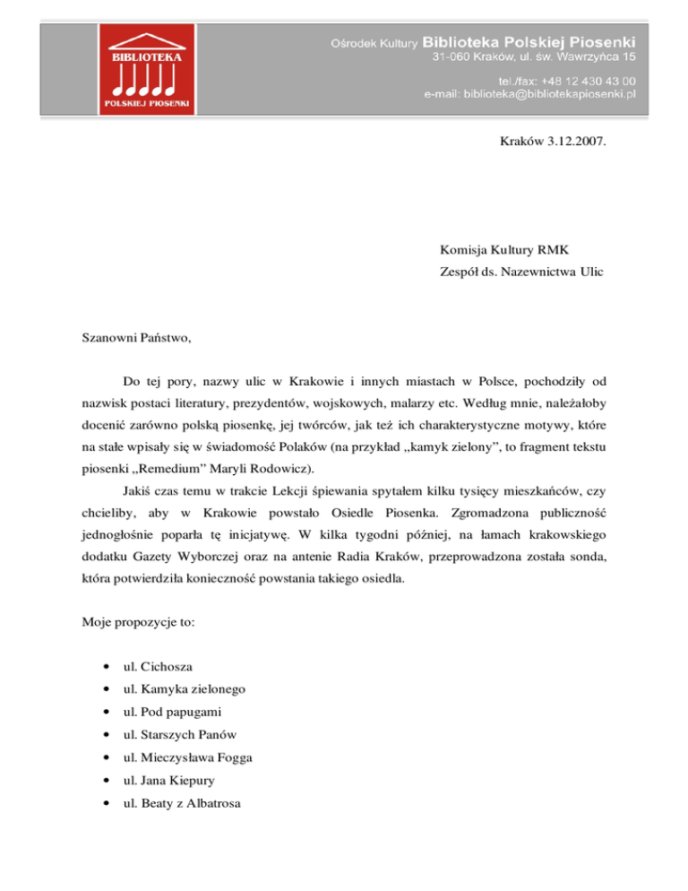 Kraków 3.12.2007. Komisja Kultury RMK Zespół ds. Nazewnictwa Ulic Szanowni Państwo, Do tej pory, nazwy ulic w Krakowie i innych miastach w Polsce, pochodziły od nazwisk postaci literatury, prezydentów, wojskowych, malarzy etc. Według mnie, należałoby docenić zarówno polską piosenkę, jej twórców, jak też ich charakterystyczne motywy, które na stałe wpisały się w świadomość Polaków (na przykład „kamyk zielony”, to fragment tekstu piosenki „Remedium” Maryli Rodowicz). Jakiś czas temu w trakcie Lekcji śpiewania spytałem kilku tysięcy mieszkańców, czy chcieliby, aby w Krakowie powstało Osiedle Piosenka. Zgromadzona publiczność jednogłośnie poparła tę inicjatywę. W kilka tygodni później, na łamach krakowskiego dodatku Gazety Wyborczej oraz na antenie Radia Kraków, przeprowadzona została sonda, która potwierdziła konieczność powstania takiego osiedla. Moje propozycje to: • ul. Cichosza • ul. Kamyka zielonego • ul. Pod papugami • ul. Starszych Panów • ul. Mieczysława Fogga • ul. Jana Kiepury • ul. Beaty z Albatrosa • ul. Marka Grechuty • ul. Henryka Warsa • ul. Prześlicznej wiolonczelistki • ul. Agnieszki Osieckiej • ul. Kolorowych jarmarków • ul. Przybory i Wasowskiego • ul. Jerzego Petersburskiego • ul. Anny Jantar • ul. Władysława Szpilmana • ul. Mariana Hemara • ul. Ordonki (Hanki Ordonówny) • ul. Emanuela Szlechtera • ul. Tadeusza Nalepy • ul. Na zakręcie • ul. Białych latawców • ul. Żółtych kalendarzy • ul. C’est la vie • ul. Anny Marii • ul. Czarnego Alibaby • ul. Okularników • ul. Ostatniej niedzieli • ul. Chłopców radarowców • ul. Trzech zapałek • ul. Anny German • ul. Andrzeja Zauchy • ul. Jacka Kaczmarskiego • ul. Marka Bellona • ul. Domku bez adresu • ul. Jonasza Kofty • ul. Samby sikoreczki • ul. Deszczy niespokojnych • ul. W siną dal Jako autor pomysłu, dokonałem cenzury nazw zgłaszanych przez Krakowian, kierując się dobrym smakiem, powagą tematu, jak również oceną ważności tytułu danej piosenki lub postaci dla polskiej kultury, dlatego odrzuciłem nazwy ulic typu: Kryzysowej narzeczonej, Bananowego songu, Windy do nieba, Uciekającego serca czy Płonącej stodoły. Proponuję rozważenie propozycji, aby lokalizacja przyszłego Osiedla Piosenki, obejmowała rozległy obszar, na którym to mogłyby znaleźć się jak największa ilość zaproponowanych nazw ulic oraz muszla koncertowa. Waldemar Domański