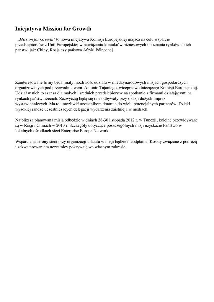 Inicjatywa Mission for Growth „Mission for Growth" to nowa inicjatywa Komisji Europejskiej mająca na celu wsparcie przedsiębiorców z Unii Europejskiej w nawiązaniu kontaktów biznesowych i poznania rynków takich państw, jak: Chiny, Rosja czy państwa Afryki Północnej. Zainteresowane firmy będą miały możliwość udziału w międzynarodowych misjach gospodarczych organizowanych pod przewodnictwem Antonio Tajaniego, wiceprzewodniczącego Komisji Europejskiej. Udział w nich to szansa dla małych i średnich przedsiębiorstw na spotkanie z firmami działającymi na rynkach państw trzecich. Zazwyczaj będą się one odbywały przy okazji dużych imprez wystawienniczych. Ma to umożliwić uczestnikom dotarcie do wielu potencjalnych partnerów. Dzięki wysokiej randze uczestniczących delegacji wydarzenia zaistnieją w mediach. Najbliższa planowana misja odbędzie w dniach 28-30 listopada 2012 r. w Tunezji; kolejne przewidywane są w Rosji i Chinach w 2013 r. Szczegóły dotyczące poszczególnych misji uzyskacie Państwo w lokalnych ośrodkach sieci Enterprise Europe Network. Wsparcie ze strony sieci przy organizacji udziału w misji będzie nieodpłatne. Koszty związane z podróżą i zakwaterowaniem uczestnicy pokrywają we własnym zakresie. Powered by TCPDF (www.tcpdf.org)