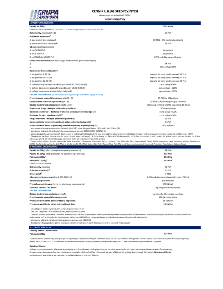 CENNIK USŁUG SPEDYCYJNYCH obowiązuje od dnia 01.02.2008r. Serwis krajowy I. PRZESYŁKI PACZKOWE Paczka do 30kg¹ USŁUGI DODATKOWE (w zależności od wybranego operatora opcja A lub B) Dokumenty zwrotne (A i B) 27 PLN/szt. 10 PLN Pobiernia należności2: A. zwrot do 3 dni roboczych 10 PLN + 1% wartości pobrania B. zwrot do 10 dni roboczych 12 PLN Ubezpieczenie przesyłek: A. do 50 000PLN B. do 5 000PLN B. od 5000 do 50 000 PLN bezpłatnie bezpłatnie 0,5% zadeklarowanej kwoty Doręczenie sobotnie (nie dot.usług z doręczeniem gwarantowanym): A. 38 PLN B. cena usługi+50% Doręczenia Gwarantowane³: 1. do godziny 9.30 (B) dopłata do ceny podstawowej 50 PLN 2. do godziny 10.00 (A) dopłata do ceny podstawowej 40 PLN 3. do godziny 12.00 (B) dopłata do ceny podstawowej 30 PLN 4. odbiór/doręczenia przesyłki w godzinach 17.00-19.00 (B) cena usługi +50% 5. odbiór doręczenie przesyłki w godzinach 19.00-8.00 (B) cena usługi +100% 6. odbiór doręczenie w niedzielę i święta (B) cena usługi +100% OPŁATY DODATKOWE (w zależności od wybranego operatora opcja A lub B) Przechowanie przesyłki na magazynie (A i B) Oczekiwanie kuriera na przesyłkę (A i B) Dojazd kuriera bez podjęcia przesyłki (A i B) Dopłata za drugą i kolejne próby doręczenia (A) 15 PLN za 10kg/dobę 15 PLN za każde rozpoczęte 10 minut opłata wg cennika klienta za paczkę do 30 kg 30% ceny usługi Dodatek sezonowy - dostawa w okresie szczytu przewozowego (A)4 cena usługi +7,5% Dostawa do sieci handlowych (A)5 cena usługi +30% Druga nieudana i kolejne próby doręczenia (B) 12 PLN Udostępnienie elektronicznej kopii potwierdzenia dostawy (B) 0,5PLN Przesłanie do Klienta papierowej lub elektronicznej kopii etykiety (B) 15 PLN/kopia ¹ Max. objętość paczki wynosi 0,2m³ (A) lub 0,25m ³ (B), max. długość boku 150cm (A) lub 175cm (B). ² Max.kwota pobrania dla jednego listu przewozowego wynosi: 5000PLN (A), 4000PLN (B) ³ Usługa doręczeń gwarantowanych dostęna jest w wybranych lokalizacjach. W celu sprawdzenia czy w wybranej lokalizacji dostępny jest serwis gwarantowany należy skontaktować się z BOK 4 Obowiązuje każdego roku w okresie: przez 10 dni roboczych przed i 4 dni robocze po Świętach Wielkanocnych; od 5 dnia roboczego przed 1 maja, do 3 dnia roboczego po 3 maja; od 5 dnia roboczego przed, do 3 dnia roboczego po Bożym Ciele; od 15 października do 31 grudnia 5 Dotyczy sieci: Albert, Auchan, Biedronka, Billa, Carrefour, Castorama, Champion, DLS, E. Leclerec, Eko, Eldorado, Elea, Electroworld, Geant, Globi, Hypernova, Ikea, Jeronimo Martins Distribution (JMD), Kaufland, Leroy Merlin, Lidl, Makro, Media Markt, Mini Mal, Netto, Obi, Piotr i Paweł, Plus, Polo Market, Pakość (centrum dystrybucyjne), Praktiker, Real, Saturn, Selgros, Tesco II. PRZESYŁKI DROBNICOWE Paczka do 50kg¹ (dot. przesyłek niespaletyzowanych) 75 PLN Paczka do 99kg² (dot. przesyłek na podstawie paletowej) 135 PLN Paleta do 800kg³ 203 PLN Paleta do 1100kg3 USŁUGI DODATKOWE 243 PLN Dokumenty zwrotne 10 PLN Pobranie należności4 20 PLN Zwrot palet5 Ubezpieczenie przesyłek (do 2 000 000PLN) Paletyzacja przesyłki Przepakowanie towaru (cena nie obejmuje opakowania) Dostawa towaru "do drzwi" OPŁATY DODATKOWE 5 PLN 0,3% zadeklarowanej wartości, min. 70 PLN 100 PLN/pal. 65PLN/pal. wg indywidualnej wyceny Dojazd kuriera bez podjęcia przesyłki wg cennika Klienta jak za usługę Przechowanie przesyłki na magazynie 30PLN za szt./dobę Przesłanie do Klienta potwierdzonej kopii listu 15 PLN/list Przesłanie do Klienta elektronicznej kopii listu 5 PLN/list 1 Max.objętość paczki wynosi 0,25m 3, max.długość boku 175cm 2 Dot. tzw. "półpalet", max.rozmiar 40x60, max.wysokość 120cm 3 Cena dot. palet o podstawie 120x80cm, max.wysokość 180cm. W przypadku palet o podstawie przekraczającej wymiar 120x80cm cena za paletę liczona jest ze wzrostu proporcji wielkości podstawy (w m 2) w stosunku do standardowej palety euro (120x80cm) z odpowiedniego przedziału wagowego dla przesyłek paletowych 4 Max.kwota pobrania na jednym liście przewozowym wynosi 4 000PLN 5 Zwrotowi podlegają jedynie palety cechowane znakiem EUR. Zwrot palet dokonywany jest w okresach miesięcznych III. USŁUGI SPECJALNE Lokalny Serwis Drobnicowy* Paleta do 800kg 125 PLN * Lokalny serwis drobnicowy dostępny jest w wybranych zakresach kodowych na terenie kraju. W celu sprawdzenia dostępności serwisu należy skontaktować się z BOK Grupy Zakupowej pod nr. tel. 4817 86 0000 1. W Lokalnym Serwisie Drobnicowym obowiązuje tabela Usług Dodatkowych oraz Opłat Dodatkowych jak w serwisie krajowym Opiekun Klienta Usługa przeznaczona dla Klientów wymagających dodatkowej obsługi w zakresie monitorowania zleceń oraz raportowania operacyjno-finansowego. Rozwiązanie oferowane firmom nadającym przesyłki z kilku działów, różnorodnej specyfiki (paczki, palety, kontenery). ObowiązkiOpiekuna Klienta ustalane oraz wyceniane są zależnie od indywidualnych potrzeb Klienta. Serwis międzynarodowy PRZESYŁKI PACZKOWE - EXPORTOWY SERWIS DROGOWY* Cena podstawowa za 1 paczkę <PLN> Kraj docelowy Strefa Czas Dostawy Austria 1 Belgia 1 Bułgaria Czechy Dodatkowe opłaty <EUR> odprawa celna1 (dot.przesyłki) strefowa2 (dot.paczki) 10,0 kg 31,5 kg 3-4 99 130 3-4 99 130 2 4-5 112 140 1 2 99 130 Dania 1 3-4 99 130 10 Estonia 1 3 99 130 10 Finlandia 2 4-5 112 140 20 Francja 2 3-4 112 140 10 Grecja 3 5-6 155 180 15 Hiszpania 3 4-5 155 180 Holandia 1 3-4 99 130 Irlandia 3 4-5 155 180 Irlandia Północna 3 4-5 155 180 Litwa 1 2 99 130 Luksemburg 1 3-4 99 130 Łotwa 1 2-3 99 130 Niemcy4 Norwegia 1 2-3 99 130 3 4-5 155 180 Portugalia 3 4-5 155 180 Rumunia 2 4-5 112 140 Słowacja 1 2 99 130 Słowenia 2 4-5 112 140 2 4-5 112 140 2 4-5 112 140 Szwajcaria Szwecja 4 Węgry 1 3-4 99 130 Wielka Brytania 2 4-5 112 140 Włochy3,4 2 4-5 112 140 5 10 10 40 40 60 40 15 3 15/60 PRZESYŁKI PACZKOWE - IMPORTOWY SERWIS DROGOWY* Cena podstawowa za 1 paczkę <PLN> Kraj docelow