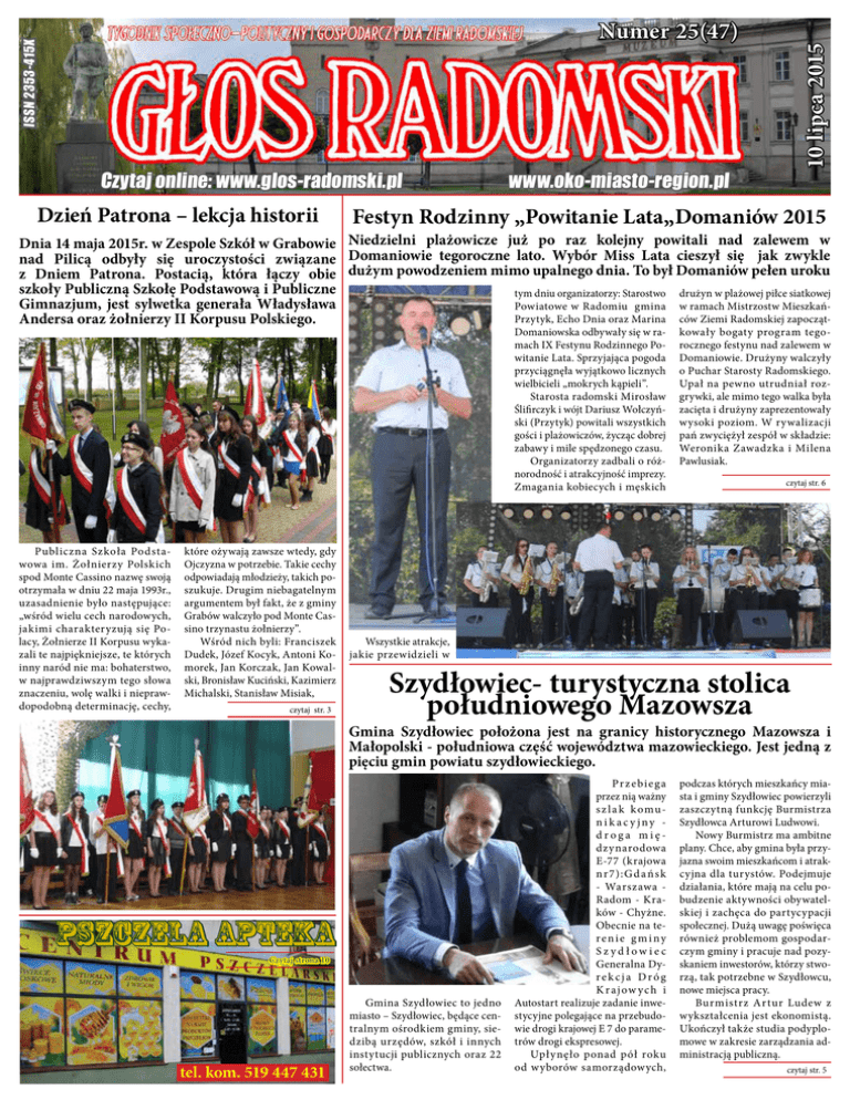 Czytaj online: www.glos-radomski.pl Dzień Patrona – lekcja historii 10 lipca 2015 ISSN 2353-415X Numer 25(47) www.oko-miasto-region.pl Festyn Rodzinny „Powitanie Lata„Domaniów 2015 Dnia 14 maja 2015r. w Zespole Szkół w Grabowie Niedzielni plażowicze już po raz kolejny powitali nad zalewem w nad Pilicą odbyły się uroczystości związane Domaniowie tegoroczne lato. Wybór Miss Lata cieszył się jak zwykle z Dniem Patrona. Postacią, która łączy obie dużym powodzeniem mimo upalnego dnia. To był Domaniów pełen uroku szkoły Publiczną Szkołę Podstawową i Publiczne tym dniu organizatorzy: Starostwo drużyn w plażowej piłce siatkowej Gimnazjum, jest sylwetka generała Władysława Powiatowe w Radomiu gmina w ramach Mistrzostw MieszkańPrzytyk, Echo Dnia oraz Marina ców Ziemi Radomskiej zapoczątAndersa oraz żołnierzy II Korpusu Polskiego. Domaniowska odbywały się w ramach IX Festynu Rodzinnego Powitanie Lata. Sprzyjająca pogoda przyciągnęła wyjątkowo licznych wielbicieli „mokrych kąpieli”. Starosta radomski Mirosław Ślifirczyk i wójt Dariusz Wołczyński (Przytyk) powitali wszystkich gości i plażowiczów, życząc dobrej zabawy i mile spędzonego czasu. Organizatorzy zadbali o różnorodność i atrakcyjność imprezy. Zmagania kobiecych i męskich Publiczna Szkoła Podstawowa im. Żołnierzy Polskich spod Monte Cassino nazwę swoją otrzymała w dniu 22 maja 1993r., uzasadnienie było następujące: „wśród wielu cech narodowych, jakimi charakteryzują się Polacy, Żołnierze II Korpusu wykazali te najpiękniejsze, te których inny naród nie ma: bohaterstwo, w najprawdziwszym tego słowa znaczeniu, wolę walki i nieprawdopodobną determinację, cechy, które ożywają zawsze wtedy, gdy Ojczyzna w potrzebie. Takie cechy odpowiadają młodzieży, takich poszukuje. Drugim niebagatelnym argumentem był fakt, że z gminy Grabów walczyło pod Monte Cassino trzynastu żołnierzy”. Wśród nich byli: Franciszek Dudek, Józef Kocyk, Antoni Komorek, Jan Korczak, Jan Kowalski, Bronisław Kuciński, Kazimierz Michalski, Stanisław Misiak, czytaj str. 3 kowały bogaty program tegorocznego festynu nad zalewem w Domaniowie. Drużyny walczyły o Puchar Starosty Radomskiego. Upał na pewno utrudniał rozgrywki, ale mimo tego walka była zacięta i drużyny zaprezentowały wysoki poziom. W rywalizacji pań zwyciężył zespół w składzie: Weronika Zawadzka i Milena Pawlusiak. czytaj str. 6 Wszystkie atrakcje, jakie przewidzieli w Szydłowiec- turystyczna stolica południowego Mazowsza Gmina Szydłowiec położona jest na granicy historycznego Mazowsza i Małopolski - południowa część województwa mazowieckiego. Jest jedną z pięciu gmin powiatu szydłowieckiego. PSZCZELA APTEKA Czytaj strona 10 tel. kom. 519 447 431 Gmina Szydłowiec to jedno miasto – Szydłowiec, będące centralnym ośrodkiem gminy, siedzibą urzędów, szkół i innych instytucji publicznych oraz 22 sołectwa. P r z e bi e g a przez nią ważny s z l a k k o muni kac y jny droga międzynarodowa E-77 (krajowa n r 7): G d a ń s k - Warszawa Radom - Kraków - Chyżne. Obecnie na terenie g mi ny Szydłowiec Generalna Dyrekcja Dróg K r a j ow y c h i Autostart realizuje zadanie inwestycyjne polegające na przebudowie drogi krajowej E 7 do parametrów drogi ekspresowej. Upł ynęło ponad pół roku od wyborów samorządowych, podczas których mieszkańcy miasta i gminy Szydłowiec powierzyli zaszczytną funkcję Burmistrza Szydłowca Arturowi Ludwowi. Nowy Burmistrz ma ambitne plany. Chce, aby gmina była przyjazna swoim mieszkańcom i atrakcyjna dla turystów. Podejmuje działania, które mają na celu pobudzenie aktywności obywatelskiej i zachęca do partycypacji społecznej. Dużą uwagę poświęca również problemom gospodarczym gminy i pracuje nad pozyskaniem inwestorów, którzy stworzą, tak potrzebne w Szydłowcu, nowe miejsca pracy. Burmistrz Artur Ludew z wykształcenia jest ekonomistą. Ukończył także studia podyplomowe w zakresie zarządzania administracją publiczną. czytaj str. 5 2 GŁOS RADOMSKI Aktualności Długowieczność spółdzielni mieszkaniowych Dzień Spółdzielczości obchodzony 1 lipca stał się okazją do spotkania i porozmawiania z prezesem Spółdzielni Śródmieście – Panem Dariuszem Chłopickim. Niedawno, obchodziliśmy Dzień Spółdzielczości. Czy uważa Pan, że spółdzielnie, w obecnych czasach, dalej mają rację bytu? Spółdzielnie nie tylko mieszkaniowe, ale wszelkiego rodzaju spółdzielnie, nadal mają rację bytu. Spółdzielczość ma już ponad 100-letnią historię i tradycję i cel jaki przed nią stał – budowa mieszkań - jest nadal aktualny, potrzebny i realizowany. Przypomnę w związku z tym dniem króciutki rys historyczny. Spółdzielczość mieszkaniowa miała pewne zasady. W latach 20tych do okresu przedwojennego istniała i zajmowała się budową mieszkań jedno- i dwuizbowych, żeby wypełniać lukę na ówczesnym rynku. W 1919 roku sejm wydał ustawę o państwowym funduszu budowlanym - to są te elementy, które ustawowo kreowały spółdzielczość mieszkaniową. W latach 20-tych powstała ustawa dająca podwaliny dla budownictwa społecznego. I to szło w dobrym kierunku. Rok 1956 - nowa polityka mieszkaniowa. To również rok, w którym odbył się I Zjazd Delegatów Spółdzielni Mieszkaniowych. W 1965 roku - reforma dotycząca wysokości czynszów. I lata 80-te, gdzie pojawia się spadek ilości budowanych mieszkań. Czyli już w tym momencie pojawia się niedobór mieszkań na rynku. Większość budynków mieszkalnych, w wielu spółdzielniach, to lata PRL-u. Czy spółdzielnie budują nowe mieszkania, czy tylko ograniczają się do ich remontu? W Radomiu wówczas powstawały takie spółdzielnie, jak: Radomska Spółdzielnia Mieszkaniowa w całości, Spółdzielnie: Budowlani, Nasz Dom, czy Ustronie. To duży obszar, nie mówiąc o całym kraju, gdzie budynki powstawały z cegły, np. w Śródmie