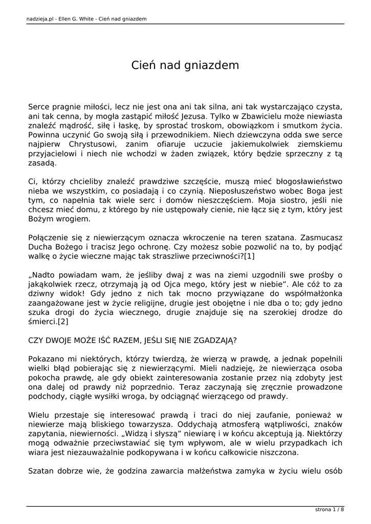 nadzieja.pl - Ellen G. White - Cień nad gniazdem Cień nad gniazdem Serce pragnie miłości, lecz nie jest ona ani tak silna, ani tak wystarczająco czysta, ani tak cenna, by mogła zastąpić miłość Jezusa. Tylko w Zbawicielu może niewiasta znaleźć mądrość, siłę i łaskę, by sprostać troskom, obowiązkom i smutkom życia. Powinna uczynić Go swoją siłą i przewodnikiem. Niech dziewczyna odda swe serce najpierw Chrystusowi, zanim ofiaruje uczucie jakiemukolwiek ziemskiemu przyjacielowi i niech nie wchodzi w żaden związek, który będzie sprzeczny z tą zasadą. Ci, którzy chcieliby znaleźć prawdziwe szczęście, muszą mieć błogosławieństwo nieba we wszystkim, co posiadają i co czynią. Nieposłuszeństwo wobec Boga jest tym, co napełnia tak wiele serc i domów nieszczęściem. Moja siostro, jeśli nie chcesz mieć domu, z którego by nie ustępowały cienie, nie łącz się z tym, który jest Bożym wrogiem. Połączenie się z niewierzącym oznacza wkroczenie na teren szatana. Zasmucasz Ducha Bożego i tracisz Jego ochronę. Czy możesz sobie pozwolić na to, by podjąć walkę o życie wieczne mając tak straszliwe przeciwności?[1] „Nadto powiadam wam, że jeśliby dwaj z was na ziemi uzgodnili swe prośby o jakąkolwiek rzecz, otrzymają ją od Ojca mego, który jest w niebie”. Ale cóż to za dziwny widok! Gdy jedno z nich tak mocno przywiązane do współmałżonka zaangażowane jest w życie religijne, drugie jest obojętne i nie dba o to; gdy jedno szuka drogi do życia wiecznego, drugie znajduje się na szerokiej drodze do śmierci.[2] CZY DWOJE MOŻE IŚĆ RAZEM, JEŚLI SIĘ NIE ZGADZAJĄ? Pokazano mi niektórych, którzy twierdzą, że wierzą w prawdę, a jednak popełnili wielki błąd pobierając się z niewierzącymi. Mieli nadzieję, że niewierząca osoba pokocha prawdę, ale gdy obiekt zainteresowania zostanie przez nią zdobyty jest ona dalej od prawdy niż poprzednio. Teraz zaczynają się zręcznie prowadzone podchody, ciągłe wysiłki wroga, by odciągnąć wierzącego od prawdy. Wielu przestaje się interesować prawdą i traci do niej zaufanie, ponieważ w niewierze mają bliskiego towarzysza. Oddychają atmosferą wątpliwości, znaków zapytania, niewierności. „Widzą i słyszą” niewiarę i w końcu akceptują ją. Niektórzy mogą odważnie przeciwstawiać się tym wpływom, ale w wielu przypadkach ich wiara jest niezauważalnie podkopywana i w końcu całkowicie niszczona. Szatan dobrze wie, że godzina zawarcia małżeństwa zamyka w życiu wielu osób strona 1 / 8 nadzieja.pl - Ellen G. White - Cień nad gniazdem historię ich dotychczasowego religijnego doświadczenia i użyteczności. Są straceni dla Chrystusa. Mogą przez jakiś czas czynić wysiłki, by wieść chrześcijańskie życie, ale będą zawsze napotykać na silny, przeciwny temu wpływ. Kiedyś mówienie o wierze i nadziei było to dla nich przywilejem i radością, teraz nie chcą nawet wspominać tego tematu, wiedząc, że osoba, z którą związali swój los, nie jest tym zainteresowana. Na skutek tego w sercu zamiera wiara w kosztowne prawdy, a szatan snuje podstępnie wokół nich pajęczynę sceptycyzmu. Wierząca osoba dochodzi do przekonania, że w swym nowym związku musi w pewnym stopniu ustąpić temu, kogo wybrała. Akceptowane są towarzyskie, świeckie rozrywki. Z początku czyni się to bardzo niechętnie, ale zainteresowanie prawdą jest coraz słabsze, aż wiara zamieniana jest na wątpliwości i niewiarę. Co powinien zrobić każdy chrześcijanin, gdy znajdzie się w trudnej sytuacji, w której zostanie poddana próbie słuszność religijnej zasady? Ze stanowczością godną naśladowania powinien śmiało powiedzieć: „Jestem sumiennym chrześcijaninem. Wierzę, że siódmy dzień tygodnia jest biblijnym dniem odpocznienia. Tymczasem nasza wiara i zasady są takie, że prowadzą w przeciwnych kierunkach. Nie możemy być szczęśliwi będąc razem, ponieważ jeśli ja będę się starał zdobyć coraz doskonalszą znajomość woli Bożej, będę coraz bardziej niepodobny do tego świata, ty nadal nie będziesz się dopatrywała żadnego piękna w Chrystusie, prawda nie będzie cię pociągać, będziesz kochała świat, którego ja kochać nie mogę, ja natomiast będę miłować sprawy Boże, których z kolei ty nie będziesz mogła pokochać. Nie będziesz szczęśliwa, będziesz zazdrosna o moje uczucia dla Boga i będę osamotniony w mojej wierze. Kiedy twoje zapatrywania się zmienią, kiedy twoje serce zastosuje się do Bożych wymagań i nauczysz się kochać mojego Zbawiciela, wtedy nasza przyjaźń może zostać wznowiona”. Wierzący składa tym samym ofiarę dla Chrystusa, jaką mu jego sumienie nakazuje i która dowodzi, że zbyt wysoko ceni życie wieczne, by miał ryzykować jego utratę. Czuje, że lepiej będzie pozostać samotnym niż związać swoje życie z kimś, kto wybiera raczej świat niż Jezusa. Czy ktoś, kto poszukuje chwały, czci, nieśmiertelności, życia wiecznego połączy się z tym, kto nie chce stanąć w szeregu z żołnierzami krzyża Chrystusa? Czy ty, który twierdzisz, że wybierasz Chrystusa na swojego Mistrza i obiecujesz Mu posłuszeństwo we wszystkich rzeczach, połączysz swoje życie z kimś, nad kim panuje książę mocy ciemności? „Czy idzie dwóch razem, jeśli się nie umówili?” Am 3,3 Setki poświęciły Chrystusa i niebo wskutek poślubienia nie nawróconych osób. Czy jest to możliwe, by miłość i przyjaźń z Chrystusem miały dla nich tak małą wartość, że wolą towarzystwo biednych śmiertelników.[3] List do Rose porusza być może najbardziej niebezpieczną sprawę dotyczącą młodych kobiet — kwestię strona 2 / 8 nadzieja.pl - Ellen G. White - Cień nad gniazdem małżeństwa z osobą niewierzącą. Ten temat jest z pewnością jednym z poważniejszych wyzwań dla szczęśliwego, chrześcijańskiego małżeństwa. Ellen White rozważa sprawę, nad któr