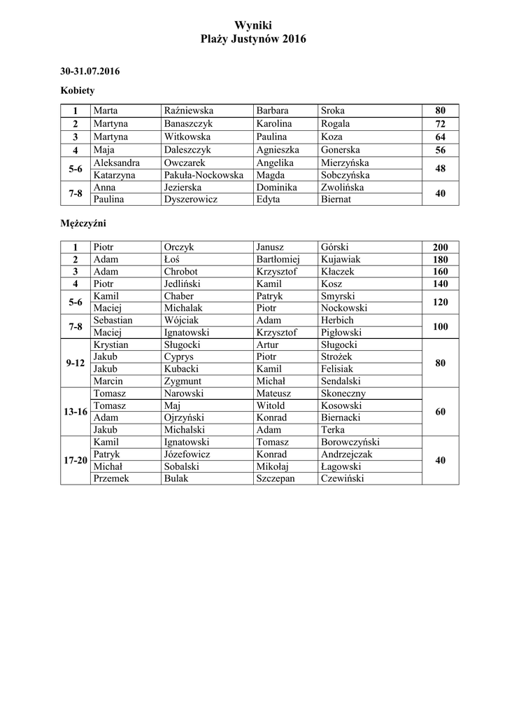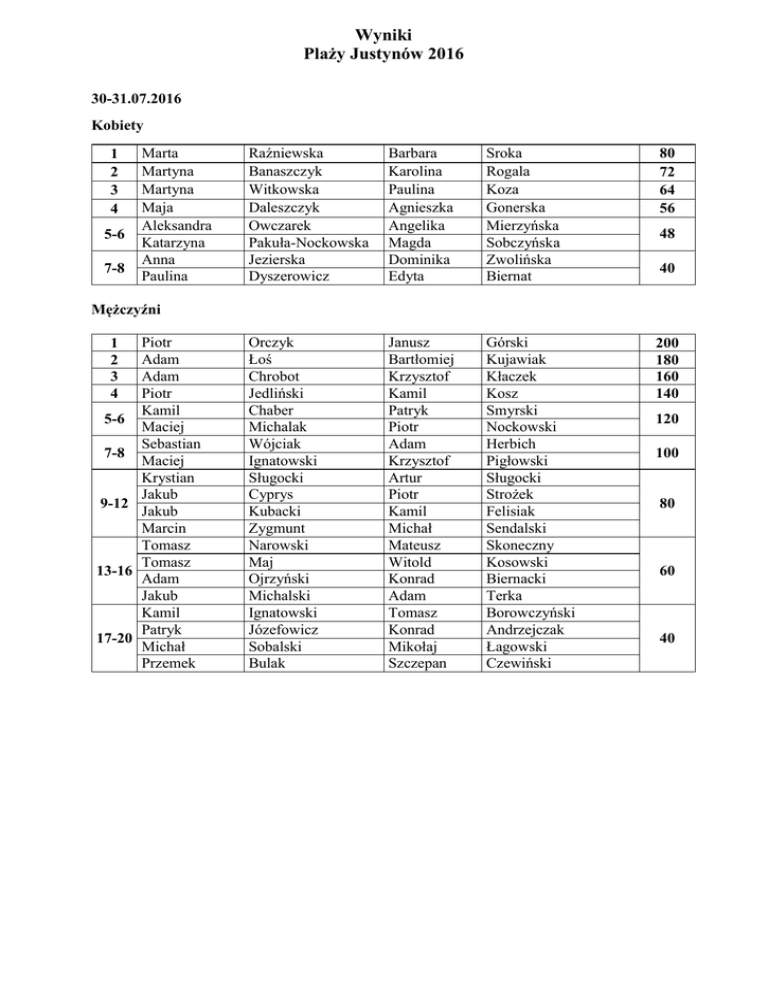 Wyniki Plaży Justynów 2016 30-31.07.2016 Kobiety 1 2 3 4 5-6 7-8 Marta Martyna Martyna Maja Aleksandra Katarzyna Anna Paulina Raźniewska Banaszczyk Witkowska Daleszczyk Owczarek Pakuła-Nockowska Jezierska Dyszerowicz Barbara Karolina Paulina Agnieszka Angelika Magda Dominika Edyta Sroka Rogala Koza Gonerska Mierzyńska Sobczyńska Zwolińska Biernat 80 72 64 56 Orczyk Łoś Chrobot Jedliński Chaber Michalak Wójciak Ignatowski Sługocki Cyprys Kubacki Zygmunt Narowski Maj Ojrzyński Michalski Ignatowski Józefowicz Sobalski Bulak Janusz Bartłomiej Krzysztof Kamil Patryk Piotr Adam Krzysztof Artur Piotr Kamil Michał Mateusz Witold Konrad Adam Tomasz Konrad Mikołaj Szczepan Górski Kujawiak Kłaczek Kosz Smyrski Nockowski Herbich Pigłowski Sługocki Strożek Felisiak Sendalski Skoneczny Kosowski Biernacki Terka Borowczyński Andrzejczak Łagowski Czewiński 200 180 160 140 48 40 Mężczyźni Piotr Adam Adam Piotr Kamil 5-6 Maciej Sebastian 7-8 Maciej Krystian Jakub 9-12 Jakub Marcin Tomasz Tomasz 13-16 Adam Jakub Kamil Patryk 17-20 Michał Przemek 1 2 3 4 120 100 80 60 40
