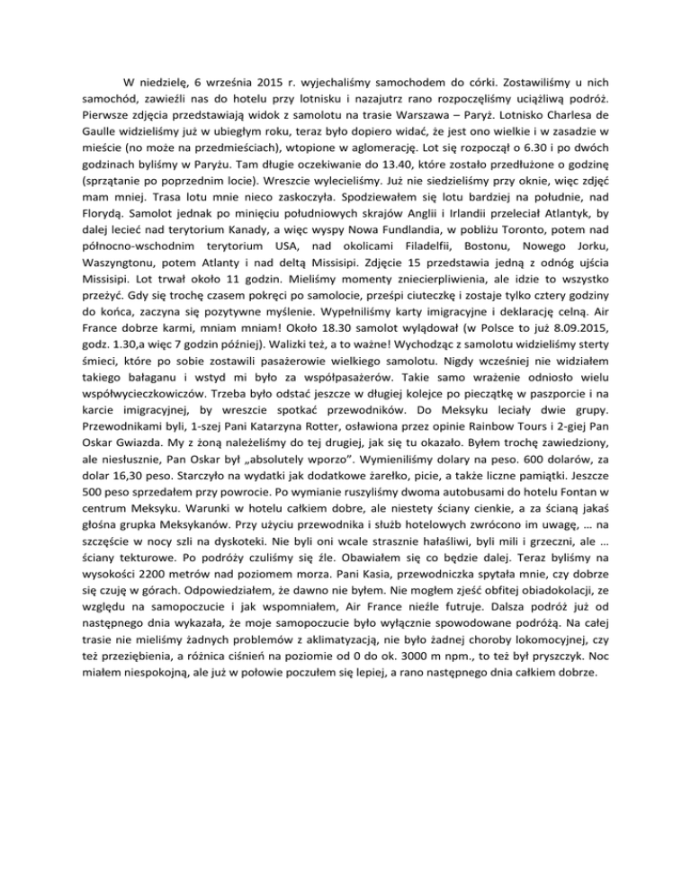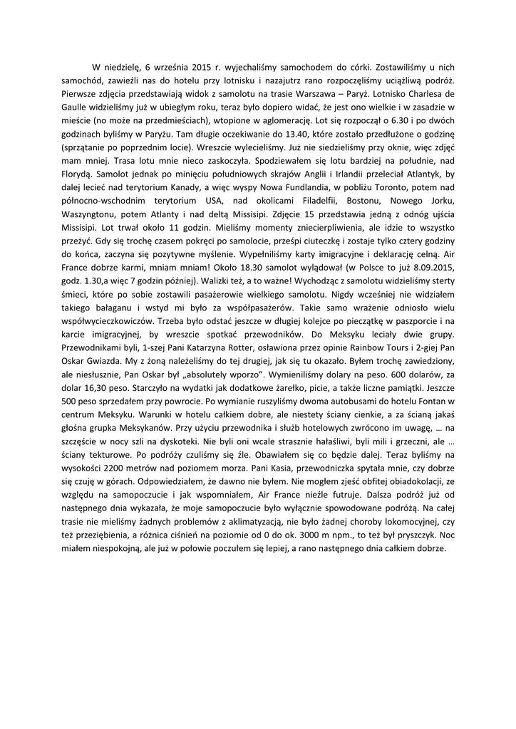 W niedzielę, 6 września 2015 r. wyjechaliśmy samochodem do córki. Zostawiliśmy u nich samochód, zawieźli nas do hotelu przy lotnisku i nazajutrz rano rozpoczęliśmy uciążliwą podróż. Pierwsze zdjęcia przedstawiają widok z samolotu na trasie Warszawa – Paryż. Lotnisko Charlesa de Gaulle widzieliśmy już w ubiegłym roku, teraz było dopiero widać, że jest ono wielkie i w zasadzie w mieście (no może na przedmieściach), wtopione w aglomerację. Lot się rozpoczął o 6.30 i po dwóch godzinach byliśmy w Paryżu. Tam długie oczekiwanie do 13.40, które zostało przedłużone o godzinę (sprzątanie po poprzednim locie). Wreszcie wylecieliśmy. Już nie siedzieliśmy przy oknie, więc zdjęć mam mniej. Trasa lotu mnie nieco zaskoczyła. Spodziewałem się lotu bardziej na południe, nad Florydą. Samolot jednak po minięciu południowych skrajów Anglii i Irlandii przeleciał Atlantyk, by dalej lecieć nad terytorium Kanady, a więc wyspy Nowa Fundlandia, w pobliżu Toronto, potem nad północno-wschodnim terytorium USA, nad okolicami Filadelfii, Bostonu, Nowego Jorku, Waszyngtonu, potem Atlanty i nad deltą Missisipi. Zdjęcie 15 przedstawia jedną z odnóg ujścia Missisipi. Lot trwał około 11 godzin. Mieliśmy momenty zniecierpliwienia, ale idzie to wszystko przeżyć. Gdy się trochę czasem pokręci po samolocie, prześpi ciuteczkę i zostaje tylko cztery godziny do końca, zaczyna się pozytywne myślenie. Wypełniliśmy karty imigracyjne i deklarację celną. Air France dobrze karmi, mniam mniam! Około 18.30 samolot wylądował (w Polsce to już 8.09.2015, godz. 1.30,a więc 7 godzin później). Walizki też, a to ważne! Wychodząc z samolotu widzieliśmy sterty śmieci, które po sobie zostawili pasażerowie wielkiego samolotu. Nigdy wcześniej nie widziałem takiego bałaganu i wstyd mi było za współpasażerów. Takie samo wrażenie odniosło wielu współwycieczkowiczów. Trzeba było odstać jeszcze w długiej kolejce po pieczątkę w paszporcie i na karcie imigracyjnej, by wreszcie spotkać przewodników. Do Meksyku leciały dwie grupy. Przewodnikami byli, 1-szej Pani Katarzyna Rotter, osławiona przez opinie Rainbow Tours i 2-giej Pan Oskar Gwiazda. My z żoną należeliśmy do tej drugiej, jak się tu okazało. Byłem trochę zawiedziony, ale niesłusznie, Pan Oskar był „absolutely wporzo”. Wymieniliśmy dolary na peso. 600 dolarów, za dolar 16,30 peso. Starczyło na wydatki jak dodatkowe żarełko, picie, a także liczne pamiątki. Jeszcze 500 peso sprzedałem przy powrocie. Po wymianie ruszyliśmy dwoma autobusami do hotelu Fontan w centrum Meksyku. Warunki w hotelu całkiem dobre, ale niestety ściany cienkie, a za ścianą jakaś głośna grupka Meksykanów. Przy użyciu przewodnika i służb hotelowych zwrócono im uwagę, … na szczęście w nocy szli na dyskoteki. Nie byli oni wcale strasznie hałaśliwi, byli mili i grzeczni, ale … ściany tekturowe. Po podróży czuliśmy się źle. Obawiałem się co będzie dalej. Teraz byliśmy na wysokości 2200 metrów nad poziomem morza. Pani Kasia, przewodniczka spytała mnie, czy dobrze się czuję w górach. Odpowiedziałem, że dawno nie byłem. Nie mogłem zjeść obfitej obiadokolacji, ze względu na samopoczucie i jak wspomniałem, Air France nieźle futruje. Dalsza podróż już od następnego dnia wykazała, że moje samopoczucie było wyłącznie spowodowane podróżą. Na całej trasie nie mieliśmy żadnych problemów z aklimatyzacją, nie było żadnej choroby lokomocyjnej, czy też przeziębienia, a różnica ciśnień na poziomie od 0 do ok. 3000 m npm., to też był pryszczyk. Noc miałem niespokojną, ale już w połowie poczułem się lepiej, a rano następnego dnia całkiem dobrze.