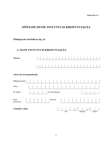 Załącznik nr 2 OŚWIADCZENIE INSTYTUCJI KREDYTUJĄCEJ Niniejszym oświadcza się, Ŝe A. DANE INSTYTUCJI KREDYTUJĄCEJ Nazwa Adres do korespondencji: Miejscowość Ulica Nr domu Kod pocztowy Nr mieszkania - Poczta Udzielił w dniu rok 1 miesiąc dzień Panu/ Pani B. DANE OSOBY, KTÓRA UZYSKAŁA KREDYT Nazwisko Imię (imiona) Obywatelstwo zamieszkałemu/ej ADRES MIEJSCA ZAMIESZKANIA Miejscowość Ulica Nr domu Nr mieszkania Kod pocztowy - Poczta legitymującej/mu się DOWODEM OSOBISTYM LUB INNYM DOKUMENTEM POTWIERDZAJĄCYM TOśSAMOŚĆ Rodzaj dokumentu Numer Data wydania rok miesiąc Data upływu waŜności dzień 2 rok miesiąc dzień Wydany przez Nr PESEL1) Nr umowy kredytu mieszkaniowego Kredytu mieszkaniowego w rozumieniu art. 2 ust. 2-3 ustawy z dnia ……….… 2009 r. o pomocy państwa w spłacie niektórych kredytów mieszkaniowych udzielonych osobom, które utraciły pracę (Dz. U. Nr …..….). Kredyt spłacany jest w walucie2) Kredytu udzielono na3): 1. Budowę domu jednorodzinnego 2. Nabycie prawa własności domu jednorodzinnego 3. Nabycie odrębnej własności lokalu mieszkalnego w budynku wielorodzinnym 4. Nabycie spółdzielczego własnościowego prawa do lokalu mieszkalnego 5. Nabycie odrębnej własności lokalu mieszkalnego w spółdzielni mieszkaniowej 6. Spłatę kredytu określonego w poz. 1-5 7. Spłatę róŜnych zobowiązań kredytowych, w tym kredytu określonego w poz. 15 Spłata kredytu została zabezpieczona hipoteką ustanowioną na przedmiocie kredytowania. Raty pomocy, w rozumieniu art. 5 ustawy z dnia ……… 2009 roku o pomocy państwa w spłacie niektórych kredytów mieszkaniowych udzielonych osobom, które utraciły pracę (Dz. U. ……....), powinny być przekazywane na rachunek nr: - - - 4) Na dzień wydania niniejszego oświadczenia : 1) 2) 3 Wypełnia osoba posiadająca nr PESEL NaleŜy podać symbol waluty (PLN, CHF, EUR, USD, JPY, GBP) NaleŜy zaznaczyć znakiem X odpowiedni prostokąt w 3 kolumnie tabeli 3 - • terminy płatności kolejnych 12-tu niewymagalnych miesięcznych rat kapitałowych i odsetkowych oraz ich wysokość wynoszą: • terminy płatności kolejnych 12-tu niewymagalnych miesięcznych rat kapitałowych i odsetkowych rozpoczynające się od miesiąca następującego po upływie wypłaty świadczenia z tytułu umowy ubezpieczenia w rozumieniu art. 6 ust. 2 pkt 2 lit. b ustawy z dnia … 2009 roku o pomocy państwa w spłacie niektórych kredytów mieszkaniowych udzielonych osobom, które utraciły pracę (Dz. U. Nr ….) oraz ich wysokość wynoszą : Lp Data płatności Wysokość w złotych rat5) kapitałowych i odsetkowych 1. 2. 3. 4. 5. 6. 7. 8. 9. 10. 11. 12. RAZEM Data i podpisy osób upowaŜnianych rok 4) Niepotrzebne skreślić 5) w przypadku kredytów indeksowanych i walutowych przy przeliczeniu na złote stosuje się kurs średni ogłoszony przez Narodowy Bank Polski w dniu wymagalności ostatniej raty kredytu mieszkaniowego 4 miesiąc dzień