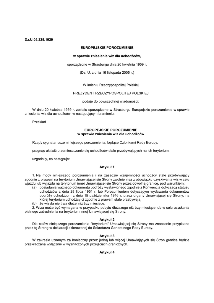 Dz.U.05.225.1929 EUROPEJSKIE POROZUMIENIE w sprawie zniesienia wiz dla uchodźców, sporządzone w Strasburgu dnia 20 kwietnia 1959 r. (Dz. U. z dnia 16 listopada 2005 r.) W imieniu Rzeczypospolitej Polskiej PREZYDENT RZECZYPOSPOLITEJ POLSKIEJ podaje do powszechnej wiadomości: W dniu 20 kwietnia 1959 r. zostało sporządzone w Strasburgu Europejskie porozumienie w sprawie zniesienia wiz dla uchodźców, w następującym brzmieniu: Przekład EUROPEJSKIE POROZUMIENIE w sprawie zniesienia wiz dla uchodźców Rządy sygnatariusze niniejszego porozumienia, będące Członkami Rady Europy, pragnąc ułatwić przemieszczanie się uchodźców stale przebywających na ich terytorium, uzgodniły, co następuje: Artykuł 1 1. Na mocy niniejszego porozumienia i na zasadzie wzajemności uchodźcy stale przebywający zgodnie z prawem na terytorium Umawiającej się Strony zwolnieni są z obowiązku uzyskiwania wiz w celu wjazdu lub wyjazdu na terytorium innej Umawiającej się Strony przez dowolną granicę, pod warunkiem: (a) posiadania ważnego dokumentu podróży wystawionego zgodnie z Konwencją dotyczącą statusu uchodźców z dnia 28 lipca 1951 r. lub Porozumieniem dotyczącym wydawania dokumentów podróży uchodźcom z dnia 15 października 1946 r. przez organy Umawiającej się Strony, na której terytorium uchodźcy ci zgodnie z prawem stale przebywają, (b) że wizyta nie trwa dłużej niż trzy miesiące. 2. Wiza może być wymagana w przypadku pobytu dłuższego niż trzy miesiące lub w celu uzyskania płatnego zatrudnienia na terytorium innej Umawiającej się Strony. Artykuł 2 Dla celów niniejszego porozumienia "terytorium" Umawiającej się Strony ma znaczenie przypisane przez tę Stronę w deklaracji skierowanej do Sekretarza Generalnego Rady Europy. Artykuł 3 W zakresie uznanym za konieczny przez jedną lub więcej Umawiających się Stron granica będzie przekraczana wyłącznie w wyznaczonych przejściach granicznych. Artykuł 4 1. Postanowienia niniejszego porozumienia nie ograniczają przepisów prawa dotyczących wizyt obcokrajowców na terytorium innej Umawiającej się Strony. 2. Każda Umawiająca się Strona zastrzega sobie prawo zakazu wjazdu lub pobytu na swoim terytorium osobom uznanym za niepożądane. Artykuł 5 Uchodźcy, którzy na mocy niniejszego porozumienia znaleźli się na terytorium Umawiającej się Strony, zostaną w dowolnym czasie ponownie wpuszczeni na terytorium Umawiającej się Strony, której organy wydały dokument podróży, na zwykłe żądanie Strony, o której mowa na wstępie, z wyjątkiem sytuacji, kiedy Strona ta zezwoliła zainteresowanym osobom na osiedlenie się na swoim terytorium. Artykuł 6 Niniejsze porozumienie nie ogranicza pozostających w mocy lub mogących wejść w życie przepisów prawa wewnętrznego ani dwustronnych lub wielostronnych traktatów, konwencji ani porozumień, na podstawie których do uchodźców legalnie stale przebywających na terytorium Umawiającej się Strony stosuje się łagodniejsze warunki przekraczania granic. Artykuł 7 1. Każda Umawiająca się Strona zastrzega sobie dla potrzeb porządku publicznego, bezpieczeństwa lub zdrowia publicznego możliwość opóźnienia wejścia w życie niniejszego porozumienia lub zarządzenia czasowego zawieszenia jego stosowania w stosunku do wszystkich lub niektórych pozostałych Stron, z wyjątkiem postanowień artykułu 5. Sekretarz Generalny Rady Europy zostanie niezwłocznie poinformowany o podjęciu takich środków oraz o ich zniesieniu. 2. Umawiająca się Strona, która skorzysta z możliwości przewidzianej w poprzedzającym ustępie, nie może domagać się stosowania niniejszego porozumienia przez inną ze Stron, z wyjątkiem zakresu, w jakim sama je stosuje w odniesieniu do tej Strony. Artykuł 8 Niniejsze porozumienie będzie otwarte do podpisu przez Członków Rady Europy, którzy mogą stać się Stronami porozumienia poprzez: (a) podpisanie bez zastrzeżenia ratyfikacji albo (b) podpisanie z zastrzeżeniem ratyfikacji, po którym nastąpi ratyfikacja. Dokumenty ratyfikacyjne zostaną złożone u Sekretarza Generalnego Rady Europy. Artykuł 9 1. Niniejsze porozumienie wchodzi w życie jeden miesiąc po dniu, w którym trzech Członków Rady Europy zgodnie z artykułem 8 podpisze porozumienie bez zastrzeżenia ratyfikacji lub ratyfikuje porozumienie. 2. W przypadku Członka Rady Europy, który w terminie późniejszym podpisze porozumienie bez zastrzeżenia ratyfikacji lub je ratyfikuje, porozumienie wejdzie w życie jeden miesiąc od dnia, w którym zostało podpisane lub dnia, w którym został złożony dokument ratyfikacyjny. Artykuł 10 Po wejściu w życie niniejszego porozumienia Komitet Ministrów Rady Europy może jednogłośnie zaprosić Rząd niebędący Członkiem Rady, będący natomiast stroną Konwencji dotyczącej statusu uchodźców z dnia 28 lipca 1951 r. lub Porozumienia dotyczącego wydawania dokumentów podróży uchodźcom z dnia 15 października 1946 r., do przystąpienia do niniejszego porozumienia. Takie przystąpienie nabierze mocy jeden miesiąc od dnia złożenia dokumentu przystąpienia u Sekretarza Generalnego Rady Europy. Artykuł 11 Sekretarz Generalny Rady Europy zawiadomi Państwa Członkowskie Rady i Państwa przystępujące do niniejszego porozumienia: (a) o każdym podpisaniu z zastrzeżeniem ratyfikacji, o złożeniu każdego dokumentu ratyfikacyjnego i o dniu wejścia porozumienia w życie, (b) o złożeniu każdego dokumentu przystąpienia zgodnie z artykułem 10, (c) o każdym zawiadomieniu lub deklaracji otrzymanych zgodnie z artykułami 2, 7 i 12, a także o dniu, w którym nabierają one mocy. Artykuł 12 Każda Umawiająca się Strona może wypowiedzieć stosowanie niniejszego porozumienia poprzez zawiadomienie o tym, z trzymiesięcznym wyprzedzeniem, Sekretarza Generalnego Rady Europy. NA DOWÓD CZEGO, niżej podpisani, należycie w tym celu upoważnieni, podpisali niniejsze porozumienie. SPORZĄDZONO 