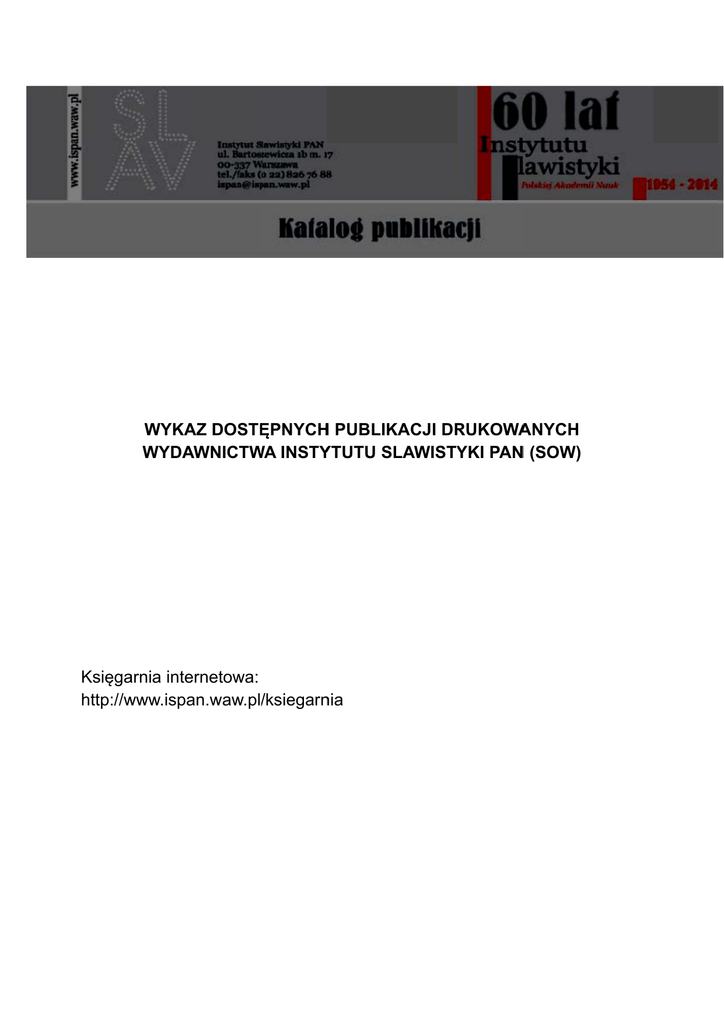 WYKA AZ DOSTĘ ĘPNYCH H PUBLIK KACJI DR RUKOWA ANYCH WYDAW WNICTW WA INSTY YTUTU SLAWISTY YKI PAN N (SOW) arnia interrnetowa: Księga http://w www.ispan.waw.pl//ksiegarn nia NOWOŚCI (opublikowane w latach 2014/2015 w kolejności ukazywania się) Atlas gwar wschodniosłowiańskich Białostocczyzny, Tom. I, red. St. Glinka, A. ObrębskaJabłońska i J. Siatkowski, (reedycja) 2014 M. Trawińska, Rękopis najstarszej poznańskiej księgi ziemskiej (1386-1400). Wokół analizy filologicznej, Warszawa-Poznań (wyd. Rys) 2014 H. Popowska-Taborska, Wczesne dzieje Słowian w świetle ich języka, wyd. 3, popr. i uzup., 2014 Konstrukcje i destrukcje tożsamości, t. 3: Narracja i pamięć, red. E. Golachowska i A. Zielińska, 2014 J. Roszak, Miejsce i imię. Niemieckojęzyczni poeci pochodzenia żydowskiego, 2014 I. Maryniakowa, D. K. Rembiszewska, J. Siatkowski, Różnojęzyczne słownictwo gwarowe Podlasia, Suwalszczyzny i północno-wschodniego Mazowsza, 2014 Studia Borysiana. Etymologica, diachronica, slavica. W 75. rocznicę urodzin profesora Wiesława Borysia, red. M. Jakubowicz i B. Raszewska-Żurek, 2014 R. Kaleta, Białorusko-polska homonimia międzyjęzykowa, 2014 J. Satoła-Staśkowiak, V. Koseska-Toszewa, przy współpracy L. Dimitrovej, Współczesny słownik bułgarsko-polski, zeszyt 1, 2014 R. Grzesik, Hungaria – Slavia – Europa Centralis. Studia z dziejów kultury środkowoeuropejskiej we wczesnym średniowieczu, (Kultura na Pograniczach 9) 2014 Andrzej Wędzki, Miechów w średniowieczu. Studia z dziejów miasta i klasztoru. Zagadka Jaksy, 2014 W krainie wielu tradycji. Badania etnograficzne na pograniczu polsko-litewsko-białoruskim w XX i początkach XXI wieku, red. K. Snarski i A. Żulpa, Warszawa-Suwałki (Muzeum Okręgowe w Suwałkach) 2014 D. Roszko, Zagadnienia kwantyfikacyjne i modalne w litewskiej gwarze puńskiej (na tle literackich języków polskiego i litewskiego), 2015 J. Roszak, Słyszysz? Synagoga. Wychodząc spod poznańskiej synagogi przy Wronieckiej, Lublin (Ośrodek „Brama Grodzka – Teatr N.N.”)-Warszawa 2015 L. A. Jankowiak, Synonimia w polskiej terminologii medycznej drugiej połowy XIX wieku (na podstawie „Słownika terminologii lekarskiej polskiej” z 1881 roku), (Prace Slawistyczne „Slavica” 138) 2015 J. Satoła-Staśkowiak, Najmłodsza leksyka polska i bułgarska, 2015 PERIODYKI (Od 2014 roku dostępne wyłącznie w wersji elektronicznej na Platformie Czasopism IS PAN (ISS PAS Journals http://ispan.waw.pl/journals) w tzw. otwartym dostępie Acta Baltico-Slavica t. 21, 1994; t. 22, 1996; t. 23, 1997; t. 24, 1999; t. 25, 2000; t. 27, 2003; t. 28, 2004; t. 29, 2005; t. 30, 2006; t. 31, 2007; t. 32, 2008; t. 33, 2009; t. 34, 2010; t. 35, 2011; t. 36, 2012; t. 37, 2013. Cognitive Studies | Études cognitives t. 2, 1997; t. 3, 1999; t. 4, 2001; t. 5, 2003; t. 6, 2004; t. 7, 2006; t. 8, 2007; t. 9, 2009; t. 10, 2010; t. 11, 2011; t. 12, 2012; t. 13, 2013. Colloquia Humanistica t. 1, 2012; t. 2, 2013. Slavia Meridionalis t. 1, 1994; t. 2, 1999; t. 3, 2000; t. 4, 2004; t. 5, 2005; t. 6, 2006; t. 7, 2007; t. 8, 2008; t. 9, 2009; t. 10, 2010; t. 11, 2011; t. 12, 2012; t. 13, 2013. Sprawy Narodowościowe. Seria Nowa t. 16-17, 2000; t. 18, 2001; t. 20 i 21, 2002; t. 22 i 23, 2003; t. 24-25, 2004; t. 26 i 27, 2005; t. 28 i 29, 2006; t. 30 i 31, 2007; t. 32 i 33, 2008; t. 34 i 35, 2009; t. 36 i 37, 2010; t. 39, 2011; t. 40 i 41, 2012; t. 42 i 43, 2013. Studia Litteraria Polono-Slavica t. 1, 1993; t. 3, 1999; t. 4, 1999; t. 5, 2000; t. 7, 2002; t. 8, 2008. Studia z Filologii Polskiej i Słowiańskiej t. 31, 1993; t. 32, 1995; t. 34, 1998; t. 35, 1999; t. 36, 2000; t. 38, 2003; t. 39, 2004; t. 40, 2005; t. 41, 2006; t. 42, 2007; t. 43, 2008; t. 44, 2009; t. 45, 2010; t. 46, 2011; t. 47, 2012, t. 48, 2013. SERIE WYDAWNICZE Język na Pograniczach Słowiańskie pogranicza językowe, red. K. Handke, (1) 1992 Studies in the Phonetic Typology of the Slavic Languages, red. i. Sawicka, a. Holvoet, (2) 1991 E. Rzetelska-Feleszko, J. Duma, Dawne słowiańskie nazwy miejscowe Pomorza Szczecińskiego, (3) 1991 Studia z dialektologii polskiej i słowiańskiej, red. W. Boryś, W. Sędzik, (4) 1992 R. Roszko, Wykładniki modalności imperceptywnej w języku polskim i litewskim, (7) 1993 E. Wolnicz-Pawłowska, Antroponimia łemkowska na tle polskim i słowackim (XVI–XIX wiek), (9) 1993 E. Kędelska, Studia nad łacińsko-polską leksykografią drugiej połowy XVI wieku, (12) 1995 K. Handke, Polski język familijny, (13) 1995 Z historii języków łużyckich, red. H. Faßke i E. Wrocławska, (18) 1996 Obraz językowy słowiańskiego Pomorza i Łużyc. Pogranicza i kontakty językowe, red. J. Zieniukowa, (19) 1997 L. A. Jankowiak, Prasłowiańskie dziedzictwo leksykalne we współczesnej polszczyźnie ogólnej, (20) 1997 I. Grek-Pabisowa, Współczesne gwary polskie na Litwie i Białorusi. Fonetyka, (23) 2002 R. Roszko, Semantyczna kategoria określoności/nieokreśloności w języku litewskim, (25) 2004 L. A. Jankowiak, Słownictwo medyczne Stefana Falimirza. Studium początków polskiej renesansowej terminologii medycznej, t. 1, (27) 2005 D. Roszko, Funkcjonalne odpowiedniki litewskiego perfectum w litewskiej gwarze puńskiej i w języku polskim, (29) 2006 D. Rembiszewska, Dynamika rozwoju gwary Knyszyna i okolic na Podlasiu w XX wieku, (30) 2006 L. A. Jankowiak, Słownictwo medyczne Stefana Falimirza. Studium początków polskiej renesansowej terminologii medycznej, t. 2, Słownik, (31) 2006 K. Pastusiak, Pogranicze polsko-białorusko-ukraińskie w świetle danych językowych i etnograficznych na podstawie nazw roślin, (32) 2007 I. Grek-Pabisowa, M. Ostrówka, B. Biesiadowska-Magdziarz, Język polski na Białorusi Radzieckiej w okresie międzywojennym. Polszczyzna mówiona, (33) 2008 E. Rzetelska-Feleszko, J. Duma, Nazwy terenowe Pomorza Zachodniego zawierające elementy słowiańskie, t. 1: A–O, (34) 2008 I. Grek-Pabisowa, M. Ostrówka, B. Biesiadowska-Magdziarz