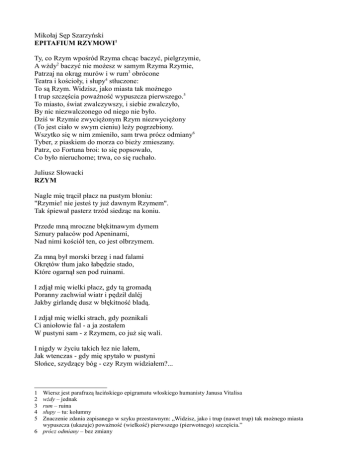 Mikołaj Sęp Szarzyński EPITAFIUM RZYMOWI1 Ty, co Rzym wpośród Rzyma chcąc baczyć, pielgrzymie, A wżdy2 baczyć nie możesz w samym Rzyma Rzymie, Patrzaj na okrąg murów i w rum3 obrócone Teatra i kościoły, i słupy4 stłuczone: To są Rzym. Widzisz, jako miasta tak możnego I trup szczęścia poważność wypuszcza pierwszego.5 To miasto, świat zwalczywszy, i siebie zwalczyło, By nic niezwalczonego od niego nie było. Dziś w Rzymie zwyciężonym Rzym niezwyciężony (To jest ciało w swym cieniu) leży pogrzebiony. Wszytko się w nim zmieniło, sam trwa prócz odmiany6 Tyber, z piaskiem do morza co bieży zmieszany. Patrz, co Fortuna broi: to się popsowało, Co było nieruchome; trwa, co się ruchało. Juliusz Słowacki RZYM Nagle mię trącił płacz na pustym błoniu: "Rzymie! nie jesteś ty już dawnym Rzymem". Tak śpiewał pasterz trzód siedząc na koniu. Przede mną mroczne błękitnawym dymem Sznury pałaców pod Apeninami, Nad nimi kościół ten, co jest olbrzymem. Za mną był morski brzeg i nad falami Okrętów tłum jako łabędzie stado, Które ogarnął sen pod ruinami. I zdjął mię wielki płacz, gdy tą gromadą Poranny zachwiał wiatr i pędził daléj Jakby girlandę dusz w błękitność bladą. I zdjął mię wielki strach, gdy poznikali Ci aniołowie fal - a ja zostałem W pustyni sam - z Rzymem, co już się wali. I nigdy w życiu takich łez nie lałem, Jak wtenczas - gdy mię spytało w pustyni Słońce, szydzący bóg - czy Rzym widziałem?... 1 2 3 4 5 Wiersz jest parafrazą łacińskiego epigramatu włoskiego humanisty Janusa Vitalisa wżdy – jednak rum – ruina słupy – tu: kolumny Znaczenie zdania zapisanego w szyku przestawnym: „Widzisz, jako i trup (nawet trup) tak możnego miasta wypuszcza (ukazuje) poważność (wielkość) pierwszego (pierwotnego) szczęścia.” 6 prócz odmiany – bez zmiany