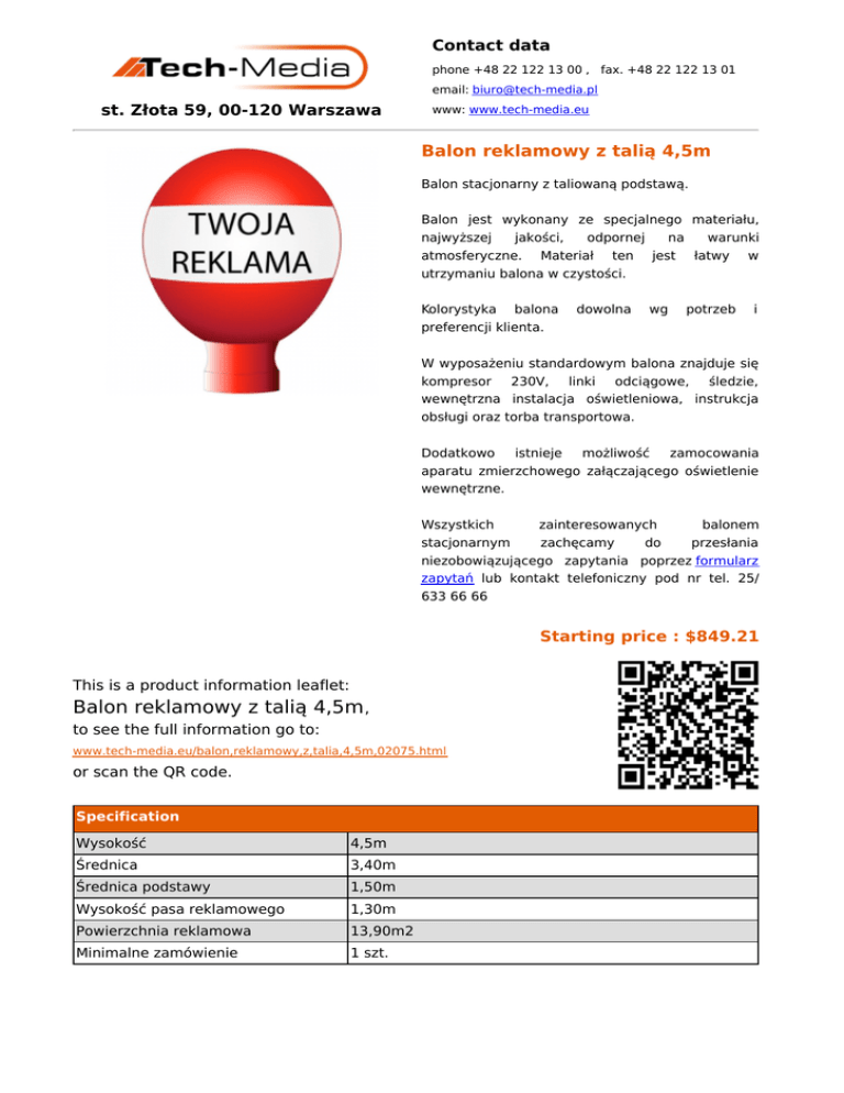Contact data phone +48 22 122 13 00 , fax. +48 22 122 13 01 email: [email protected] st. Złota 59, 00-120 Warszawa www: www.tech-media.eu Balon reklamowy z talią 4,5m Balon stacjonarny z taliowaną podstawą. Balon jest wykonany ze specjalnego materiału, najwyższej jakości, odpornej na warunki atmosferyczne. Materiał ten jest łatwy w utrzymaniu balona w czystości. Kolorystyka balona preferencji klienta. dowolna wg potrzeb i W wyposażeniu standardowym balona znajduje się kompresor 230V, linki odciągowe, śledzie, wewnętrzna instalacja oświetleniowa, instrukcja obsługi oraz torba transportowa. Dodatkowo istnieje możliwość zamocowania aparatu zmierzchowego załączającego oświetlenie wewnętrzne. Wszystkich zainteresowanych balonem stacjonarnym zachęcamy do przesłania niezobowiązującego zapytania poprzez formularz zapytań lub kontakt telefoniczny pod nr tel. 25/ 633 66 66 Starting price : $849.21 This is a product information leaflet: Balon reklamowy z talią 4,5m , to see the full information go to: www.tech-media.eu/balon,reklamowy,z,talia,4,5m,02075.html or scan the QR code. Specification Wysokość 4,5m Średnica 3,40m Średnica podstawy 1,50m Wysokość pasa reklamowego 1,30m Powierzchnia reklamowa 13,90m2 Minimalne zamówienie 1 szt.