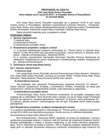 PROTOKÓŁ Nr XXV/14 XXV sesji Rady Gminy Pszczółki, która odbyła się 21 stycznia 2014 r. w Urzędzie Gminy w Pszczółkach, na wniosek Wójta. XXV sesja Rady Gminy Pszczółki rozpoczęła się o godzinie 14:00 w sali narad Urzędu Gminy w Pszczółkach. Obradom przewodniczył p.Roman Klamann - Przewodniczący Rady Gminy, przy udziale Wiceprzewodniczącego p.Zygmunta Łysika. Protokółowała: Dorota Gromadzka - Kierownik Urzędu Stanu Cywilnego i obsługa Rady Gminy. Radni otrzymali materiały wraz z projektami uchwał. PORZĄDEK OBRAD: 1. Sprawy regulaminowe: 1) otwarcie sesji, 2) stwierdzenie kworum, 3) zatwierdzenie porządku obrad. 2. Rozpatrzenie projektów i podjęcie uchwał: 1) w sprawie wieloletniego programu osłonowego pn. ”Pomoc gminy w zakresie dożywiania” na lata 2014-2020 oraz warunków przyznania i zwrotu pomocy w zakresie dożywiania - referuje p.B.Nowakowska - Kierownik GOPS, 2) w sprawie upoważnienia Kierownika Gminnego Ośrodka Pomocy Społecznej do załatwiania indywidualnych spraw dotyczących zryczałtowanego dodatku energetycznego - referuje p.B.Nowakowska. 3. Zamknięcie obrad sesji Rady Gminy. Ad 1. Sprawy regulaminowe: 1) otwarcie sesji XXV sesję Rady Gminy Pszczółki otworzył Przewodniczący Rady słowami: „Otwieram XXV sesję Rady Gminy Pszczółki, zwołaną na wniosek Wójta”. Powitał Panią Wójt, Panią Sekretarz, Panią Skarbnik, Panią Kierownik GOPS oraz radnych. 2) stwierdzenie kworum Na podstawie listy obecności Przewodniczący stwierdził obecność 12 radnych trzech radnych nieobecnych (K.Sądej, J.Juchniewicz, W.Rek). Powiedział, że sesja jest prawomocna i zdolna do podejmowania uchwał. Lista obecności w załączeniu. 3) zatwierdzenie porządku obrad Przewodniczący Rady Gminy R.Klamann powiedział, że porządek dzisiejszej sesji znajduje się w materiałach, które otrzymali radni i zapytał, czy są do niego uwagi? Ponieważ żadnych nie zgłoszono, zarządził głosowanie. Obecnych 12 radnych, wynik głosowania: ZA 12 radnych, głosów przeciw i wstrzymujących się nie było. Porządek obrad został przyjęty jednogłośnie. Ad.2 Rozpatrzenie projektów i podjęcie następujących uchwał: 1) w sprawie wieloletniego programu osłonowego pn. ”Pomoc gminy w zakresie dożywiania” na lata 2014-2020 oraz warunków przyznania i zwrotu pomocy w zakresie dożywiania Na posiedzenie przybył radny Wojciech Rek. Pani B.Nowakowska - Kierownik GOPS, wyjaśniła, że prawo do świadczeń z pomocy społecznej przysługuje osobom i rodzinom, jeśli ich dochód nie przekracza kryterium dochodowego wynikającego z ustawy o pomocy społecznej, tj. dla osoby samotnie gospodarującej - 542 zł, natomiast na osobę w rodzinie - 456 zł. Rządowy program wspierania finansowego gmin w zakresie dożywiania dopuszcza możliwość podwyższenia tego kryterium do 1 150%, jeśli Rada Gminy podejmie w tej sprawie uchwałę. Uchwała umożliwi wystąpienie o środki dotacji na realizację tego rodzaju pomocy w zwiększonej kwocie. Rządowy program przewiduje także możliwość wsparcia dla gmin, które w szczególnie uzasadnionych przypadkach będą udzielały pomocy uczniom lub dzieciom, które wyrażą chęć zjedzenia posiłku. Wówczas dyrektor szkoły lub przedszkola informuje ośrodek pomocy społecznej o potrzebie udzielenia takiej pomocy, ale liczba tych dzieci nie może przekroczyć 20% liczby dzieci dożywianych na terenie gminy. Warunkiem przyznania tego rodzaju pomocy (bez wydawania decyzji i przeprowadzania wywiadu środowiskowego) jest przyjęcie przez gminę programu pomocowego. Dokument taki został opracowany i stanowi załącznik do niniejszej uchwały. Pani Wójt dodała, że informację o tym, iż do wystąpienia o środki dotacji w zwiększonej kwocie konieczne jest podjęcia uchwały, otrzymaliśmy od Wojewody Pomorskiego w dniu 14 stycznia br., a termin złożenia wniosku o dotację upływa 23 stycznia br. Radna U.Narożnik zapytała, ile dzieci w naszej gminie skorzystało w 2013 r. z dożywiania ? Pani B.Nowakowska odpowiedziała, że z programu pomocowego w zakresie dożywiania skorzystały 272 osoby, w tym w formie posiłku - 113 dzieci (96 dzieci na podstawie wydanej decyzji i 17 dzieci z list dyrektorów). Z zasiłku celowego skorzystało 228 osób, z tego 202 osoby spełniające kryterium do 100% i 26 osób spełniających kryterium do 150%. Radny Z.Łysik zapytał, jaka kwota została wydatkowana na dożywianie w ciągu minionego roku? Pani B.Nowakowska odpowiedziała, że wydatkowaliśmy 51.631 zł, w tym 36.630 zł ze środków dotacji i 15.001 zł środków własnych. Na posiłki wydaliśmy 25 tys. zł. Ponieważ do projektu uchwały nie było więcej pytań, Przewodniczący Rady R.Klamann zarządził głosowanie. Obecnych na sesji 13 radnych, ustawowy skład Rady Gminy - 15 radnych. Wynik głosowania: ZA - 13 radnych, głosów przeciw i wstrzymujących się - nie było. Uchwała Nr XXV/273/14 została podjęta jednogłośnie. 2) w sprawie upoważnienia Kierownika Gminnego Ośrodka Pomocy Społecznej do załatwiania indywidualnych spraw dotyczących zryczałtowanego dodatku energetycznego Pani B. Nowakowska wyjaśniła, że od 1 stycznia 2014 r. osobom, które otrzymują dodatek mieszkaniowy przysługuje zryczałtowany dodatek energetyczny. W związku z tym, że tutejszy Ośrodek Pomocy Społecznej realizuje zadania w zakresie przyznawania dodatków mieszkaniowych zasadnym jest upoważnienie kierownika GOPS do załatwiania spraw dotyczących zryczałtowanego dodatku energetycznego i wydawania decyzji w tej sprawie. Ponieważ do projektu uchwały nie było pytań, Przewodniczący Rady R.Klamann zarządził głosowanie. Obecnych na sesji 13 radnych, ustawowy skład Rady Gminy - 15 radnych. Wynik głosowania: ZA - 13 radnych, głosów przeciw i wstrzymujących się - nie było. Uchwała Nr XXII/238/13 została podjęta jednogłośnie. Ad.3 Zamknięcie obrad XXV sesji Rady Gminy. Przewodniczący Rady Gminy R.Klam