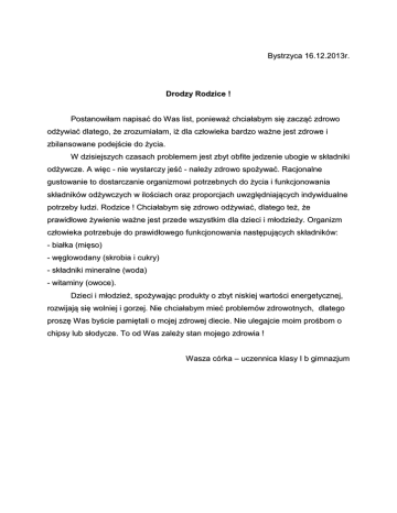 Bystrzyca 16.12.2013r. Drodzy Rodzice ! Postanowiłam napisać do W as list, ponieważ chciałabym się zacząć zdrowo odżywiać dlatego, że zrozumiałam, iż dla człowieka bardzo ważne jest zdrowe i zbilansowane podejście do życia. W dzisiejszych czasach problemem jest zbyt obfite jedzenie ubogie w składniki odżywcze. A więc - nie wystarczy jeść - należy zdrowo spożywać. Racjonalne gustowanie to dostarczanie organizmowi potrzebnych do życia i funkcjonowania składników odżywczych w ilościach oraz proporcjach uwzględniających indywidualne potrzeby ludzi. Rodzice ! Chciałabym się zdrowo odżywiać, dlatego też, że prawidłowe żywienie ważne jest przede wszystkim dla dzieci i młodzieży. Organizm człowieka potrzebuje do prawidłowego funkcjonowania następujących składników: - białka (mięso) - węglowodany (skrobia i cukry) - składniki mineralne (woda) - witaminy (owoce). Dzieci i młodzież, spożywając produkty o zbyt niskiej wartości energetycznej, rozwijają się wolniej i gorzej. Nie chciałabym mieć problemów zdrowotnych, dlatego proszę W as byście pamiętali o mojej zdrowej diecie. Nie ulegajcie moim prośbom o chipsy lub słodycze. To od Was zależy stan mojego zdrowia ! W asza córka – uczennica klasy I b gimnazjum