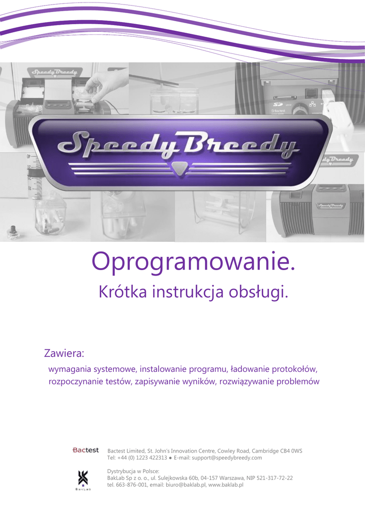 Oprogramowanie. Krótka instrukcja obsługi. Zawiera: wymagania systemowe, instalowanie programu, ładowanie protokołów, rozpoczynanie testów, zapisywanie wyników, rozwiązywanie problemów Bactest Limited, St. John’s Innovation Centre, Cowley Road, Cambridge CB4 0WS Tel: +44 (0) 1223 422313 ● E-mail: [email protected] Dystrybucja w Polsce: BakLab Sp z o. o., ul. Sulejkowska 60b, 04-157 Warszawa, NIP 521-317-72-22 tel. 663-876-001, email: [email protected], www.baklab.pl Spis treści Spis treści ....................................................................................................................................................... 2 1. Wymagania systemowe ................................................................................................................... 3 2. Instalowanie programu.................................................................................................................... 4 3. Dodawanie protokołów i kalibracji do programu ................................................................. 4 3.1 Dodawanie protokołów i kalibracji do programu .............................................................. 5 3.2 Podłączanie Speedy Breedy ....................................................................................................... 5 3.3 Dodawanie protokołów do urządzenia Speedy Breedy .................................................. 7 4. Rozpoczynanie testu ......................................................................................................................... 8 5. Zapisywanie wyników ....................................................................................................................... 9 6. Rozwiązywanie problemów .........................................................................................................10 2 1. Wymagania systemowe Aby zainstalować i używać programu Speedy Breedy, komputer musi spełniać następujące warunki:: Processor 1GHz 32-bit (x86) lub 64-bit (x64) Windows XP lub nowszy 1GB pamięci systemowej (RAM) Obsługa grafiki DirectX 9 5GB wolnej przestrzeni na dysku twardym Wejście USB 2.0 PDF reader – dla odczytu podręcznika obsługi Microsoft .Net Framework 4 (w razie potrzeby plik instalacyjny znajduje się na dostarczonej pamięci USB) Dostęp do internetu (tylko w przypadku korzystania z opcji powiadomień email) 3 2. Instalowanie programu Program Speedy Breedy znajduje się na pamięci USB dołączonej do pakietu Speedy Breedy. Aby zainstalować program należy podłączyć pamięć USB do komputera i postępować zgodnie z poniższą procedurą: Otworzyć dysk USB. Podwójnie kliknąć na plik SpeedyBreedy.exe file. Postępować zgodnie z instrukcjami na ekranie. Jeśli pojawia się jakiekolwiek trudności należy skontaktować się z Centrum Pomocy Twojego Rys. 1: Zakładki programu Speedy Breedy . systemu, aby sprawdzić czy system jest kompatybilny. W razie dalszych trudności prosimy o kontakt: [email protected] lub 663 876 001 Program Speedy Breedy utworzy skrót na pulpicie. 3. Dodawanie protokołów i kalibracji do programu Przed uruchomieniem jakiegokolwiek testu na urządzeniu Speedy Breedy konieczna jest instalacja plików z protokołami (pliki .sbx) oraz plików z kalibracjami (pliki .sbc) zarówno na komputerze jak i na samym urządzeniu. Instalacji tej dokonuje się jednokrotnie, w ramach ustawień początkowych. 4 3.1 Dodawanie protokołów i kalibracji do programu Predefiniowane protokoły i kalibracje dla najbardziej powszechnych mikroorganizmów dołączone są do pakietu Speedy Breedy na pamięci USB. Aby dodać je do programu należy: Otworzyć dysk USB. Otworzyć katalog „Protocols and Calibrations”. Skopiować wszystkie pliki znajdujące się w tym katalogu. Otworzyć C:/Bactest. Wkleić skopiowane pliki do katalogu Bactest i upewnić się, że pliki znajdują się w katalogu Bactest, a nie w jego podkatalogu. Protokoły i kalibracje powinny być widoczne po uruchomieniu programu (w zakładkach po lewej stronie) jak na rysunku 2. Rys. 2: Otwarte zakładki programu Speedy Breedy z „Protokołami” i „Kalibracjami”. 3.2 Podłączanie Speedy Breedy Urządzenie Speedy Breedy musi być podłączone jednocześnie do zasilania i do komputera. Po podłączeniu kablem USB do komputera urządzenie automatycznie pokaże się w oknie programu w sekcji „Devices” (urządzenia). 5 Rys. 3: Tył urządzenia Speedy Breedy z kablami i włożoną kartą SD. Firma Bactest regularnie aktualizuje oprogramowanie wewnętrzne urządzenia (hardware), oprogramowanie komputerowe (software), protokoły i krzywe kalibracji. Najnowszą wersję można pobrać z: http://www.speedybreedy.com/technical-support Do jednego komputera można podłączyć kilka urządzeń Speedy Breedy. Liczba podłączonych jednostek widoczna będzie w lewym dolnym rogu programu jak na rysunku 4. Rys. 4: Otwarte zakładki programu Speedy Breedy pokazujące liczbę podłączonych urządzeń Speedy Breedy (widoczne są również zakładki Protokołów, Kalibracji) 6 3.3 Dodawanie protokołów do urządzenia Speedy Breedy Po podłączeniu Speedy Breedy do komputera na urządzenie można przegrać protokoły i kalibracje, a następnie używać Speedy Breedy jako urządzenia samodzielnego (bez komputera). Otworzyć program Speedy Breedy. Rozwinąć sekcję „Protocols” (protokołów). Rozwinąć sekcję „Devices” (urządzeń). Przeciągnąć i upuścić potrzebne protokoły z części „Protocols” na swoje urządzenie, jak pokazano na rysunku 5. Do urządzenia nie dodaje się kalibracji. Rys. 5: Przenoszenie protokołów na urządzenie Speedy Breedy. 7 4. Rozpoczynanie testu Po przygotowaniu próbki i wstawieniu pojemnika do badania kultur do urządzenia Speedy Breedy (szczegółowy opis znajduje się w instrukcji „Przygotowanie próbek. Krótka instrukcja obsługi.”) można rozpocząć test przy pomocy przycisków znajdujących się na urządzeniu 