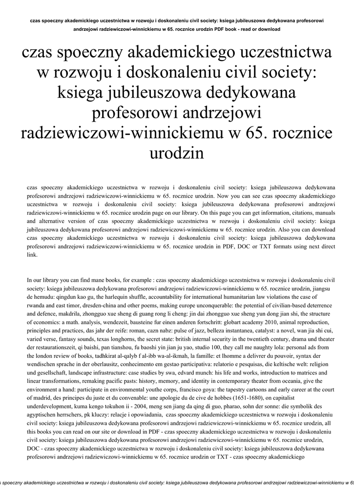 czas spoeczny akademickiego uczestnictwa w rozwoju i doskonaleniu civil society: ksiega jubileuszowa dedykowana profesorowi andrzejowi radziewiczowi-winnickiemu w 65. rocznice urodzin PDF book - read or download czas spoeczny akademickiego uczestnictwa w rozwoju i doskonaleniu civil society: ksiega jubileuszowa dedykowana profesorowi andrzejowi radziewiczowi-winnickiemu w 65. rocznice urodzin czas spoeczny akademickiego uczestnictwa w rozwoju i doskonaleniu civil society: ksiega jubileuszowa dedykowana profesorowi andrzejowi radziewiczowi-winnickiemu w 65. rocznice urodzin. Now you can see czas spoeczny akademickiego uczestnictwa w rozwoju i doskonaleniu civil society: ksiega jubileuszowa dedykowana profesorowi andrzejowi radziewiczowi-winnickiemu w 65. rocznice urodzin page on our library. On this page you can get information, citations, manuals and alternative version of czas spoeczny akademickiego uczestnictwa w rozwoju i doskonaleniu civil society: ksiega jubileuszowa dedykowana profesorowi andrzejowi radziewiczowi-winnickiemu w 65. rocznice urodzin. Also you can download czas spoeczny akademickiego uczestnictwa w rozwoju i doskonaleniu civil society: ksiega jubileuszowa dedykowana profesorowi andrzejowi radziewiczowi-winnickiemu w 65. rocznice urodzin in PDF, DOC or TXT formats using next direct link. In our library you can find mane books, for example : czas spoeczny akademickiego uczestnictwa w rozwoju i doskonaleniu civil society: ksiega jubileuszowa dedykowana profesorowi andrzejowi radziewiczowi-winnickiemu w 65. rocznice urodzin, jiangsu de hemudu: qingdun kao gu, the harlequin shuffle, accountability for international humanitarian law violations the case of rwanda and east timor, dresden-china and other poems, making europe unconquerable: the potential of civilian-based deterrence and defence, makdrila, zhongguo xue sheng di guang rong li cheng: jin dai zhongguo xue sheng yun dong jian shi, the structure of economics: a math. analysis, wendezeit, bausteine fur einen anderen fortschritt: globart academy 2010, animal reproduction, principles and practices, das jahr der reife: roman, cazn nabz: pulse of jazz, belleza instantanea, catalyst: a novel, wan jia shi cui, varied verse, fantasy sounds, texas longhorns, the secret state: british internal security in the twentieth century, drama und theater der restaurationszeit, qi baishi, pan tianshou, fu baoshi yin jian ju yao, studio 100, they call me naughty lola: personal ads from the london review of books, tadhkirat al-qalyb f al-ibb wa-al-ikmah, la famille: et lhomme a delivrer du pouvoir, syntax der wendischen sprache in der oberlausitz, conhecimento em gestao participativa: relatorio e pesquisas, die keltische welt: religion und gesellschaft, landscape infrastructure: case studies by swa, edvard munch: his life and works, introduction to matrices and linear transformations, remaking pacific pasts: history, memory, and identity in contemporary theater from oceania, give the environment a hand: participate in environmental youthe corps, francisco goya: the tapestry cartoons and early career at the court of madrid, des principes du juste et du convenable: une apologie du de cive de hobbes (1651-1680), on capitalist underdevelopment, kuma kengo tokuhon ii - 2004, meng sen jiang da qing di guo, pharao, sohn der sonne: die symbolik des agyptischen herrschers, pk kluczy: relacje i opowiadania, czas spoeczny akademickiego uczestnictwa w rozwoju i doskonaleniu civil society: ksiega jubileuszowa dedykowana profesorowi andrzejowi radziewiczowi-winnickiemu w 65. rocznice urodzin, all this books you can read on our site or download in PDF - czas spoeczny akademickiego uczestnictwa w rozwoju i doskonaleniu civil society: ksiega jubileuszowa dedykowana profesorowi andrzejowi radziewiczowi-winnickiemu w 65. rocznice urodzin, DOC - czas spoeczny akademickiego uczestnictwa w rozwoju i doskonaleniu civil society: ksiega jubileuszowa dedykowana profesorowi andrzejowi radziewiczowi-winnickiemu w 65. rocznice urodzin or TXT - czas spoeczny akademickiego s spoeczny akademickiego uczestnictwa w rozwoju i doskonaleniu civil society: ksiega jubileuszowa dedykowana profesorowi andrzejowi radziewiczowi-winnickiemu w 65 czas spoeczny akademickiego uczestnictwa w rozwoju i doskonaleniu civil society: ksiega jubileuszowa dedykowana profesorowi andrzejowi radziewiczowi-winnickiemu w 65. rocznice urodzin PDF book - read or download uczestnictwa w rozwoju i doskonaleniu civil society: ksiega jubileuszowa dedykowana profesorowi andrzejowi radziewiczowi-winnickiemu w 65. rocznice urodzin format online. Our collection provide simple ways that you can find a czas spoeczny akademickiego uczestnictwa w rozwoju i doskonaleniu civil society: ksiega jubileuszowa dedykowana profesorowi andrzejowi radziewiczowi-winnickiemu w 65. rocznice urodzin PDF report digging. And by having our ebooks online or by stocking it , you have convenient answers with czas spoeczny akademickiego uczestnictwa w rozwoju i doskonaleniu civil society: ksiega jubileuszowa dedykowana profesorowi andrzejowi radziewiczowi-winnickiemu w 65. rocznice urodzin. To begin with finding czas spoeczny akademickiego uczestnictwa w rozwoju i doskonaleniu civil society: ksiega jubileuszowa dedykowana profesorowi andrzejowi radziewiczowi-winnickiemu w 65. rocznice urodzin, you are find our website comprehensive czas spoeczny akademickiego uczestnictwa w rozwoju i doskonaleniu civil society: ksiega jubileuszowa dedykowana profesorowi andrzejowi radziewiczowi-winnickiemu w 65. rocznice urodzin manuals listed. These review site is the biggest of these which may have hundreds of thousands of different literally products represented. You'll also see that there are specific sites catered to different product types or categories, brands or niche categories related with czas spoeczny akademickiego uczestnictwa w rozwoju i doskonaleniu civil society: ksiega jubileuszowa dedykowana profesorowi andrzejowi radziewiczowi-win