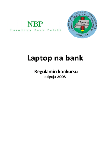 WOJEWÓD ORMATYC Z INF LENIA NA KO HNICZNEGO C ŚRODEK DO O IP S KI NEGO OLITE Z OPOL E Laptop na bank Regulamin konkursu edycja 2008 I. Organizatorzy konkursu Organizatorami konkursu „Laptop na bank" zwanego dalej Konkursem są Wojewódzki Ośrodek Doskonalenia Informatycznego i Politechnicznego w Opolu w Opolu ul. Głogowska 29. i Oddział Okręgowy Narodowego Banku Polskiego w Opolu ul. Damrota 28 II. Uczestnicy Konkursu 1. Konkurs skierowany jest do uczniów szkół gimnazjalnych i ponadgimnazjalnych mających siedzibę na terenie województwa opolskiego zwanych dalej Uczestnikami. Z wyłączeniem szkół dla dorosłych. 2. Uczestnicy biorą udział w Konkursie indywidualnie. 3. Zgłoszenia dokonuje dowolny nauczyciel pracujący w szkole do której uczęszcza uczeń. Zwany dalej Opiekunem. 4. Jeden Opiekun może zgłosić dowolną liczbą Uczestników. III. Cele konkursu 1. Rozwijanie zainteresowania uczniów edukacją ekonomiczną, przedsiębiorczością w połączeniu z technologią informacyjną; 2. Zainteresowanie uczniów zasobami edukacyjnymi portalu internetowego www.nbportal.pl. 3. Rozwijanie indywidualnych zainteresowań i wyobraźni uczniów, 4. Poszukiwanie utalentowanej młodzieży i zapewnienie możliwości rywalizacji w wybranej dziedzinie wiedzy. IV. Zasady Konkursu. 1. W konkursie mogą brać udział uczniowie szkół z terenu województwa opolskiego. 2. Zadaniem Uczestników będzie: a. Wykazanie się znajomością zagadnień dotyczących przedsiębiorczości w oparciu o Wojewódzki Ośrodek Doskonalenia Informatycznego i Politechnicznego 45-315 Opole, ul. Głogowska 27 NIP: 754-25-22-336 WWW: www.wodip.opole.pl e-mail: [email protected] 2/5 zasoby edukacyjne umieszczone na www.nbportal.pl. b. Posługiwanie się technologią informacyjną w rozwiązywaniu zadań. c. Wykazanie się znajomością zagadnień TI – podstawa programowa gimnazjum. d. Rozwiązanie zadań konkursowych. 3. Konkurs składa się z dwóch etapów: a. I etap eliminacje – polegającej na rozwiązaniu testu z wiedzy z podstaw przedsiębiorczości umieszczonego na internetowej platformie konkursowej b. II etap - zwany dalej Finałem Wojewódzkim – w którym Uczestnicy w bezpośredniej rywalizacji rozwiązywać będą test finałowy. 4. Warunkiem udziału jest nadesłanie przez Opiekuna zgłoszenia w formie elektronicznej. Zgłoszenie zawierać powinno listę uczniów z podaniem ich imienia, nazwiska, klasy oraz nazwy szkoły. 5. Zgłoszenia należy nadsyłać na adres [email protected]. Termin zgłoszenia upływa w dniu 5 grudnia 2008r. 6. Uczestnikom zostaną założone konta na platformie Konkursowej. Utworzone indywidualne loginy i hasła zostaną przesłane na adres e-mailowy Opiekuna. 7. Obowiązkiem Uczestnika jest zarejestrowanie się we wskazanym terminie na Internetowej Platformie Konkursowej zgodnie z danymi otrzymanymi od Opiekuna. 8. W celach testowych Internetowa platforma konkursowa dostępna będzie dla uczestników w dniach od 2 do 8 grudnia 2008. W tym okresie możliwe będzie wykonanie testu próbnego oraz weryfikacja loginów i haseł. 9. Uczestnictwo w Konkursie jest nieodpłatne. 10. Koszt dojazdu na finał Uczestnicy wraz z Opiekunami pokrywają we własnym zakresie. V. Pierwszy etap Konkursu 1. Pierwszy etap Konkursu zostanie przeprowadzony w dniach 9-10 grudnia 2008. 2. W ramach tego etapu Konkursu Uczestnicy rozwiązują indywidualnie, po zalogowaniu do platformy konkursowej (nbp_konkurs.wodip.opole.pl) test elektroniczny zawierający pytania z przedsiębiorczości (ułożone na podstawie informacji zamieszczonych na nbportal.edu.pl) oraz z technologii informacyjnej (ułożone zgodnie z podstawą programową gimnazjum). 3. Test zostanie udostępniony (wyłącznie dla zarejestrowanych uczestników) od 8:00 9 grudnia br. do 12:00 10 grudnia br. 4. Do etapu finałowego zostanie zakwalifikowanych 15 uczestników eliminacji z największą ilością Wojewódzki Ośrodek Doskonalenia Informatycznego i Politechnicznego 45-315 Opole, ul. Głogowska 27 NIP: 754-25-22-336 WWW: www.wodip.opole.pl e-mail: [email protected] 3/5 punktów. W przypadku Uczestników, którzy zdobyli taką samą ilość punktów o kolejności na liście decyduje organizator konkursu. 5. VI. 1. Lista finalistów zostanie opublikowana w dniu 10 grudnia 2008 na stronie www.wodip.opole.pl. Finał wojewódzki Finał wojewódzki odbędzie się 16 grudnia 2008 r. o godzinie 10:00 w siedzibie Wojewódzkiego Ośrodka Doskonalenia Informatycznego i Politechnicznego w Opolu w sali 104. 2. Finaliści wezmą udział w interaktywnym teście. 3. Zwycięzcą zostanie Uczestnik, który uzyska najwyższy wynik z testu. 4. Jeżeli przeprowadzenie testu nie pozwoli na wyłonienie zwycięzców zostanie przeprowadzona dogrywka. VII. 1. Rozstrzygnięcie Konkursu. Nagrody Zwycięzcą Konkursu zostanie Uczestnik, który zdobędzie najwięcej punktów podczas quizu finałowego lub w wyniku przeprowadzonej dogrywki. 2. 3. W skład jury Konkursu finałowego wejdą: · Krzysztof Gierek - Dyrektor Oddziału Okręgowego NBP w Opolu · Lesław Tomczak - Dyrektor WODIiP · Wojciech Błaszczyk - koordynator Konkursu Nagrodami za zwycięstwo w Konkursie będą nagrody rzeczowe: a. za zajęcie I miejsca – laptop b. za zajęcie II miejsca – komputer kieszonkowy PDA c. za zajęcie III miejsca – odtwarzacz cyfrowy Opiekuna zwycięzcy otrzyma od organizatorów – komputer kieszonkowy PDA 4. VIII. 1. Wszyscy uczestnicy otrzymają pamiątkowe dyplomy udziału. Postanowienia końcowe Wszelkie decyzje dotyczące Konkursu, w szczególności w zakresie wyłonienia zwycięzców w poszczególnych etapach, podejmuje organizator. 2. W kwestiach nieprzewidzianych niniejszym regulaminem głos rozstrzygający należy do organizatora. Wojewódzki Ośrodek Doskonalenia Informatycznego i Politechnicznego 45-315 Opole, ul. Głogowska 27 NIP: 754-25-22-336 WWW: www.wodip.opole.pl e-mail: [email protected] 4/5 3. Organizator posiada wyłączne prawo do i