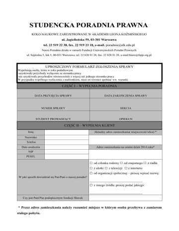STUDENCKA PORADNIA PRAWNA KOŁO NAUKOWE ZAREJSTROWANE W AKADEMII LEONA KOŹMIŃSKIEGO ul. Jagiellońska 59, 03-301 Warszawa tel. 22 519 22 38, fax. 22 519 23 18, e-mail. [email protected] Nasza Poradnia działa w ramach Fundacji Uniwersyteckich Poradni Prawnych ul. Szpitalna 5, lok 5, 00-031 Warszawa; tel. 22 828 91 28, fax. 22 828 91 29, e-mail:[email protected] UPROSZCZONY FORMULARZ ZGŁOSZENIA SPRAWY Wypełniają osoby, które w roku podatkowym: -uzyskiwały przychody wyłącznie ze stosunku pracy -nie uzyskiwały przychodów równocześnie z więcej niż jednego stosunku pracy W przypadku wspólnego rozliczenia z małżonkiem, musi on również spełniać ww. warunki. CZĘŚĆ I – WYPEŁNIA PORADNIA DATA PRZYJĘCIA SPRAWY DATA ZAKOŃCZENIA SPRAWY NUMER SPRAWY SEKCJA STUDENT PROWADZĄCY OPIEKUN CZĘŚĆ II – WYPEŁNIA KLIENT Imię Aktualny adres zamieszkania( miejscowość/ulica) * Nazwisko Telefon Data urodzenia Adres zamieszkania na ostatni dzień 2014 roku* NIP PESEL □ od członka rodziny □ od znajomego □ z radia □ z ulotki □ z telewizji □ z internetu □ od organizacji społecznej – proszę wpisać nazwę: W jaki sposób dowiedział się Pan/Pani o naszej poradni? ________________________________ □ z innego źródła: proszę podać jakiego: ________________________________ Czy jest Pani/Pan podopiecznym fundacji Sławek * Przez adres zamieszkania należy rozumieć miejsce w którym osoba przebywa z zamiarem stałego pobytu. ZASADY ŚWIADCZENIA POMOCY PRAWNEJ Prosimy o zapoznanie się z niniejszymi zasadami świadczenia pomocy prawnej a następnie złożenie wymaganych podpisów 1.Oświadczam, że w tej konkretnej sprawie nie korzystałam/korzystałem i nie korzystam z pomocy adwokata, radcy prawnego, doradcy podatkowego, biegłego rewidenta, innego podmiotu zajmującego się sporządzaniem w imieniu i na rzecz podatników, płatników i inkasentów, zeznań i deklaracji podatkowych lub udzielaniem im pomocy w tym zakresie, lub innej instytucji świadczącej pomoc prawną. ____________________________ mi na pokrycie kosztów profesjonalnej pomocy prawnej. _____________________________ 5.Niniejszym wyrażam zgodę na przetwarzanie moich danych osobowych przez Studencką Poradnię Prawną, w tym ujawniających pochodzenie rasowe bądź etniczne, poglądy polityczne, przekonania religijne lub filozoficzne, przynależność wyznaniową, partyjną lub związkową, jak również dane o stanie zdrowia, kodzie genetycznym, nałogach lub życiu seksualnym, w celach związanych z udzielną mi przez studentów pracujących w SPP pomocą prawną, jak również w celach związanych z edukacją studentów. _____________________________ 11.Oświadczam, że: -Warunki wymienione w punkcie wyżej spełnione są również przez mojego małżonka -Jestem upoważniony(a) przez męża/żonę do złożenia wniosku o wspólne opodatkowania naszych dochodów. -Otrzymałem/am w formie pisemnej informacje o warunkach jakie muszą być spełnione w przypadku złożenia wniosku o wspólne opodatkowanie dochodów małżonków. Ww. warunki są spełnione przeze mnie oraz przez współmałżonka (Wypełniają wyłącznie osoby które zamierzają dokonać wspólnego rozliczenia z mężem/żoną). ___________________________ (data, własnoręczny podpis) 7.Niniejszym wyrażam zgodę na przetwarzanie moich danych osobowych przez Studencką Poradnię Prawną, w tym ujawniających pochodzenie rasowe bądź etniczne, poglądy polityczne, przekonania religijne lub filozoficzne, przynależność wyznaniową, partyjną lub związkową, jak również dane o stanie zdrowia, kodzie genetycznym, (data, własnoręczny podpis) nałogach lub życiu seksualnym, w celach związanych z udzielną mi przez studentów pracujących w SPP pomocą 2. Przyjmuję do wiadomości, że zeznanie podatkowe jest prawną, jak również w celach związanych z edukacją sporządzone przez studenta, na wyłączne ryzyko osoby studentów. ubiegającej się o pomoc w tym zakresie. Poradnia może w _____________________________ każdej chwili zrezygnować ze sporządzenia zeznania. (data, własnoręczny podpis) Jeśliby wskutek świadczonej pomocy lub jej braku powstała jakakolwiek szkoda, to z wyjątkiem jej 8.Oświadczam,że zostałem / zostałam poinformowany/ / umyślnego wyrządzenia jakakolwiek odpowiedzialność poinformowana, iż złożenie powyższego oświadczenia jest odszkodowawcza Akademii Leona Koźmińskiego, jej dobrowolne, administratorem bazy danych jest SPP z siedzibą w Warszawie przy ulicy Jagiellońskiej 59, zgodnie pracowników oraz studentów jest wyłączona. z art. 24 ust. 1 pkt 3 ustawy o ochronie danych osobowych ____________________________ (…) mam prawo wglądu do swoich danych oraz do ich (data, własnoręczny podpis) poprawiania, moje dane osobowe nie będą poddawane 3.Przyjmuję do wiadomości, że w przypadku powołania dalszemu przetwarzaniu niezgodnemu z celami studentów lub pracowników Akademii Leona określonymi w treści oświadczenia (art. 26 ust. 1 pkt 2 Koźmińskiego przed sąd w charakterze świadka nie ustawy) oraz że moje dane nie będą udostępniane innym obowiązuje ich tajemnica analogiczna do tajemnicy podmiotom. adwokackiej, czyli będą zobowiązani ujawnić przed sądem _____________________________ wszystkie dostępne im informacje. To samo dotyczy (data, własnoręczny podpis) informacji, o które wystąpią inne organy (np. prokurator, Policja, organy podatkowe bądź organy kontroli 9.Poradnia ma prawo zatrzymać kserokopie dokumentów. skarbowej) – uprawnione na mocy poszczególnych ___________________________ (data, własnoręczny podpis) przepisów do żądania informacji w ramach prowadzonych 10.Oświadczam, że w roku podatkowym 2014: przez nich postępowań. -uzyskiwałem przychody wyłącznie ze źródeł położonych ____________________________ (data, własnoręczny podpis) w Polsce oraz wyłącznie z e stosunku pracy . -nie uzyskiwałem przychodów równoc