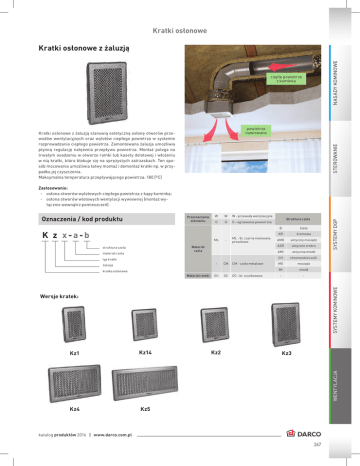 Kratki osłonowe NASADY KOMINOWE Kratki osłonowe z żaluzją ciepłe powietrze z kominka powietrze nawiewane STEROWANIE Kratki osłonowe z żaluzją stanowią estetyczną osłonę otworów przewodów wentylacyjnych oraz wylotów ciepłego powietrza w systemie rozprowadzania ciepłego powietrza. Zamontowana żaluzja umożliwia płynną regulację natężenia przepływu powietrza. Montaż polega na trwałym osadzeniu w otworze ramki lub kasety dolotowej i włożeniu w nią kratki, która blokuje się na sprężystych zatrzaskach. Ten sposób mocowania umożliwia łatwy montaż i demontaż kratki np. w przypadku jej czyszczenia. Maksymalna temperatura przepływającego powietrza: 180 [ºC] Oznaczenia / kod produktu Przeznaczenie elementu K z x-a-b W W W - przewody wentylacyjne O O O - ogrzewanie powietrzne ML - ML - bl. czarna malowana proszkowo Materiał czoła struktura czoła materiał czoła typ kratki - żaluzja CM CM - czoło metalowe kratka osłonowa OC OC OC - bl. ocynkowana B biała KR kremowa AMO antyczny mosiądz ASR antyczne srebro AMI antyczna miedź CH chromonikiel szlif. MO mosiądz MI miedź - - SYSTEMY KOMINOWE Materiał ramki Struktura czoła SYSTEMY DGP Zastosowanie: ⋅⋅ osłona otworów wylotowych ciepłego powietrza z kapy kominka; ⋅⋅ osłona otworów wlotowych wentylacji wywiewnej (montaż wyłącznie wewnątrz pomieszczeń). Wersje kratek: Kz14 Kz4 Kz5 Kz2 Kz3 WENTYLACJA Kz1 katalog produktów 2016 | www.darco.com.pl 267 Kratki osłonowe LP CwxDw Bz NASADY KOMINOWE Zestawienie wymiarów: 35 Az Wymiary [mm] Az Bz Cw Dw Fz Ez H Przekrój czynny [cm²] Waga [kg] 0.40 1 Kz1 195 135 145 95 165 105 37 64 2 Kz14 175 175 125 128 140 140 37 84 0.47 3 Kz2 195 175 145 128 165 140 37 98 0.50 0.70 4 Kz3 245 175 200 128 215 140 40 134 5 Kz4 335 195 285 145 300 165 40 234 0.95 6 Kz5 485 195 440 150 455 165 40 359 1.40 5 H Fz Wersja kratki Kz2 Strata ciśnienia ∆p [Pa] Kz1 Strata ciśnienia ∆p [Pa] Charakterystyki przepływu: Strata ciśnienia ∆p [Pa] STEROWANIE Ez Kz3 Prędkość przepływu v [m/s] Prędkość przepływu v [m/s] Kz4 Kz4 Prędkość przepływu v [m/s] Prędkość przepływu v [m/s] Wykres strat ciśnienia kratki Kz3 w zależności od prędkości wypływu powietrza z czoła kratki. Kz4 Kz4 Kz5 Prędkość przepływu v [m/s] Wykres strat ciśnienia kratki Kz5 w zależności od prędkości wypływu powietrza z czoła kratki. WENTYLACJA Wykres strat ciśnienia kratki Kz4 w zależności od prędkości wypływu powietrza z czoła kratki. Wykres strat ciśnienia kratki Kz2 oraz Kz14 w zależności od prędkości wypływu powietrza z czoła kratki. Strata ciśnienia ∆p [Pa] Wykres strat ciśnienia kratki Kz1 w zależności od prędkości wypływu powietrza z czoła kratki. Strata ciśnienia ∆p [Pa] SYSTEMY KOMINOWE SYSTEMY DGP Kz4 www.darco.com.pl | katalog produktów 2016 268