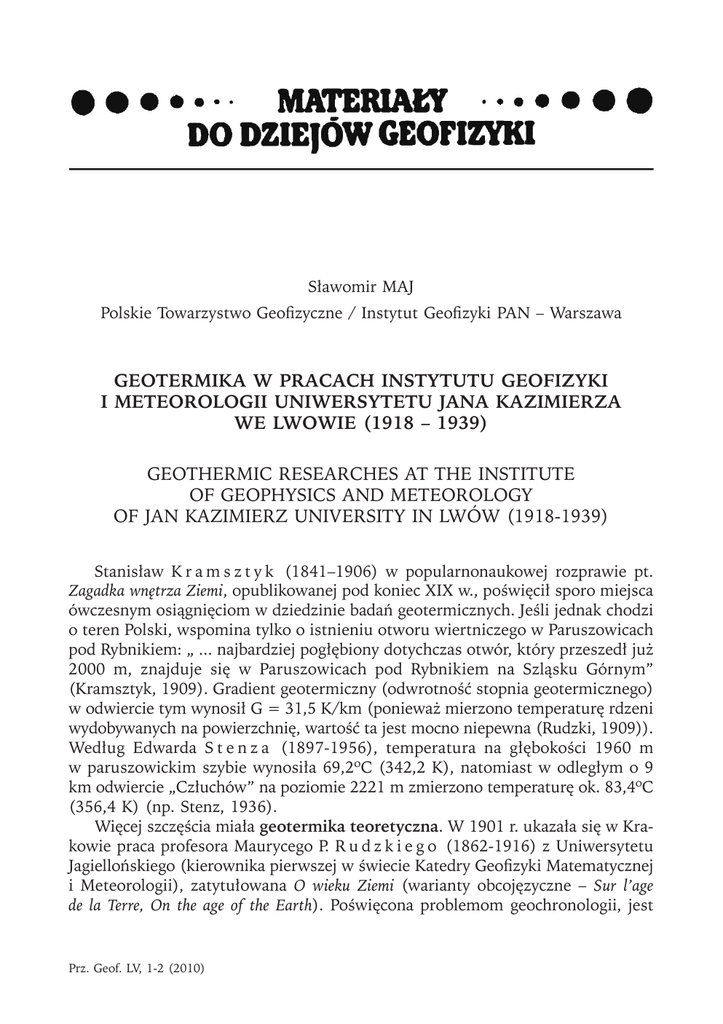 Sławomir MAJ Polskie Towarzystwo Geofizyczne / Instytut Geofizyki PAN – Warszawa GEOTERMIKA W PRACACH INSTYTUTU GEOFIZYKI I METEOROLOGII UNIWERSYTETU JANA KAZIMIERZA WE LWOWIE (1918 – 1939) GEOTHERMIC RESEARCHES AT THE INSTITUTE OF GEOPHYSICS AND METEOROLOGY OF JAN KAZIMIERZ UNIVERSITY IN LWÓW (1918-1939) Stanisław K r a m s z t y k (1841–1906) w popularnonaukowej rozprawie pt. Zagadka wnętrza Ziemi, opublikowanej pod koniec XIX w., poświęcił sporo miejsca ówczesnym osiągnięciom w dziedzinie badań geotermicznych. Jeśli jednak chodzi o teren Polski, wspomina tylko o istnieniu otworu wiertniczego w Paruszowicach pod Rybnikiem: „ ... najbardziej pogłębiony dotychczas otwór, który przeszedł już 2000 m, znajduje się w Paruszowicach pod Rybnikiem na Szląsku Górnym” (Kramsztyk, 1909). Gradient geotermiczny (odwrotność stopnia geotermicznego) w odwiercie tym wynosił G = 31,5 K/km (ponieważ mierzono temperaturę rdzeni wydobywanych na powierzchnię, wartość ta jest mocno niepewna (Rudzki, 1909)). Według Edwarda S t e n z a (1897-1956), temperatura na głębokości 1960 m w paruszowickim szybie wynosiła 69,2ºC (342,2 K), natomiast w odległym o 9 km odwiercie „Człuchów” na poziomie 2221 m zmierzono temperaturę ok. 83,4ºC (356,4 K) (np. Stenz, 1936). Więcej szczęścia miała geotermika teoretyczna. W 1901 r. ukazała się w Krakowie praca profesora Maurycego P. R u d z k i e g o (1862-1916) z Uniwersytetu Jagiellońskiego (kierownika pierwszej w świecie Katedry Geofizyki Matematycznej i Meteorologii), zatytułowana O wieku Ziemi (warianty obcojęzyczne – Sur l’age de la Terre, On the age of the Earth). Poświęcona problemom geochronologii, jest Prz. Geof. LV, 1-2 (2010) 78 S. Maj w rzeczywistości pierwszą w polskiej literaturze geofizycznej rozprawą z zakresu geotermodynamiki. Autor, M.P. Rudzki – absolwent Uniwersytetów we Lwowie i w Wiedniu, sugerując się modelem stygnięcia ziemskiego globu, podanym przez Williama T h o m s o n a (Lorda Kelvina, 1824-1907) w 60. latach XIX wieku (Thompson, 1863, 1864), opracował własną koncepcję modelu oziębiania się Ziemi – modelu w postaci stygnącej i kurczącej się zewnętrznej sferycznej warstwy litosfery (odpowiednik skorupy ziemskiej lub układu skorupa + górny płaszcz). Wynikiem takiego procesu są fałdy, płaszczowiny powierzchniowe i inne deformacje skorupy. Z drugiej strony, szacując z danych kartograficzno-geologicznych przypuszczalną zmianę wielkości powierzchni kuli ziemskiej, a co za tym idzie – odpowiednie skrócenie jej promienia (R), można ocenić wielkość przedziału czasowego, w jakim tego rodzaju efekt powstanie (oczywiście przy założeniu określonego „charakteru” stygnięcia; Rudzki, 1901. Model Rudzkiego – zakwestionowany przez samego autora z powodu zarówno odkrycia radiogenicznego ciepła skał, jak i konieczności uwzględnienia w obliczeniach zmian grawitacyjnej energii potencjalnej Ziemi w efekcie kurczenia się globu (patrz Rudzki, 1909, 1911) – jest krańcowym wariantem znacznie bardziej realistycznego, współczesnego modelu stygnącej i kurczącej się nieco skorupy ziemskiej z wewnętrznymi źródłami ciepła, podgrzewanej strumieniem ciepła dopływającym z płaszcza (Maj, 1988, 1997). W okresie przełomu XIX i XX wieku możemy doszukać się także pewnych prac z zakresu geotermiki laboratoryjnej. Na przykład, Ignacy Z a k r z e w s k i (1860-1932), docent i profesor (od 1893) na Wydziale Matematyczno-Przyrodniczym (pierwszy szef Katedry Fizyki) w c.k. Uniwersytecie Lwowskim (imienia cesarza Franciszka I – zabór austriacki!), interesujący się fizyką lodu, termodynamiką ciał stałych oraz metodami kalorymetrii, badał relacje między ciepłem właściwym głównych minerałów skał magmowych a temperaturą (Zakrzewski, 1891, 1893). Znakomity fizyk (a także geofizyk) Marian S m o l u c h o w s k i (18721917), w okresie 1899-1913 kierownik Katedry Fizyki (Wydział MatematycznoPrzyrodniczy) Uniwersytetu we Lwowie, zajmował się m.in. właściwościami przewodnictwa cieplnego proszków i pyłów (np. drobnego kwarcu, ziemi okrzemkowej), jako mieszanin dwu faz: stałej i gazowej, w zależności od ciśnienia gazu, a także rozważył przypadek krańcowy – proszek w próżni (przewodnictwo cieplne tylko przez styk granul i promieniowanie temperaturowe) (np. Smoluchowski, 1910a,b; 1911). W tym miejscu warto też wspomnieć o istnieniu krótkiej (i czysto teoretycznej) noty autorstwa Józefa K o w a l s k i e g o - W i e r u s z a (1866-1927), profesora fizyki w Uniwersytecie we Fryburgu (Szwajcaria), a od roku 1915 – w uczelniach warszawskich – Uniwersytecie i Politechnice (np. Birkenmajer, 1918; Piłatowicz, 1992), pt. O warunkach, którym stałe przewodnictwa cieplnego kryształów czynić zadość powinny, zamieszczonej w czasopiśmie Prace matematyczno-fizyczne, tom 2, 100-103, Warszawa 1890. Geotermika w Uniwersytecie Jana Kazimierza we Lwowie 79 W latach 1918-1939 interesowano się przede wszystkim pomiarami temperatury (T) i stopnia geotermicznego (dz/dT) (odwrotność gradientu geotermicznego (dT/dz) w otworach wiertniczych na terenie Polski. Profesor Henryk A r c t o w s k i (1871-1958), dyrektor Instytutu Geofizyki i Meteorologii Uniwersytetu Jana Kazimierza we Lwowie, zorganizował badania geotermiczne w szybach naftowych na obszarze Przedgórza Karpackiego. Podjęcie badań terenowych w zakresie geofizyki prospekcyjnej umożliwiły w pewnym stopniu dotacje z Komisji Fizjograficznej Polskiej Akademii Umiejętności w Krakowie, ale przede wszystkim współpraca ze Spółką Akcyjną Pionier ze Lwowa. Powstanie tej spółki związane było z poszukiwaniami i eksploatacją przez kapitał zagraniczny złóż mineralnych (m.in. bituminów) na obszarze Karpat Wschodnich i całego Podkarpacia. Bogata S.A. Pionier, utrzymywana i finansowana przez kapitał zagraniczny, wyszukiwała, angażowała i subwencjonowała znac