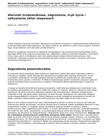 Warunki środowiskowe, zagrożenia, tryb życia i odżywianie żółwi stepowych Opublikowane na Żółwie lądowe, żółw stepowy i grecki (http://www.zolw.info) Warunki środowiskowe, zagrożenia, tryb życia i odżywianie żółwi stepowych Beata, wt., 09/01/2007 Testudo horsfieldii Żółw stepowy w naturze Żółwie stepowe (Testudo horsfieldi, Agrionemys horsfieldi) są jednym z najpowszechniej hodowanych w domach gatunków żółwi lądowych, nie tylko w Polsce, ale również w wielu innych krajach. Pomimo tego, wciąż wiedza o nich jest tylko powierzchowna. Żółwie te występują naturalnie na obszarze rozciągającym się od południowo-wschodniego terenu dawnego ZSRR, aż po północno-wschodni Iran, Afganistan, północno-zachodni Pakistan i wschodnie Chiny. Żyją zatem w środkowej części Azji, gdzie panuje skrajny klimat kontynentalny. Aby przetrwać, zwierzęta musiały się przystosować do jego trudnych warunków i sprostać rozlicznym wyzwaniom ekologicznym. Zagrożenia pozanaturalne W ostatnich latach populacja żółwi stepowych stopniowo zanika jako efekt masowego odłowu z naturalnych siedlisk, celem którego jest sprzedaż tych gadów jako zwierząt domowych. Innym czynnikiem obniżającym liczność populacji testudo horsfieldi jest zakłócanie ich naturalnego środowiska przez uprawy i rolnictwo. W efekcie stopniowego spadku liczebności populacji gatunek testudo horsfieldi został umieszczony w Aneksie II Konwencji Waszyngtońskiej jako „krytycznie zagrożony”. Z uwagi na wysoką śmiertelność podczas transportu i aklimatyzacji odławianych osobników, Unia Europejska wprowadziła we wrześniu 1999 roku zakaz ich importu. Mimo to, olbrzymie ilości żółwi stepowych są wciąż corocznie odławiane, głównie dla amerykańskich sklepów zoologicznych i targowisk w Azji, ale także celem przemytu na teren Europy. Dodatkowo ich naturalne siedliska wciąż ulegają głębokim zmianom. Żółwie stepowe są wciąż nielegalnie sprowadzane również do Polski i pomimo udaremniania części prób przemytu proceder zdaje się nie mieć końca. Warto w tym miejscu wspomnieć czym naprawdę jest przemyt, a raczej co oznacza dla zwierząt. Przemycane żółwie są masowo i szczelnie poupychane w torbach, często posklejane taśmami w celu skrępowania ruchów, co mogłoby zostać zauważone podczas kontroli na granicy. Wiele z przemycanych żółwi znajdowano pod maską i w innych elementach samochodu. Zwierzęta spędzają tak wiele dni bez wody i pożywienia, w wyczerpującej pozycji nieraz bez dostępu do świeżego powietrza. Są narażone na niewyobrażalny i długotrwały stres oraz urazy mechaniczne. Szacuje się, że z dziesięciu przemycanych osobników przeżywa tylko jeden. Reszta ginie z wycieńczenia bądź na skutek rozlicznych urazów. Zdarza się że żółwiom pękają czaszki i skorupy, czy miażdżą się i urywają kończyny. Te, które przeżywają są skrajnie wycieńczone i zestresowane i na zawsze już będą stworzeniami płochliwymi i nieufnymi. Nigdy nie zaakceptują utraty wolności. Mogą również popadać w apatię i mieć problemy z aklimatyzacją w niewoli, jako że zostały w brutalny sposób „wyrwane” naturze. © Serwis o żółwiach lądowych www.zolw.info oraz inni autorzy 2006-2010. Wszelkie prawa zastrzeżone. Korzystanie z serwisu oznacza akceptację regulaminu oraz polityki prywatności. Page 1 of 6 Warunki środowiskowe, zagrożenia, tryb życia i odżywianie żółwi stepowych Opublikowane na Żółwie lądowe, żółw stepowy i grecki (http://www.zolw.info) Metodologia badań nad gatunkiem testudo horsfieldi Grupa amerykańskich naukowców w składzie: F. Lagarde, X. Bonnet, J. Corbin, B. Henen, K. Nagy, B. Mardonov oraz G. Naulleau - prowadziła wieloletnie, szczegółowe badania nad tym gatunkiem, z uwzględnieniem dwóch istotnych okresów w cyklu rocznym żółwi stepowych, tj. okresu godowego, przypadającego na 27.03-14.04 i okresu post-godowego obejmującego okres 15.04-18.05. Badania prowadzono w Uzbekistanie w surowym regionie Djeiron w pobliżu pustyni Kyzyl Kum, o rocznej sumie opadów poniżej 250 mm. Na piaszczystej glebie rosną głównie krzewy tj. Halloxylon aphyllum, czy z rodzaju Astragalus oraz na wiosnę roczne rośliny tj. Bromus tectorum, Hypecoum parviflorum, Papaver parvoninum, Ceratocephalus falcatus, Alyssum desertorum. Badano tryb życia, odżywianie i zachowania losowo wybranych przedstawicieli testudo horsfieldi. Badaniem objęto łącznie 863 żółwie. Zachowania, które obserwowano podzielono na sześć kategorii: chodzenie, żerowanie, aktywność seksualna (tj. wszelkie interakcje miedzy samcem a samicą, kopulacja, a także walki samców), spoczynek (brak ruchu lecz pozostawanie żółwia poza norą), zakopanie (w norze, najprawdopodobniej żółw jest nieaktywny) i inne zachowania. Warunki klimatyczne w jakich żyje testudo horsfiledi Klimat omawianego regionu jest typowo kontynentalny. Temperatura powietrza w cieniu w styczniu w latach 1994-1998 wynosiła średnio 1,6 ºC z odchyleniem standardowym 1,5 ºC, zaś w lipcu średnio 29,8 ºC z odchyleniem standardowym 0,6 ºC. Średnia roczna ilość opadów wynosiła 175 mm, z czego prawie wszystkie (96 %) przypadają na okres pomiędzy listopadem a majem. Od czerwca do października żółwie stepowe doświadczają zatem długotrwałej suszy. W stosunku do badanych lat wystąpiły jednak znaczne różnice opadów rocznych (od 96 do 271 mm), a zatem okresy letnie dla żółwi stepowych mogą być stosunkowo suche lub całkiem suche. Jednakże w norach zamieszkiwanych przez żółwie (około 15 cm pod ziemią) w okresie wiosennym panują stosunkowo niskie i stałe temperatury, pomimo wysokich zmian temperatur na zewnątrz. Przykładowo wiosną zanotowano najniższa temperaturę powietrza (10 cm nad powierzchnią ziemi) wynoszącą 10,2 ºC, zaś najwyższą 43,8 ºC. Natomiast temperatura w norach wynosiła od 1,4 ºC do 7,2 ºC