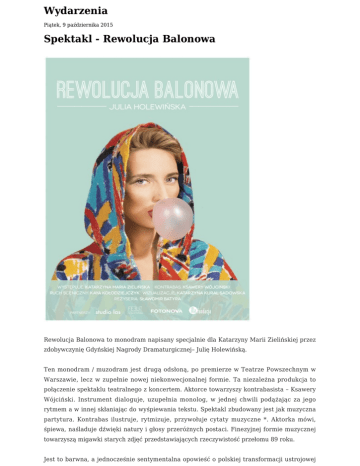 Wydarzenia Piątek, 9 października 2015 Spektakl - Rewolucja Balonowa Rewolucja Balonowa to monodram napisany specjalnie dla Katarzyny Marii Zielińskiej przez zdobywczynię Gdyńskiej Nagrody Dramaturgicznej– Julię Holewińską. Ten monodram / muzodram jest drugą odsłoną, po premierze w Teatrze Powszechnym w Warszawie, lecz w zupełnie nowej niekonwecjonalnej formie. Ta niezależna produkcja to połączenie spektaklu teatralnego z koncertem. Aktorce towarzyszy kontrabasista – Ksawery Wójciński. Instrument dialoguje, uzupełnia monolog, w jednej chwili podążając za jego rytmem a w innej skłaniając do wyśpiewania tekstu. Spektakl zbudowany jest jak muzyczna partytura. Kontrabas ilustruje, rytmizuje, przywołuje cytaty muzyczne *. Aktorka mówi, śpiewa, naśladuje dźwięki natury i głosy przeróżnych postaci. Finezyjnej formie muzycznej towarzyszą migawki starych zdjęć przedstawiających rzeczywistość przełomu 89 roku. Jest to barwna, a jednocześnie sentymentalna opowieść o polskiej transformacji ustrojowej lat ‘90, widzianej oczami małej dziewczynki. To również portret pierwszego wychowanego w demokracji pokolenia – dzisiejszych trzydziestolatków, którzy jako kilkuletnie dzieci obserwowali zachodzące w Polsce zmiany. Kim są? Które z ich marzeń się spełniły, a z którymi musieli się rozstać? Rewolucja uruchamia u widzów lawinę wspomnień dotyczących tamtego czasu. Po wyjściu z teatru jeszcze długo rozmawiają o wspólnych przeżyciach. Wspólne przeżycia, wizje i często naiwne fascynacje z tamtych czasów łączą i na swój sposób podkreślają wspólnotowość. Spektaklowi towarzyszyć będą warsztaty teatru dokumentalnego, podczas których jako materia literacka posłużą wspomnienia uczestników warsztatów. Każda osoba przygotuje konspekt dotyczący konkretnego wspomnienia z tamtego okresu. Po krótkim szkoleniu aktorskim osoby po kolei przedstawią swoje opowieści w scenografii spektaklu. Efektem więc będzie mini- spektakl dokumentalny. Co zostało z zachwytu kapitalizmem i demokracją? Co tak naprawdę pamiętamy z lat ‘90? Kolorowe produkty w sklepach? Mydełko Fa? Stana Tymińskiego? A może po prostu smak gumy balonowej? *jako cytatów muzycznych korzystano z m.in. PAPA DANCE „Monaliza”, KULT „"Lewe lewe loff" , REPUBLIKA „Telefony” czas trwania spektaklu: 1h15min Spektakl dla widzów od 13 roku życia. pełna nazwa teatru: Fundacja "MA FUNDACJA" w kooprodukcji z FEEL IT MANAGEMENT autor: Julia Holewińska, tytuł: REWOLUCJA BALONOWA obsada : Kasia Maria Zielińska Ksawery Wójciński – kontrabas reżyser: Sławomir Batyra scenograf: Katarzyna Maria Zielińska wizualizacje: Katarzyna Kural Sadowska zdjęcia do wizualizacji: FOTO NOVA – Tomasz Wierzejski choreografia: Kaya Kołodziejczyk kierownik produkcji: Katarzyna Wojciechowska-Reiber muzyka: Ksawery Wójciński, oprawa graficzna: STUDIO LAS - Michał Krul Karolina Koza-Marasek & Marta Podsiadło materiały filmowe (pomysł i realizacja): Magdalena Batyra & Jacek Bassa
