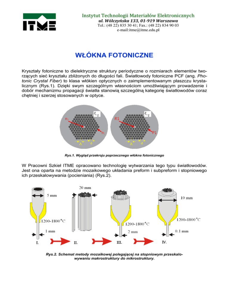 Instytut Technologii Materiałów Elektronicznych ul. Wólczyńska 133, 01-919 Warszawa Tel.: (48 22) 835 30 41; Fax.: (48 22) 834 90 03 e-mail:[email protected] WŁÓKNA FOTONICZNE Kryształy fotoniczne to dielektryczne struktury periodyczne o rozmiarach elementów tworzących sieć kryształu zbliżonych do długości fali. Światłowody fotoniczne PCF (ang. Photonic Crystal Fiber) to klasa włókien optycznych o zaimplementowanym płaszczu krystalicznym (Rys.1). Dzięki swym szczególnym własnościom umożliwiającym prowadzenie i dobór mechanizmu propagacji światła stanowią szczególną kategorię światłowodów coraz chętniej i szerzej stosowanych w optyce. Rys.1. Wygląd przekroju poprzecznego włókna fotonicznego W Pracowni Szkieł ITME opracowano technologię wytwarzania tego typu światłowodów. Jest ona oparta na metodzie mozaikowego układania preform i subpreform i stopniowego ich przeskalowywania (pocieniania) (Rys.2). Rys.2. Schemat metody mozaikowej polegającej na stopniowym przeskalowywaniu makrostruktury do mikrostruktury. Typy światłowodów fotonicznych: - Światłowody szklano-powietrzne typu PBG prowadzące światło w przerwie fotonicznej, Światłowody szklano-powietrzne nieliniowe o dużym współczynniku wypełnienia i małym rdzeniu, Światłowody szklano-powietrzne prowadzące światło na zasadzie zmodyfikowanego wewnętrznego odbicia MTIR, Światłowody całoszklane bez obecności otworów powietrznych, a) b) c) Rys.3. Przykłady włókien PCF wytwarzanych w Pracowni Szkieł ITME (od lewej): a) włókna PBG: dwa przykłady PCF z otworami powietrznymi i dwa przykłady całoszklanych PCF z siatką heksagonalną i kwadratową; b) dwójłomne włókno nieliniowe: jedno z rdzeniem eliptycznym, drugie bez anizotropii optycznej i ostatnie – nieliniowe PCF z siatką kwadratową; c) włókna MTIR: z otworami powietrznymi i siatką heksagonalną i kwadratową, następne – włókno laserowe z wewnętrznym płaszczem jednomodowym, dwa ostatnie – PCF całoszklane Kontakt bezpośredni: Dariusz Pysz, tel.wew. 181, 456, e-mail: [email protected]
