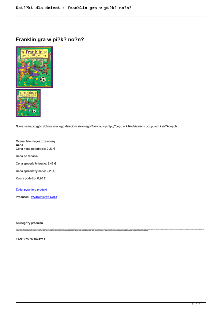 Ksi??ki dla dzieci : Franklin gra w pi?k? no?n? Franklin gra w pi?k? no?n? Nowa seria przygód dobrze znanego dzieciom zielonego ?ó?wia, wyst?puj?cego w kilkudziesi?ciu pozycjach ksi??kowych... Ocena: Nie ma jeszcze oceny Cena Cena netto po rabacie: 2,23 € Cena po rabacie Cena sprzeda?y brutto: 2,43 € Cena sprzeda?y netto: 2,23 € Kwota podatku: 0,20 € Zadaj pytanie o produkt Producent: Wydawnictwo Debit Szczegó?y produktu Nowa seria przygód dobrze znanego dzieciom zielonego ?ó?wia, wyst?puj?cego w kilkudziesi?ciu pozycjach ksi??kowych, w animowanym serialu telewizyjnym oraz w kilku pe?nometra?owych filmach. W tej serii ka?da ksi??ka zawiera pe?n? przygod? Franklina i jego przyjació?, tyle ?e przedstawian? w skrócie i opisan? ?atwym j?zykiem. Proste zdania i nieskomplikowane s?owa to zach?ta dla dziecka, które w?a?nie uczy si? czyta?. Przedszkolaki maj? doskona?? okazj?, by zacz?? nauk? czytania ze swoim ulubionym bohaterem, a sze?ciolatki i starsze dzieci zapewne przeczytaj? ?atwy tekst samodzielnie. W tej serii ukazano przygody znane dzieciom z telewizji, jednak zawsze w nieco zmienionej wersji. EAN: 9788371674211 1 / 1 Powered by TCPDF (www.tcpdf.org)