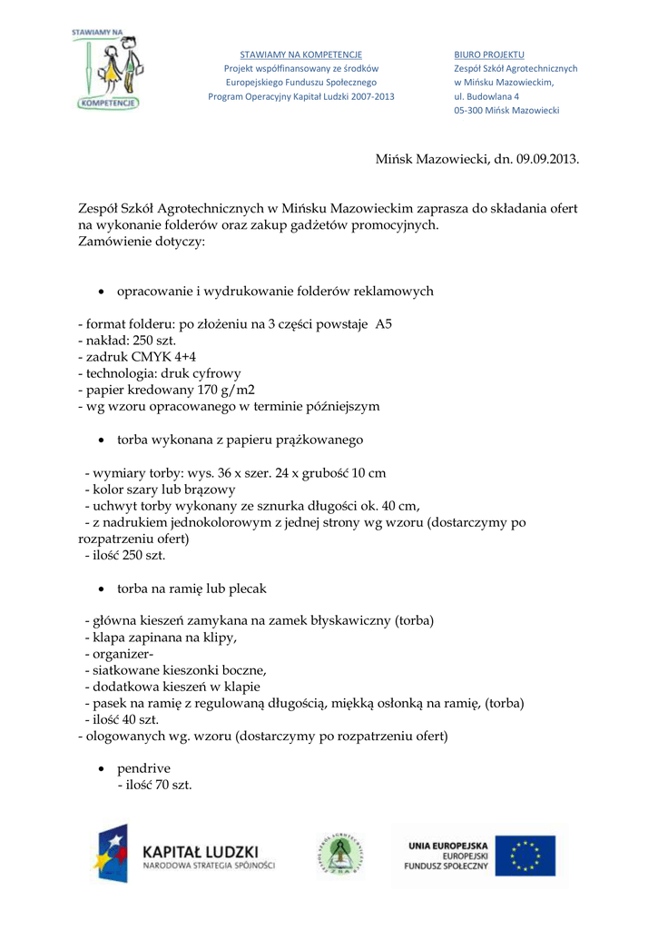 STAWIAMY NA KOMPETENCJE Projekt współfinansowany ze środków Europejskiego Funduszu Społecznego Program Operacyjny Kapitał Ludzki 2007-2013 BIURO PROJEKTU Zespół Szkół Agrotechnicznych w Mińsku Mazowieckim, ul. Budowlana 4 05-300 Mińsk Mazowiecki tel. 25 7592651 Mińsk Mazowiecki, dn. 09.09.2013. Zespół Szkół Agrotechnicznych w Mińsku Mazowieckim zaprasza do składania ofert na wykonanie folderów oraz zakup gadżetów promocyjnych. Zamówienie dotyczy: opracowanie i wydrukowanie folderów reklamowych - format folderu: po złożeniu na 3 części powstaje A5 - nakład: 250 szt. - zadruk CMYK 4+4 - technologia: druk cyfrowy - papier kredowany 170 g/m2 - wg wzoru opracowanego w terminie późniejszym torba wykonana z papieru prążkowanego - wymiary torby: wys. 36 x szer. 24 x grubość 10 cm - kolor szary lub brązowy - uchwyt torby wykonany ze sznurka długości ok. 40 cm, - z nadrukiem jednokolorowym z jednej strony wg wzoru (dostarczymy po rozpatrzeniu ofert) - ilość 250 szt. torba na ramię lub plecak - główna kieszeń zamykana na zamek błyskawiczny (torba) - klapa zapinana na klipy, - organizer- siatkowane kieszonki boczne, - dodatkowa kieszeń w klapie - pasek na ramię z regulowaną długością, miękką osłonką na ramię, (torba) - ilość 40 szt. - ologowanych wg. wzoru (dostarczymy po rozpatrzeniu ofert) pendrive - ilość 70 szt. STAWIAMY NA KOMPETENCJE Projekt współfinansowany ze środków Europejskiego Funduszu Społecznego Program Operacyjny Kapitał Ludzki 2007-2013 BIURO PROJEKTU Zespół Szkół Agrotechnicznych w Mińsku Mazowieckim, ul. Budowlana 4 05-300 Mińsk Mazowiecki tel. 25 7592651 1. Wszystkie logotypy Unii Europejskiej powinny być zgodne z „Wytycznymi dotyczącymi oznaczania projektów w ramach Programu Operacyjnego Kapitał Ludzki”. 2. Usługa ma być wykonana wraz z dostawą do siedziby zamawiającego w podanym niżej terminie. 3. Na realizację każdego z wymienionych przedmiotów zamówienia powinien być wystawiony odrębny rachunek lub faktura VAT. 4. W celu realizacji zamówienia Zamawiający przekaże Wykonawcy materiały za pomocą poczty elektronicznej. Terminy wykonania zamówienia: do 30.09.2013 r. Oferta powinna być przesłana za pośrednictwem: - poczty elektronicznej na adres: [email protected], lub - na adres: Zespół Szkół Agrotechnicznych w Mińsku Mazowieckim, ul. Budowlana 4, 05-300 Mińsk Mazowiecki do dnia 17.09.2013r. Oferty złożone po terminie nie będą rozpatrywane. Zapytanie ofertowe zamieszczono na stronie: www.zsa.pl OCENA OFERT Zamawiający dokona oceny ofert na podstawie następujących kryteriów: 1 - cena 50% 2 - jakość i estetyka 50% INFORMACJE DOTYCZĄCE WYBORU NAJKORZYSTNIEJSZEJ OFERTY O wyborze najkorzystniejszej oferty Zamawiający zawiadomi oferentów za pośrednictwem strony internetowej znajdującej się pod adresem www.zsa.pl. DODATKOWE INFORMACJE Dodatkowych informacji udziela Zofia Orzech lub Teresa Dawydko pod adresem email: [email protected] lub telefonem 25 759 26 51, 519587237