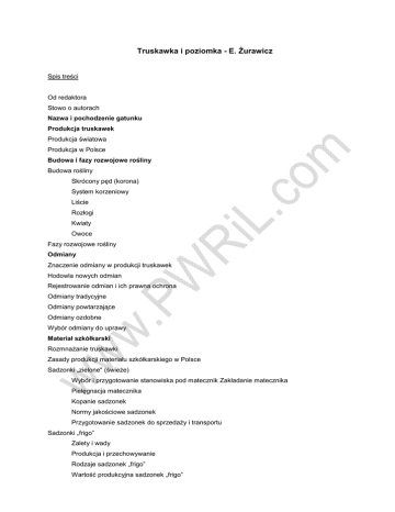 Truskawka i poziomka - E. śurawicz Spis treści Od redaktora Stowo o autorach Nazwa i pochodzenie gatunku Produkcja truskawek Produkcja światowa Produkcja w Polsce Budowa i fazy rozwojowe rośliny Budowa rośliny Skrócony pęd (korona) System korzeniowy Liście Rozłogi Kwiaty Owoce Fazy rozwojowe rośliny Odmiany Znaczenie odmiany w produkcji truskawek Hodowla nowych odmian Rejestrowanie odmian i ich prawna ochrona Odmiany tradycyjne Odmiany powtarzające Odmiany ozdobne Wybór odmiany do uprawy Materiał szkółkarski RozmnaŜanie truskawki Zasady produkcji materiału szkółkarskiego w Polsce Sadzonki „zielone" (świeŜe) Wybór i przygotowanie stanowiska pod matecznik Zakładanie matecznika Pielęgnacja matecznika Kopanie sadzonek Normy jakościowe sadzonek Przygotowanie sadzonek do sprzedaŜy i transportu Sadzonki „frigo” Zalety i wady Produkcja i przechowywanie Rodzaje sadzonek „frigo” Wartość produkcyjna sadzonek „frigo” Produkcja sadzonek „frigo" w Polsce Sadzonki z kultur in vitro Sadzonki doniczkowane Plantacja towarowa Warunki przyrodnicze Klimat Gleba Stanowisko w płodozmianie Przygotowanie pola przed załoŜeniem plantacji Odchwaszczenie NawoŜenie OdkaŜanie gleby Zakładanie plantacji Terminy sadzenia Technika sadzenia Sposoby uprawy Pielęgnowanie plantacji Zwalczanie chwastów Cel i sposoby niszczenia chwastów Herbicydy doglebowe Herbicydy dolistne Zasady i technika stosowania herbicydów NawoŜenie Dokarmianie dolistne Ściółkowanie Nawadnianie Znaczenie nawadniania Sposoby nawadniania Koszenie liści i niszczenie rozłogów Ochrona przed przymrozkami Uszkodzenia mrozowe, objawy, skutki i zapobieganie Ochrona przed szkodnikami i chorobami Szkodniki glebowe Szkodniki części nadziemnej Choroby grzybowe Choroby wirusowe i fitoplazmatyczne Zasady i technika ochrony przed szkodnikami i chorobami Zbiór i obrót owocami Wymagania w zakresie higieny Terminy zbioru Wydajność zbioru Normy jakości owoców Technika zbioru Próby zbioru mechanicznego Opakowania Przechowywanie i transport Uprawa sterowana Uprawa na zbiór przyspieszony Uprawa pod osłonami niskimi „na ptask" Uprawa w niskich tunelach foliowych Uprawa na zbiór opóźniony Uprawa odmian bardzo późnych Uprawa odmian powtarzających Opóźnienie sadzenia roślin „frigo" Uprawa pod osłonami wysokimi Sposoby uprawy Uprawa w gruncie Uprawa w wiadrach Uprawa w workach foliowych Materiał roślinny Termin sadzenia Temperatura, wietrzenie i doświetlanie Podlewanie i nawoŜenie (fertygacja) Zapylanie kwiatów Ochrona roślin Zbiór owoców Produkcja integrowana Definicja produkcji integrowanej (IP) Zakładanie plantacji Wapnowanie gleby i nawoŜenie Zwalczanie chwastów Pielęgnowanie plantacji Ochrona przed chorobami Ochrona przed szkodnikami Produkcja ekologiczna Uprawa na zbiór owoców przez nabywcę („samoobsługa") Poziomka Pochodzenie odmian Wartość odŜywcza i znaczenie gospodarcze Budowa i fazy rozwojowe rośliny Odmiany RozmnaŜanie Wymagania klimatyczne i glebowe Zakładanie plantacji Pielęgnowanie roślin Zbiór i zbyt owoców Literatura