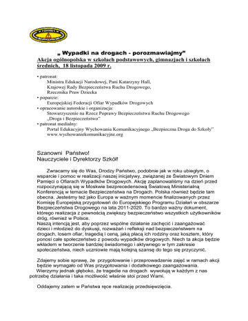 „ Wypadki na drogach - porozmawiajmy” Akcja ogólnopolska w szkołach podstawowych, gimnazjach i szkołach średnich, 18 listopada 2009 r. • patronat: Ministra Edukacji Narodowej, Pani Katarzyny Hall, Krajowej Rady Bezpieczeństwa Ruchu Drogowego, Rzecznika Praw Dziecka • poparcie: Europejskiej Federacji Ofiar Wypadków Drogowych • opracowanie autorskie i organizacja: Stowarzyszenie na Rzecz Poprawy Bezpieczeństwa Ruchu Drogowego „Droga i Bezpieczeństwo” • patronat medialny: Portal Edukacyjny Wychowania Komunikacyjnego „Bezpieczna Droga do Szkoły” www.wychowaniekomunikacyjne.org Szanowni Państwo! Nauczyciele i Dyrektorzy Szkół! Zwracamy się do Was, Drodzy Państwo, podobnie jak w roku ubiegłym, o wsparcie i pomoc w realizacji naszej inicjatywy, związanej ze Światowym Dniem Pamięci o Ofiarach Wypadków Drogowych. Akcję zaplanowaliśmy na dzień przed rozpoczynającą się w Moskwie bezprecedensową Światową Ministerialną Konferencją w temacie Bezpieczeństwa na Drogach. Polska równieŜ będzie tam obecna. Jesteśmy teŜ jako Europa w waŜnym momencie finalizowanych przez Komisję Europejską przygotowań do Europejskiego Programu Działań w obszarze Bezpieczeństwa Drogowego na lata 2011-2020. To bardzo waŜny dokument, którego realizacja z pewnością zwiększy bezpieczeństwo wszystkich uŜytkowników dróg, równieŜ w Polsce. Naszą intencją jest, aby poprzez wspólne działanie zachęcić i zaangaŜować dzieci i młodzieŜ do dyskusji, rozwaŜań i refleksji nad bezpieczeństwem na drogach, losem ofiar, tragedią i ceną, jaką płacą ich rodziny oraz kosztem, który ponosi całe społeczeństwo z powodu wypadków drogowych. Niech ta akcja będzie wkładem w tworzenie bardziej świadomego i aktywnego w tym zakresie społeczeństwa, niech uczniowie mają kolejną szansę do tego się przyczynić. Zdajemy sobie sprawę, Ŝe przygotowanie i przeprowadzenie zajęć w ramach akcji będzie wymagało od Was przygotowania i dodatkowego zaangaŜowania. Wierzymy jednak głęboko, Ŝe tragedie na drogach wywołują w kaŜdym z nas potrzebę działania i taka moŜliwość właśnie stoi przed Wami. Oddajemy zatem w Państwa ręce realizację przedsięwzięcia. Dla ułatwienia i wsparcia Waszej pracy przygotowaliśmy specjalny zestaw materiałów, który z pewnością usprawni i wzbogaci zajęcia. Prosimy o zapoznanie się z nim i w zaleŜności od wieku uczniów o dokonanie wyboru, które elementy wykorzystać w trakcie realizacji zajęć. W Programie przedsięwzięcia znaleźć moŜna takŜe dodatkowe propozycje dla działań uzupełniających, towarzyszących akcji. Na potrzeby akcji, podobnie jak w roku ubiegłym, uruchomiony zostanie specjalny adres poczty elektronicznej, na który moŜna będzie przekazywać relacje z przebiegu działań, a uczniowie będą mogli podzielić się za jego pośrednictwem swoimi przemyśleniami. Szczegóły zawarto w regulaminie uczestnictwa. Adres poczty podamy na krótko przed datą realizacji akcji. Najciekawsze wypowiedzi zostaną wyróŜnione i nagrodzone. Powodzenia! Stowarzyszenie „Droga i Bezpieczeństwo” Prezes Ryszard FonŜychowski Informacje i wskazówki dla nauczycieli, dotyczące przeprowadzenia akcji „ Wypadki na drogach - porozmawiajmy” Informacje ogólne Przebieg akcji zaplanowano do przeprowadzenia jednoetapowo, 18 listopada 2009 r. ( 3 dni po Światowym Dniu Pamięci o Ofiarach Wypadków Drogowych ) Akcja dotyczy uczniów szkół podstawowych ( klasy I – VI ) , gimnazjów ( klasy I – III ), szkół średnich ( wszystkie klasy ) oraz najstarszych oddziałów przedszkolnych Geneza W Polsce w 2008 roku na drogach zginęło 5.437 osób a rannych zostało 62 097, nasz kraj przoduje w europejskich statystykach pod względem ilości i cięŜkości wypadków drogowych. Co roku na polskich drogach ginie średnio 14,6 na 100.000 mieszkańców, to trzykrotnie więcej niŜ średnia europejska. Polska stanowi nadal „czarny punkt” na mapie Europy a problemy związane z bezpieczeństwem ruchu drogowego dotyczą nas wszystkich, tak jak wszyscy odczuwamy społeczne i ekonomiczne skutki wypadków drogowych. Im bardziej dzieci i młodzieŜ będą świadome zagroŜeń ruchu drogowego i konsekwencji, jakie generują wypadki , tym łatwiej będzie egzekwować przepisy i poprawiać bezpieczeństwo wszystkich uŜytkowników dróg. Cel UmoŜliwienie dzieciom i młodzieŜy wyraŜenia swoich poglądów i odczuć w temacie w sposób spontaniczny i nieskrępowany pod opieką i dyskretną kontrolą nauczyciela w klasie, w czasie co najmniej jednej wybranej lekcji. ZałoŜenia Uczniowie po wcześniejszym zapoznaniu się ze statystykami drogowymi i konsekwencjami wypadków oraz sytuacją ofiar i ich rodzin, podejmą aktywnie dyskusję, opowiedzą o swoich doświadczeniach, obawach, wątpliwościach, podzielą się wnioskami i pomysłami, dotyczącymi tematu. Nieskrępowana wypowiedź da im szansę zaistnienia w roli podmiotu a nie tylko słuchacza. Forma Dyskusja, wywołana pytaniami nauczyciela i wypowiedziami uczniów. WaŜne! Do udziału w zajęciach moŜna zaprosić osoby, które uczestniczyły w wypadku drogowym, bądź skorzystać z relacji ofiar, lub ich rodzin. Przed rozpoczęciem zajęć prosimy o uczczenie pamięci ofiar wypadków minutą ciszy. _________________________________________________________________________ www.drogaibezpieczenstwo.org.pl