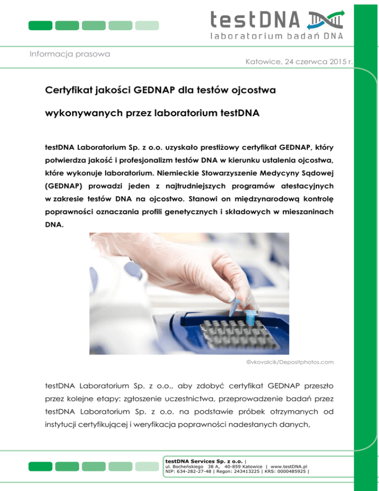 Informacja prasowa Katowice, 24 czerwca 2015 r. Certyfikat jakości GEDNAP dla testów ojcostwa wykonywanych przez laboratorium testDNA testDNA Laboratorium Sp. z o.o. uzyskało prestiżowy certyfikat GEDNAP, który potwierdza jakość i profesjonalizm testów DNA w kierunku ustalenia ojcostwa, które wykonuje laboratorium. Niemieckie Stowarzyszenie Medycyny Sądowej (GEDNAP) prowadzi jeden z najtrudniejszych programów atestacyjnych w zakresie testów DNA na ojcostwo. Stanowi on międzynarodową kontrolę poprawności oznaczania profili genetycznych i składowych w mieszaninach DNA. ©vkovalcik/Depositphotos.com testDNA Laboratorium Sp. z o.o., aby zdobyć certyfikat GEDNAP przeszło przez kolejne etapy: zgłoszenie uczestnictwa, przeprowadzenie badań przez testDNA Laboratorium Sp. z o.o. na podstawie próbek otrzymanych od instytucji certyfikującej i weryfikacja poprawności nadesłanych danych, testDNA Services Sp. z o.o. | ul. Bocheńskiego 38 A, 40-859 Katowice | www.testDNA.pl NIP: 634-282-27-48 | Regon: 243413225 | KRS: 0000485925 | Informacja prasowa Katowice, 24 czerwca 2015 r. a następnie przyznanie atestów. Pozytywne przejście wszystkich etapów jest dowodem wysokiej jakości analiz wykonywanych w laboratorium. testDNA pierwszy Certyfikat GEDNAP uzyskało już w 2009 roku. Kolejna atestacja dowodzi o wysokiej jakości oferowanych usług i utrzymywaniu wysokiego poziomu analiz. - Przyznanie certyfikatu to dla nas duży zaszczyt. Jest to dokument, który świadczy o naszej niezawodności - mówi Krystyna Szymczyk, koordynator działu laboratoryjnego. Laboratoria genetyczne poddają się regularnym kontrolom zewnętrznym, aby uzyskać certyfikaty potwierdzające jakość wykonywanych usług. Certyfikaty są dla klientów potwierdzeniem, że zlecając badanie w danym laboratorium, uzyskają pewny i wiarygodny wynik. Zobacz certyfikat Kontakt: Tina Pysiewicz; tel. 32-445-34-26, e-mail [email protected] Więcej informacji: www.testdna.pl testDNA od ponad 10 lat specjalizuje się w analizach ojcostwa, pokrewieństwa oraz w diagnostyce medycznej. Jakość przeprowadzanych badań jest potwierdzona międzynarodowymi certyfikatami, z firmą współpracują również sądy i prokuratura. Centralny Oddział Laboratorium znajduje się w Katowicach a badania genetyczne dostępne są na terenie całego kraju dzięki współpracy z blisko 200 punktami pobrań i specjalistami. testDNA Services Sp. z o.o. | ul. Bocheńskiego 38 A, 40-859 Katowice | www.testDNA.pl NIP: 634-282-27-48 | Regon: 243413225 | KRS: 0000485925 |