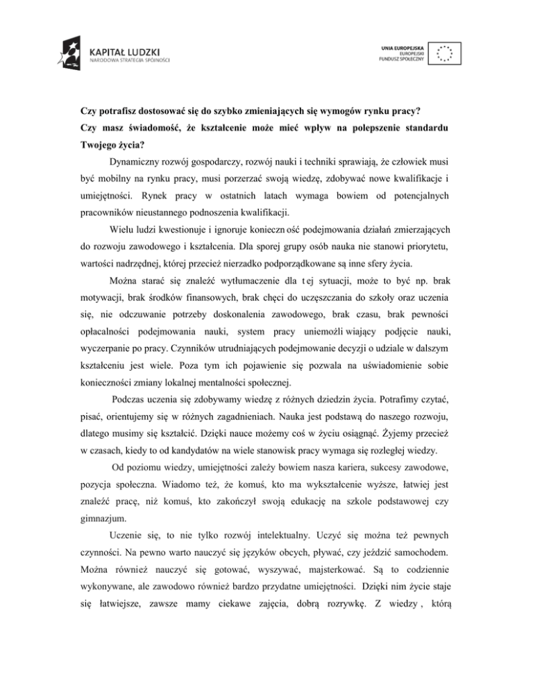 Czy potrafisz dostosować się do szybko zmieniających się wymogów rynku pracy? Czy masz świadomość, że kształcenie może mieć wpływ na polepszenie standardu Twojego życia? Dynamiczny rozwój gospodarczy, rozwój nauki i techniki sprawiają, że człowiek musi być mobilny na rynku pracy, musi porzerzać swoją wiedzę, zdobywać nowe kwalifikacje i umiejętności. Rynek pracy w ostatnich latach wymaga bowiem od potencjalnych pracowników nieustannego podnoszenia kwalifikacji. Wielu ludzi kwestionuje i ignoruje konieczn ość podejmowania działań zmierzających do rozwoju zawodowego i kształcenia. Dla sporej grupy osób nauka nie stanowi priorytetu, wartości nadrzędnej, której przecież nierzadko podporządkowane są inne sfery życia. Można starać się znaleźć wytłumaczenie dla t ej sytuacji, może to być np. brak motywacji, brak środków finansowych, brak chęci do uczęszczania do szkoły oraz uczenia się, nie odczuwanie potrzeby doskonalenia zawodowego, brak czasu, brak pewności opłacalności podejmowania nauki, system pracy uniemożli wiający podjęcie nauki, wyczerpanie po pracy. Czynników utrudniających podejmowanie decyzji o udziale w dalszym kształceniu jest wiele. Poza tym ich pojawienie się pozwala na uświadomienie sobie konieczności zmiany lokalnej mentalności społecznej. Podczas uczenia się zdobywamy wiedzę z różnych dziedzin życia. Potrafimy czytać, pisać, orientujemy się w różnych zagadnieniach. Nauka jest podstawą do naszego rozwoju, dlatego musimy się kształcić. Dzięki nauce możemy coś w życiu osiągnąć. Żyjemy przecież w czasach, kiedy to od kandydatów na wiele stanowisk pracy wymaga się rozległej wiedzy. Od poziomu wiedzy, umiejętności zależy bowiem nasza kariera, sukcesy zawodowe, pozycja społeczna. Wiadomo też, że komuś, kto ma wykształcenie wyższe, łatwiej jest znaleźć pracę, niż komuś, kto zakończył swoją edukację na szkole podstawowej czy gimnazjum. Uczenie się, to nie tylko rozwój intelektualny. Uczyć się można też pewnych czynności. Na pewno warto nauczyć się języków obcych, pływać, czy jeździć samochodem. Można również nauczyć się gotować, wyszywać, majsterkować. Są to codziennie wykonywane, ale zawodowo również bardzo przydatne umiejętności. Dzięki nim życie staje się łatwiejsze, zawsze mamy ciekawe zajęcia, dobrą rozrywkę. Z wiedzy , którą zdobyliśmy mogą skorzystać inni ludzie. Nauczyciele też kiedyś zdobywali wiedzę, żeby teraz móc ją przekazać swoim uczniom. Nauka i wykształcenie przynoszą wiele korzyści, które można przełożyć na sferę społeczną, materialną, towarzyską, rodzinną , prestiż społeczny. Zdobywanie wykształcenia pomaga w karierze i realizacji wielu życiowych celów. Niektórzy doceniają walory intelektualne, rozwój zainteresowań, pogłębianie wiedzy. Dla wielu ludzi jest ono źródłem satysfakcji i spełnienia. Zdobycie wykształcenia poprawia samoocenę, dodaje wiary w siebie, pomaga w zrozumieniu świata i ludzi, w nawiązywaniu kontaktów towarzyskich, naukowych i zawodowych. Wykształcenie daje również poczucie bezpieczeństwa, gwarantuje, że na wypadek utraty pracy lub innych ż yciowych zawirowań łatwiej znaleźć inne zajęcie i rozwiązać życiowe problemy. Jest również impulsem do podejmowania kolejnych wyzwań, poszerzania wiedzy, zdobywania nowych umiejętności i wiadomości. To również przepustka do sukcesu, osiągnięcia spokoju i życiowej stabilizacji. Otwiera drzwi do kariery, do satysfakcjonującej, godnej i dobrze płatnej pracy zawodowej. Wykształcenie to coś, co zdobywa się „na zawsze”, „co się ma” i „czego nikt nie odbierze”. Bardzo dużą możliwość inwestowania w kapitał ludzk i daje nam Europejski Fundusz Społeczny, który wspiera zatrudnienie, pomaga zdobywać lepsze wykształcenie i umiejętności. To z kolei zwiększa szanse na rynku pracy. Ze środków Europejskiego Funduszu Społecznego finansowane są między innymi szkolenia i prak tyki zawodowe, stypendia, studia magisterskie i studia podypl omowe. Dzięki Europejskiemu Funduszu Społecznemu można znacznie ograniczyć wydatki związane z kształceniem i cały czas podnosić swoje kwalifikacje. Pamiętajmy, że edukacja jest najlepszą inwest ycją w człowieka. To, czego nauczymy się dziś- zaprocentuje jutro!