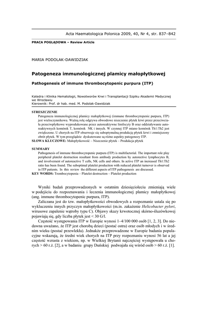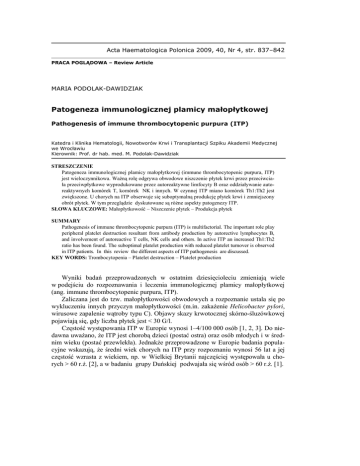 Acta Haematologica Polonica 2009, 40, Nr 4, str. 837–842 PRACA POGLĄDOWA – Review Article MARIA PODOLAK-DAWIDZIAK Patogeneza immunologicznej plamicy małopłytkowej Pathogenesis of immune thrombocytopenic purpura (ITP) Katedra i Klinika Hematologii, Nowotworów Krwi i Transplantacji Szpiku Akademii Medycznej we Wrocławiu Kierownik: Prof. dr hab. med. M. Podolak-Dawidziak STRESZCZENIE Patogeneza immunologicznej plamicy małopłytkowej (immune thrombocytopenic purpura, ITP) jest wieloczynnikowa. WaŜną rolę odgrywa obwodowe niszczenie płytek krwi przez przeciwciała przeciwpłytkowe wyprodukowane przez autoreaktywne limfocyty B oraz oddziaływanie autoreaktywnych komórek T, komórek NK i innych. W czynnej ITP miano komórek Th1:Th2 jest zwiększone. U chorych na ITP obserwuje się suboptymalną produkcję płytek krwi i zmniejszony obrót płytek. W tym przeglądzie dyskutowane są róŜne aspekty patogenezy ITP. SŁOWA KLUCZOWE: Małopłytkowość – Niszczenie płytek – Produkcja płytek SUMMARY Pathogenesis of immune thrombocytopenic purpura (ITP) is multifactorial. The important role play peripheral platelet destruction resultant from antibody production by autorective lymphocytes B, and involvement of autoreactive T cells, NK cells and others. In active ITP an increased Th1:Th2 ratio has been found. The suboptimal platelet production with reduced platelet turnover is observed in ITP patients. In this review the different aspects of ITP pathogenesis are discussed. KEY WORDS: Trombocytopenia – Platelet destruction – Platelet production Wyniki badań przeprowadzonych w ostatnim dziesięcioleciu zmieniają wiele w podejściu do rozpoznawania i leczenia immunologicznej plamicy małopłytkowej (ang. immune thrombocytopenic purpura, ITP). Zaliczana jest do tzw. małopłytkowości obwodowych a rozpoznanie ustala się po wykluczeniu innych przyczyn małopłytkowości (m.in. zakaŜenie Helicobacter pylori, wirusowe zapalenie wątroby typu C). Objawy skazy krwotocznej skórno-śluzówkowej pojawiają się, gdy liczba płytek jest < 30 G/l. Częstość występowania ITP w Europie wynosi 1–4/100 000 osób [1, 2, 3]. Do niedawna uwaŜano, Ŝe ITP jest chorobą dzieci (postać ostra) oraz osób młodych i w średnim wieku (postać przewlekła). JednakŜe przeprowadzone w Europie badania populacyjne wskazują, Ŝe średni wiek chorych na ITP przy rozpoznaniu wynosi 56 lat a jej częstość wzrasta z wiekiem, np. w Wielkiej Brytanii najczęściej występowała u chorych > 60 r.Ŝ. [2], a w badaniu grupy Duńskiej podwajała się wśród osób > 60 r.Ŝ. [1]. 838 M. PODOLAK-DAWIDZIAK Konieczne jest teŜ zweryfikowanie poglądu na relację między płcią chorych a częstością ITP. Kobiety chorują na ITP częściej niŜ męŜczyźni 2–3-krotnie < 60 r.Ŝ. [1], choć ta przewaga nie jest obecna w kaŜdej populacji [2], a w starszym wieku znika. Patogeneza immunologicznej plamicy małpłytkowej wciąŜ nie jest w pełni wyjaśniona. Przez wiele lat za główną przyczynę ITP uznawano przyśpieszone niszczenie płytek krwi, to obecnie zwraca się uwagę takŜe na nieadekwatną ich produkcję [4, 5, 6, 7]. W tabeli 1 zestawiono przyczyny małopłytkowej plamicy immunologicznej. Tabela 1. Przyczyny ITP. Mechanizm Nieprawidłowa humoralna i/lub komórkowa odpowiedź odpornościowa Zmiana Produkcja autoprzeciwciał przeciwpłytkowych przez autoreaktywne limfocyty B Nieprawidłowa immunologiczna odpowiedź komórkowa (autoreaktywne limfocyty T) Cytotoksyczność zaleŜna od limfocytów T Aktywacja naturalnych komórek zabijających (NK) Zaburzenie produkcji płytek krwi Hamowanie megakriocytopoezy i trombopoezy przez przeciwciała przeciwpłytkowe Zaburzenie wydzielania trombopoetyny Legenda: NK, natural killer – naturalne komórki zabijające Nieznana przyczyna prowadząca do zaburzenia tolerancji immunologicznej sprawia, Ŝe w ITP własne antygeny płytkowe stają się immunogenne, co pobudza komórki układu odpornościowego, limfocyty B i cytotoksyczne limfocyty T. Przeciwciała przeciwpłytkowe są produkowane przez autoreaktywne limfocyty B, ale waŜną rolę w tym procesie odgrywają teŜ autoreaktywne komórki T CD4+. Produkcja przeciwciał przeciwpłytkowych odbywa się głównie w śledzionie [8, 9]. Przeciwciała te naleŜą najczęściej do klasy IgG (IgG3), ale mogą teŜ być IgM lub IgA [10]. Bezpośrednie badanie autoprzeciwciał przeciw glikoproteinom powierzchni płytek pozwala na ich wykrycie u około 60% chorych na ITP w ostrej fazie choroby [11], a u niektórych chorych są nadal obecne mimo remisji [12]. Przeciwciała przeciwpłytkowe są skierowane w głównie przeciw glikoproteinom IIb/IIIa i Ib/IX płytek (75%), a rzadziej przeciw innym, tj. GP IIaIIIa, IV i V [13]. Płytki krwi ze „zmienionymi” antygenami krąŜą we krwi i początkowa odpowiedź odpornościowa następuje w śledzionie, w szpiku kostnym i innych miejscach zawierających tkankę chłonną. Powstają swoiste antygenowo komórki pamięci i wzbudzona zostaje uogólniona odpowiedź odpornościowa (produkcja przeciwciał, aktywacja cytotoksycznych limfocytów T). U większości chorych na ITP destrukcja opłaszczonych przeciwciałami IgG płytek krwi następuje głównie w monocytach/makrofagach śledziony, rzadziej wątroby. Ludzkie monocyty/makrofagi posiadają receptory Fcγ, które swoiście wbudowują IgG [14], najwaŜniejszą rolę odgrywają receptory o niskim powinowactwie Fcγ-RIIA i Fcγ- Patogeneza immunologicznej plamicy małopłytkowej 839 RIIIaA. Następuje fagocytoza płytek krwi, ich internalizacja, degradacja i usunięcie z krąŜenia. W makrofagu glikoproteiny płytkowe są rozszczepiane do białek i na powierzchni makrofaga pojawiają się liczne kryptowe epitopy cząsteczek GPIIb i GPIIIa. U zdrowych epitopy te są niedostępne dla układu odpornościowego i być moŜe ich ekspozycja następuje tylko w nieznanych określonych warunkach, np. w stanie zapalnym [15]. Autoprzeci