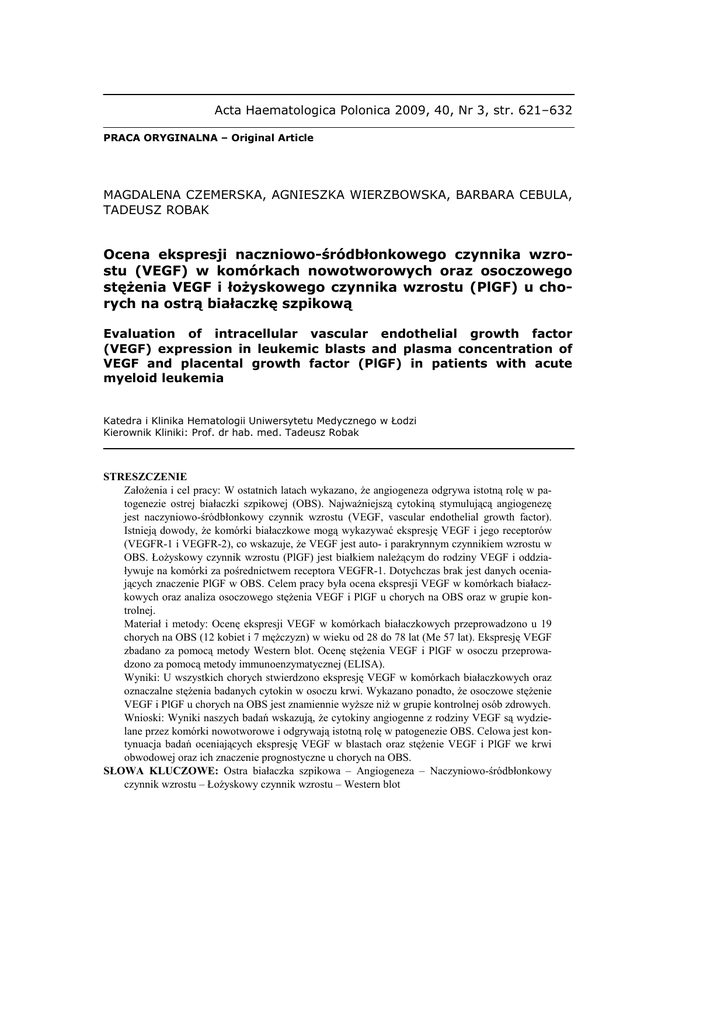 Acta Haematologica Polonica 2009, 40, Nr 3, str. 621–632 PRACA ORYGINALNA – Original Article MAGDALENA CZEMERSKA, AGNIESZKA WIERZBOWSKA, BARBARA CEBULA, TADEUSZ ROBAK Ocena ekspresji naczniowo-śródbłonkowego czynnika wzrostu (VEGF) w komórkach nowotworowych oraz osoczowego stęŜenia VEGF i łoŜyskowego czynnika wzrostu (PlGF) u chorych na ostrą białaczkę szpikową Evaluation of intracellular vascular endothelial growth factor (VEGF) expression in leukemic blasts and plasma concentration of VEGF and placental growth factor (PlGF) in patients with acute myeloid leukemia Katedra i Klinika Hematologii Uniwersytetu Medycznego w Łodzi Kierownik Kliniki: Prof. dr hab. med. Tadeusz Robak STRESZCZENIE ZałoŜenia i cel pracy: W ostatnich latach wykazano, Ŝe angiogeneza odgrywa istotną rolę w patogenezie ostrej białaczki szpikowej (OBS). NajwaŜniejszą cytokiną stymulującą angiogenezę jest naczyniowo-śródbłonkowy czynnik wzrostu (VEGF, vascular endothelial growth factor). Istnieją dowody, Ŝe komórki białaczkowe mogą wykazywać ekspresję VEGF i jego receptorów (VEGFR-1 i VEGFR-2), co wskazuje, Ŝe VEGF jest auto- i parakrynnym czynnikiem wzrostu w OBS. ŁoŜyskowy czynnik wzrostu (PlGF) jest białkiem naleŜącym do rodziny VEGF i oddziaływuje na komórki za pośrednictwem receptora VEGFR-1. Dotychczas brak jest danych oceniających znaczenie PlGF w OBS. Celem pracy była ocena ekspresji VEGF w komórkach białaczkowych oraz analiza osoczowego stęŜenia VEGF i PlGF u chorych na OBS oraz w grupie kontrolnej. Materiał i metody: Ocenę ekspresji VEGF w komórkach białaczkowych przeprowadzono u 19 chorych na OBS (12 kobiet i 7 męŜczyzn) w wieku od 28 do 78 lat (Me 57 lat). Ekspresję VEGF zbadano za pomocą metody Western blot. Ocenę stęŜenia VEGF i PlGF w osoczu przeprowadzono za pomocą metody immunoenzymatycznej (ELISA). Wyniki: U wszystkich chorych stwierdzono ekspresję VEGF w komórkach białaczkowych oraz oznaczalne stęŜenia badanych cytokin w osoczu krwi. Wykazano ponadto, Ŝe osoczowe stęŜenie VEGF i PlGF u chorych na OBS jest znamiennie wyŜsze niŜ w grupie kontrolnej osób zdrowych. Wnioski: Wyniki naszych badań wskazują, Ŝe cytokiny angiogenne z rodziny VEGF są wydzielane przez komórki nowotworowe i odgrywają istotną rolę w patogenezie OBS. Celowa jest kontynuacja badań oceniających ekspresję VEGF w blastach oraz stęŜenie VEGF i PlGF we krwi obwodowej oraz ich znaczenie prognostyczne u chorych na OBS. SŁOWA KLUCZOWE: Ostra białaczka szpikowa – Angiogeneza – Naczyniowo-śródbłonkowy czynnik wzrostu – ŁoŜyskowy czynnik wzrostu – Western blot 622 M. Czemerska i wsp. SUMMARY Background and aim: Angiogenesis plays an important role in the biology of acute myeloid leukemia and VEGF is known to be the most important angiogenic factor. It has been reported that AML blasts express both VEGF and its receptors (VEGFR-1 and VEGFR-2). It may suggest that VEGF can be auto- and paracrine growth factor for the leukemic cells. Placental growth factor (PlGF) is a member of VEGF protein family. PlGF exerts its biologic effect via VEGFR-1. The role of PlGF in AML biology has not been analyzed so far. The aim of this study was to assess the expression of intracellular VEGF in leukemic blasts and plasma VEGF and PlGF concentration in AML patients and control group. Material and methods: The evaluation of intracellular VEGF was performed in 19 patients with newly diagnosed AML (12 women and 7 men) in age from 28 to 78 years (Me 57 years). The expression of VEGF was estimated by Western blot method. Plasma VEGF and PlGF levels were measured using an enzyme-linked immunoadsorbent assay (ELISA). Results: The expression of VEGF was detected in blasts from all patients with AML. The plasma concentration of VEGF and PlGF in AML patients was significantly higher than those detected in the healthy control group. Conclusions: Results of our study indicate that VEGF-type angiogenic cytokines play an important role in pathogenesis of acute myeloid leukemia and that leukemic blasts are the main source of them. The further studies on VEGF-type cytokines are needed to better determine their prognostic and therapeutic value in AML. KEY WORDS: Acute myeloid leukemia – Angiogenesis – Vascular endothelial growth factor – Placental growth factor – Western blot WSTĘP W ostatnich latach wykazano, Ŝe angiogeneza odgrywa waŜną rolę w etiopatogenezie ostrej białaczki szpikowej (OBS) [1]. Istotą tego złoŜonego i wieloetapowego procesu jest tworzenie nowych naczyń krwionośnych z istniejącej sieci naczyniowej [2]. Głównym stymulatorem angiogenezy jest VEGF, który pobudza aktywację i proliferację komórek śródbłonka i w konsekwencji, tworzenie sieci drobnych naczyń krwionośnych [3]. VEGF wykazuje znaczne podobieństwo do płytkopochodnego czynnika wzrostu (PDGF – platelet-derived growth factor) [3]. Gen dla VEGF zlokalizowany jest w obrębie chromosomu 6 (6p21.3) i zawiera 8 egzonów przedzielonych 7 intronami [4]. Podczas obróbki mRNA, na skutek alternatywnego składania genu (splicing), powstają izoformy naczyniowo-śródbłonkowego czynnika wzrostu o róŜnej długości łańcucha aminokwasowego: VEGF121, VEGF165, VEGF189, VEGF206, VEGF145, VEGF183, VEGF162 i VEGF165b [5–9]. Dominującą izoformą jest VEGF165. Jest to homodimeryczna glikoproteina o masie cząsteczkowej 45 kDa [10]. VEGF, zwany równieŜ VEGF-A, naleŜy do rodziny białek, wśród których wyróŜnia się takŜe VEGF-B, VEGF-C, VEGF-D, VEGF-E oraz łoŜyskowy czynnik wzrostu (PlGF, placenta growth factor) [11]. VEGF wywołuje swój efekt biologiczny poprzez wiązanie z jednym ze swoistych receptorów, naleŜących do grupy receptorów kinazy tyrozynowej: VEGFR-1 (FLT-1 – fms-like tyrosine kinase-1) [12], VEGFR-2 (KDR – kinase insert domain-containing receptor/flk-1 – fetal liver kinase-1) [13] lub VEGFR-3 (FLT4) [14]. Ocena ekspresji naczyniowo-śródbłonk