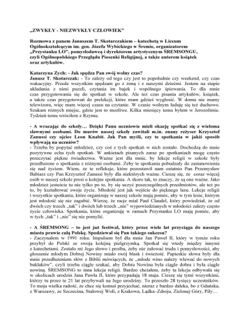„ZWYKŁY - NIEZWYKŁY CZŁOWIEK” Rozmowa z panem Januszem T. Skotarczakiem – katechetą w Liceum Ogólnokształcącym im. gen. Józefa Wybickiego w Śremie, organizatorem „Przystanku LO”, pomysłodawcą i dyrektorem artystycznym ŚREMSONGU, czyli Ogólnopolskiego Przeglądu Piosenki Religijnej, a także autorem książek oraz artykułów. Katarzyna Zych: - Jak spędza Pan swój wolny czas? Janusz T. Skotarczak: - To zależy od tego czy jest to popołudnie czy weekend, czy czas wakacyjny. Przede wszystkim spędzam go z żoną i z naszymi dziećmi. Jestem na etapie układania z nimi puzzli, czytania im bajek i wspólnego śpiewania. To dla mnie czas przygotowania się do spotkań w szkole. Ale też czas pisania artykułów, książek, a także czas przygotowań do prelekcji, które mam gdzieś wygłosić. W domu nie mamy telewizora, więc mam więcej czasu na czytanie. W czasie wolnym ładuję się też duchowo. Szukam różnych miejsc, gdzie jest to możliwe. Kilka miesięcy temu byłem w Jerozolimie. Tydzień temu wróciłem z Rzymu. - A wracając do szkoły… Dzięki Panu uczniowie mieli okazję spotkać się z wieloma sławnymi osobami. Do murów naszej szkoły zawitali m.in. znany reżyser Krzysztof Zanussi czy ojciec Leon Knabit. Jak Pan myśli, czy te spotkania w jakiś sposób wpływają na uczniów? - Trzeba by popytać młodzież, czy coś z tych spotkań w nich zostało. Dochodzą do mnie pozytywne echa tych spotkań. W ankietach pisanych zaraz po spotkaniach mogę często przeczytać piękne świadectwa. Ważne jest dla mnie, by lekcje religii w szkole były przedłużone o spotkania z różnymi osobami. Żeby te spotkania pobudzały do zastanowienia się nad życiem. Wiem, że te refleksje, które pozostawił nam ostatnio Pan Przemysław Babiarz czy Pan Krzysztof Zanussi były dla niektórych ważne. Cieszę się, że coraz więcej osób w naszej szkole prosi o kolejne spotkania. A skoro tak, to znaczy, że są one ważne. Jako młodzież jesteście tu nie tylko po to, by się uczyć poszczególnych przedmiotów, ale też po to, by kształtować swoje życie. Młodość jest jak wejście do pięknego lasu. Lekcje religii i wszystkie spotkania, które organizuję w naszej szkole mają pomóc, aby w tym lesie, którym jest młodość się nie zagubić. Wierzę, że racje miał Paul Claudel, który powiedział, że od dwóch czy trzech ,,tak” i dwóch lub trzech ,,nie” wypowiedzianych w młodości zależy często życie człowieka. Spotkania, które organizuję w ramach Przystanku LO mają pomóc, aby w tych ,,tak” i ,,nie” się nie pomylić. - A ŚREMSONG – to jest już festiwal, który przez wiele lat przyciąga do naszego miasta prawie całą Polskę. Spodziewał się Pan takiego sukcesu? - Zaczynałem w 1991 roku. Impulsem był dla mnie Jan Paweł II, który w tymże roku przybył do Polski ze swoją kolejną pielgrzymką. Spotkał się wtedy między innymi z katechetami. Zostało mi Jego słowo i prośba, żeby nie żałować trudu i pomysłowości, aby głoszenie młodym Dobrej Nowiny miało swój blask i świeżość. Papieskie słowa były dla mnie przedłużeniem słów z Biblii mówiących, że ,,młode wino należy wlewać do nowych bukłaków”, czyli trzeba ciągle szukać, aby Dobra Nowina była ciągle dobra i była ciągle nowiną. ŚREMSONG to inna lekcja religii. Bardzo chciałem, żeby ta lekcja odbywała się w okolicach urodzin Jana Pawła II, które przypadają 18 maja. Cieszę się tymi wszystkimi, którzy tu przez te 21 lat przybywali na Jego urodziny. To przeszło 28 tysięcy uczestników. To moja wielka radość, że chce się komuś przyjechać, nieraz z bardzo daleka, bo z Gdańska, z Warszawy, ze Szczecina, Stalowej Woli, z Krakowa, Lądka–Zdroju, Zielonej Góry, Piły… - Jak to się stało, że w śremskim liceum pojawiły się Zaduszki Muzyczne? - Jestem człowiekiem listopadowym. Urodziłem się 1 listopada, więc wszystkie urodziny spędzam na cmentarzu. To nie jest bez znaczenia. Nie każdy w swoje urodziny wędruje na cmentarz. Ten dzień mówi mi o życiu, o śmierci, o świętych i o wszystkich zmarłych. Na lekcjach religii modliliśmy się najpierw za wszystkich naszych bliskich zmarłych. Z czasem poprosiłem o modlitwę za zmarłych muzyków, poetów, pisarzy… Często o nich zapominamy, czytamy jakieś ich teksty czy słuchamy muzyki, ale nie zawsze za nich się modlimy. Najpierw to była modlitwa za muzyków na lekcji religii. Później jeden z uczniów nagrał mi na kasetę magnetofonową utwory zmarłych muzyków. Co lekcję odtwarzałem inną piosenkę, a później była modlitwa w intencji jej wykonawcy. Aż wreszcie pomyślałem sobie, że może byśmy ich przedstawili na żywo. No i tak powstały Zaduszki Muzyczne w naszej szkole. W zeszłym roku odbyła się już ich VI edycja. Jak wiesz, są one wydarzeniem artystycznym nie tylko w naszej szkole ale i w naszym mieście. One pokazują, jak wielkie wy - młodzież, macie talenty. - Często mówi Pan, że przychodzą do Pana uczniowie, by poprosić o modlitwę bądź o zwykłą rozmowę. Jak Pan myśli, z czego to wynika? - Myślę, że to wynika z zaufania, że katecheta to jest człowiek, który stoi przed Bogiem w imieniu swoich uczniów, a przed uczniami w imieniu Boga. Jestem po to, żeby z Panem Bogiem gadać o was i oddawać Mu wasze sprawy. Takie jak sprawdziany, czy egzamin na prawo jazdy, ale i sprawy rodzinne i bardzo osobiste. Ja po prostu zanoszę Wasze życie Panu Bogu. Cieszę się, że niektórzy odważają się, przychodzą i przedstawiają mi swoje intencje do modlitwy lub piszą sms-y. Najważniejsze, jakie dostaję, to te z prośbą o modlitwę. - Pana plany na przyszłość? - Pielęgnować ogród wiary, nadziei i miłości. Żyć pięknie z żoną i z dziećmi. Przekazać im to, co odkryłem jako najważniejsze w życiu. Przekazać też moim uczniom to, czym żyję. Żebyście nie mówili: - Aha, katecheta – to musi tak gadać. Ja m