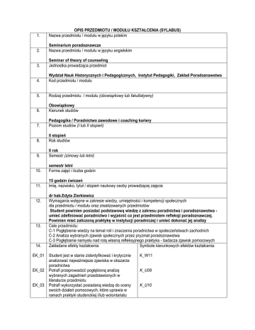 1. OPIS PRZEDMIOTU / MODUŁU KSZTAŁCENIA (SYLABUS) Nazwa przedmiotu / modułu w języku polskim 2. Seminarium poradoznawcze Nazwa przedmiotu / modułu w języku angielskim 3. Seminar of theory of counseling Jednostka prowadząca przedmiot 4. Wydział Nauk Historycznych i Pedagogicznych, Instytut Pedagogiki, Zakład Poradoznawstwa Kod przedmiotu / modułu 5. Rodzaj przedmiotu / modułu (obowiązkowy lub fakultatywny) 6. Obowiązkowy Kierunek studiów 7. Pedagogika / Poradnictwo zawodowe i coaching kariery Poziom studiów (I lub II stopień) 8. II stopień Rok studiów 9. II rok Semestr (zimowy lub letni) 10. semestr letni Forma zajęć i liczba godzin 11. 15 godzin ćwiczeń Imię, nazwisko, tytuł / stopień naukowy osoby prowadzącej zajęcia 12. 13. 14. dr hab.Edyta Zierkiewicz Wymagania wstępne w zakresie wiedzy, umiejętności i kompetencji społecznych dla przedmiotu / modułu oraz zrealizowanych przedmiotów Student powinien posiadać podstawową wiedzę z zakresu poradnictwa i poradoznawstwa umieć zdefiniować poradnictwo i wyjaśnić co jest przedmiotem refleksji poradoznawczej. Powinien mieć zaliczoną praktykę w instytucji poradniczej i umieć dokonać jej analizy Cele przedmiotu: C-1 Pogłębienie wiedzy na temat roli i znaczenia poradnictwa w społeczeństwach zachodnich C-2 Analiza wybranych zjawisk społecznych przez pryzmat poradoznawstwa C-3 Pogłębianie namysłu nad rolą własną refleksyjnego praktyka - badacza zjawisk pomocowych Zakładane efekty kształcenia: Symbole kierunkowych efektów kształcenia: EK_01 Student jest w stanie zidentyfikować i krytycznie analizować najważniejsze zjawiska w obszarze poradnictwa EK_02 Potrafi przeprowadzić pogłębioną analizę wybranych zagadnień przedstawionych w literaturze przedmiotu EK_03 Potrafi wykorzystać posiadaną wiedzę do oceny swoich działań pomocowych, które uprawia w ramach praktyki studenckiej i/lub wolontariatu K_W11 K_U09 K_U10 15. Treści programowe: 16. Jawny i ukryty program poradnictwa. Poczucie rosnącego zagrożenia w społeczeństwie ryzyka – upowszechnianie wybranych sposobów wspierania czy moda na określone problemy? Kultura terapeutyczna – nowy wzór kulturowy w społeczeństwach Zachodu - prezentacja i analiza wybranego zjawiska przez pryzmat refleksji porado znawczej. Analiza problematyki emocji i pracy emocjonalnej w naukach społecznych. Emocje w sferze publicznej – psychologizacja i edukacjonalizacja problemów społecznych - analiza przypadku własnej praktyki i/lub działalności wolontaryjnej. Emocje i praca emocjonalna w poradnictwie i coachingu. Zalecana literatura (podręczniki) B. Simlat-Żuk, 2012, „Emocje jako przedmiot badań socjologicznych”, (w:) W tym szaleństwie jest metoda. Jak badać społeczeństwo?, red. Agnieszka Figiel, Łukasz Rogowski, Poznań: Wyd. UAM, s. 43-54 G. Filipiak, 2001, „Kompetencja emocjonalna kobiet i mężczyzn a życie rodzinne”, „Roczniki Socjologii Rodziny”, t. XIII, s. 197-207 U. Beck, Społeczeństwo ryzyka, Warszawa, 2002 E. Illouz, Uczucia w dobie kapitalizmu, Warszawa, 2010 K. Gergen, Nasycone Ja. Dylematy współczesności w życiu współczesnym, Warszawa 2009 G. Lakoff, Kobiety, ogień i rzeczy niebezpieczne…, 2011, (rozdział: Gniew) K. Maślany „Kultura terapeutyczna” jako użyteczne narzędzie wyjaśniające dla niektórych zjawiska kultury Zachodu, (w:) Peryferie i pogranicza poradnictwa, red. E. Zierkiewicz, A. Ładyżyński, Wrocław, 2014 Paul Ekman, Emocje ujawnione. Odkryj co ludzie chcą przed tobą zataić i dowiedz się czegoś więcej o sobie, Gliwice, 2012 (rozdziały: „Emocje w różnych kulturach” oraz „Kłamstwa i emocje”, s. 19-33 oraz s. 221-237). Gerard Egan, Twarzą w twarz (rozdział: Ekspresja uczuć) Ph. Zimbardo, Psychologia i życie (rozdział: Emocje…) E. Ryś, K. Mausch, 2007, „Społeczne konstruowanie emocji”, (w:) W kręgu socjologii interpretatywnej : badania jakościowe nad tożsamością, red. nauk. Jacek Leoński i Urszula Kozłowska A. Hochschild, „Praca emocjonalna, reguły odczuwania i struktura społeczna”, (w:) Emocje w kulturze, red. M. Rajtar, J. Straczuk, Warszawa 2012, s.213-243. K. Chajbos, „Praca emocjonalna w zawodzie sędziego”, „Ruch Prawniczy, Ekonomiczny i Socjologiczny”, rok LXXV, 2013, z. 1, s. 267-280 L. Cichobłaziński, 2013, „Rola emocji w pracy mediatora w sporach zbiorowych”, „Przegląd Socjologii Jakościowej”, t. 9, nr 2, s. 152‒163 J. Fengler, „Pomaganie męczy” 17. Forma zaliczenia poszczególnych komponentów przedmiotu / modułu, sposób sprawdzenia osiągnięcia zamierzonych efektów kształcenia: 2. Ćwiczenia: - identyfikowanie i krytyczne analizowanie najważniejszych zjawisk w obszarze poradnictwa - – EK_01 (K_W11) - umiejętność przeprowadzenia pogłębionej analizy wybranych zagadnień przedstawionych w literaturze przedmiotu – EK_02 (K_U09) - umiejętność wykorzystania posiadanej wiedzy do oceny swoich działań pomocowych, które uprawia w ramach praktyki studenckiej i/lub wolontariatu – EK_03 (K_U10) Kryteria oceny: - ocena bardzo dobra – student ma ugruntowaną wiedzę z zakresu poruszanych zagadnień związanych z poradnictwem i poradoznawstwem (tj. z kulturą terapeutyczną oraz rolą i miejscem zarządzania emocjonalnego we współczesnym poradnictwie i świecie społecznym), potrafi je sprawnie analizować, pokazywać powiązania z szerszą problematyką poradoznawczą i wykorzystywać zdobytą wiedzę w ramach praktyki studenckiej - ocena dobra – student na dobrym poziomie opanował wiedzę z zakresu poruszanych zagadnień związanych z poradnictwem i poradoznawstwem (tj. z kulturą terapeutyczną oraz rolą i miejscem zarządzania emocjonalnego we współczesnym poradnictwie i świecie społecznym), posiada umiejętność wyciągania wniosków na temat pracy doradcy z emocjami klienta oraz przy wsparciu koordynatora praktyk wdrażać zdobytą wiedzę do działań podejmowanych 