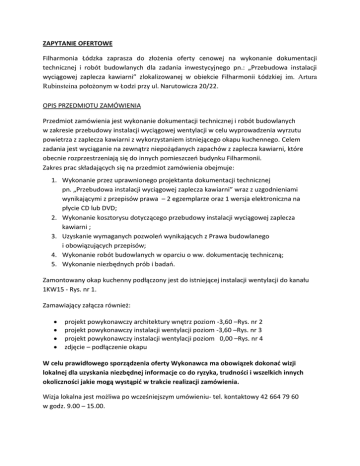 ZAPYTANIE OFERTOWE Filharmonia Łódzka zaprasza do złożenia oferty cenowej na wykonanie dokumentacji technicznej i robót budowlanych dla zadania inwestycyjnego pn.: „Przebudowa instalacji wyciągowej zaplecza kawiarni” zlokalizowanej w obiekcie Filharmonii Łódzkiej im. Artura Rubinsteina położonym w Łodzi przy ul. Narutowicza 20/22. OPIS PRZEDMIOTU ZAMÓWIENIA Przedmiot zamówienia jest wykonanie dokumentacji technicznej i robót budowlanych w zakresie przebudowy instalacji wyciągowej wentylacji w celu wyprowadzenia wyrzutu powietrza z zaplecza kawiarni z wykorzystaniem istniejącego okapu kuchennego. Celem zadania jest wyciąganie na zewnątrz niepożądanych zapachów z zaplecza kawiarni, które obecnie rozprzestrzeniają się do innych pomieszczeń budynku Filharmonii. Zakres prac składających się na przedmiot zamówienia obejmuje: 1. Wykonanie przez uprawnionego projektanta dokumentacji technicznej pn. „Przebudowa instalacji wyciągowej zaplecza kawiarni” wraz z uzgodnieniami wynikającymi z przepisów prawa – 2 egzemplarze oraz 1 wersja elektroniczna na płycie CD lub DVD; 2. Wykonanie kosztorysu dotyczącego przebudowy instalacji wyciągowej zaplecza kawiarni ; 3. Uzyskanie wymaganych pozwoleń wynikających z Prawa budowlanego i obowiązujących przepisów; 4. Wykonanie robót budowlanych w oparciu o ww. dokumentację techniczną; 5. Wykonanie niezbędnych prób i badań. Zamontowany okap kuchenny podłączony jest do istniejącej instalacji wentylacji do kanału 1KW15 - Rys. nr 1. Zamawiający załącza również: projekt powykonawczy architektury wnętrz poziom -3,60 –Rys. nr 2 projekt powykonawczy instalacji wentylacji poziom -3,60 –Rys. nr 3 projekt powykonawczy instalacji wentylacji poziom 0,00 –Rys. nr 4 zdjęcie – podłączenie okapu W celu prawidłowego sporządzenia oferty Wykonawca ma obowiązek dokonać wizji lokalnej dla uzyskania niezbędnej informacje co do ryzyka, trudności i wszelkich innych okoliczności jakie mogą wystąpić w trakcie realizacji zamówienia. Wizja lokalna jest możliwa po wcześniejszym umówieniu- tel. kontaktowy 42 664 79 60 w godz. 9.00 – 15.00. Złożona oferta powinna obejmować wszelkie koszty związane z realizacją zamówienia, w tym koszty związane z uzyskaniem wszelkich pozwoleń i uzgodnień oraz koszty związane z zabezpieczeniem przed zniszczeniem elementów obiektu FŁ oraz przylegających terenów i obiektów, koszty związane z doprowadzeniem do stanu pierwotnego otoczenia i miejsc w których prowadzone były roboty. Sposób prowadzenia robót budowlanych powinien być dostosowany do specyfiki, charakteru i położenia obiektu Filharmonii. Za wykonane roboty obowiązuje cena ryczałtowa, obejmująca cały zakres robót koniecznych do wykonania ww. przebudowy (w tym dokumentacji technicznej) instalacji wyciągowej wentylacji. Za roboty nie ujęte w kalkulacji kosztów przedstawionej w ofercie, a konieczne do wykonania przy realizacji przedmiotu zamówienia, Wykonawca nie otrzyma dodatkowego wynagrodzenia. Kosztorys wykonany przez Wykonawcę pomocny będzie bądź w przypadku konieczności obniżenia wynagrodzenia z tytułu wadliwie wykonanej części prac, bądź w przypadku kiedy Zamawiający zrezygnuje z części zakresu prac ujętych w kosztorysie (wynagrodzenie ryczałtowe zostanie pomniejszone o wartość tych prac). Przedmiot zamówienia należy wykonać zgodnie z zasadami wiedzy technicznej oraz obowiązującymi przepisami i normami, przepisami BHP i p.poż. (w tym przepisami BHP i p.poż. obowiązującymi w Filharmonii Łódzkiej) jak też warunkami zawartej przez strony umowy. Filharmonia Łódzka jest w posiadaniu dokumentacji projektowej powykonawczej opracowanej dla budynku przekazanej w dniu przekazania nowo-wybudowanego obiektu do użytkowania (dokumentacja z 2004r.), która może zostać udostępniona w siedzibie Zamawiającego – po wcześniejszym umówieniu tel. kontaktowy 42 664 79 60 w godz. 9.00 – 15.00. TERMIN WYKONANIA ZAMÓWIENIA Termin wykonania usługi: od dnia podpisania umowy do dnia 28.08.2015 r. MIEJSCE, TERMIN ORAZ WARUNKI FORMALNE SKŁADANIA OFERT Oferty proszę składać drogą elektroniczną na adres [email protected] lub w formie pisemnej w siedzibie Filharmonii Łódzkiej im. Artura Rubinsteina, ul. Narutowicza 20/22, 90-135 Łódź, sekretariat II piętro w nieprzekraczalnym terminie do godziny 10.00 dnia 10.07.2015 r. Za moment złożenia oferty uznaje się jej wpłynięcie do Zamawiającego. Ofertę należy przygotować ściśle według wymagań określonych w niniejszym zapytaniu i wg formularza ofertowego – załącznik nr 1. TERMIN ZWIĄZANIA OFERTĄ Wykonawca pozostaje związany złożoną ofertą przez 30 dni. Bieg terminu związania ofertą rozpoczyna się wraz z upływem terminu składania ofert. OPIS WARUNKÓW UDZIAŁU W POSTĘPOWANIU Oferty składane w odpowiedzi na zapytanie, muszą zawierać: Wypełniony formularz oferty (załącznik nr 1 do zapytania) zawierający wycenę w zakresie zaprojektowania i wykonania przebudowy instalacji wyciągowej wentylacji zaplecza kawiarni Filharmonii Łódzkiej im. Artura Rubinsteina koncepcję oferowanego rozwiązania-opis i wstępne schematy rozwiązania. wykaz podwykonawców (jeżeli dotyczy) wraz z zakresem powierzonych im prac. KRYTERIUM WYBORU OFERT Oferty zostaną ocenione przez Zamawiającego w oparciu o następujące kryteria i ich znaczenie: cena (znaczenie procentowe kryterium: 100 %) UWAGI Zamawiający zastrzega sobie możliwość unieważnienia całości procedury związanej ze złożonym zapytaniem ofertowym bez wyboru oferenta. W załączeniu przesyłamy istotne postanowienia umowy. Złożenie oferty oznacza ich akceptację. W przypadku pytań prosimy o kontakt z Panią Iwona Miśkiewicz drogą elektroniczną [email protected] lub Panią Katarzyną Pasek [email protected] Marzena Wiśniak Zastępca Dyrektora
