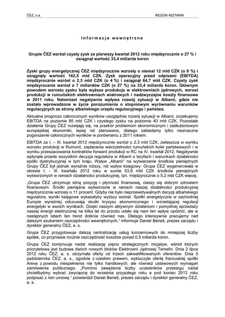 ČEZ, s.a. REGON 45274649 Informacje wewnętrzne Grupie ČEZ wzrósł czysty zysk za pierwszy kwartał 2012 roku międzyrocznie o 27 % i osiągnął wartość 33,4 miliarda koron Zyski grupy energetycznej ČEZ międzyrocznie wzrosły o niemal 12 mld CZK (o 8 %) i osiągnęły wartość 162,5 mld CZK. Zysk operacyjny przed odpisami (EBITDA) międzyrocznie wzrósł o 2,3 mld CZK (o 4 %) i osiągnął 64,7 mld CZK. Czysty zysk międzyrocznie wzrósł o 7 miliardów CZK (o 27 %) na 33,4 miliarda koron. Głównym powodem wzrostu zysku była wyższa produkcja w elektrowniach jądrowych, wzrost produkcji w rumuńskich elektrowniach wiatrowych i nadzwyczajne koszty finansowe w 2011 roku. Natomiast negatywnie wpływa rozwój sytuacji w Albanii, gdzie nie zostało wprowadzone w życie porozumienie o stopniowym wyrównaniu warunków regulacyjnych ze strony albańskiego urzędu regulacyjnego i państwa. Aktualna prognoza całorocznych wyników uwzględnia rozwój sytuacji w Albanii, oczekujemy EBITDA na poziomie 85 mld CZK i czystego zysku na poziomie 40 mld CZK. Pozostałe działania Grupy ČEZ rozwijają się, na przekór problemom ekonomicznym i zadłużeniowym europejskiej ekonomiki, lepiej niż planowano, dlatego zakładamy tylko nieznaczne pogorszenie całorocznych wyników w porównaniu z 2011 rokiem. EBITDA za I. – III. kwartał 2012 międzyrocznie wzrósł o 2,3 mld CZK, zwłaszcza w wyniku wzrostu produkcji w Rumunii, zapłacenia wierzytelności rumuńskich kolei państwowych i w wyniku przeszacowania kontraktów forward produkcji w RC na IV. kwartał 2012. Negatywnie wpłynęła przede wszystkim decyzja regulatora w Albanii o taryfach i warunkach działalności spółki dystrybucyjnej w tym kraju. Wpływ „Albanii“ na wytwarzanie środków pieniężnych Grupy ČEZ był jednak wyraźnie niższy, niż wpływ księgowy. Grupa ČEZ wygenerowała w okresie I. - III. kwartału 2012 roku w sumie 53,6 mld CZK środków pieniężnych wytworzonych w ramach działalności produkcyjnej, tzn. międzyrocznie o 5,2 mld CZK więcej. „Grupa ČEZ utrzymuje silną pozycję i płynność finansową, cieszy się dobrym zdrowiem finansowym. Środki pieniężne wytworzone w ramach naszej działalności produkcyjnej międzyrocznie wzrosły o 11 procent. Gdyby nie było nieprzewidywalnych decyzji albańskiego regulatora, wyniki księgowe wykazałyby wyższy wzrost. Spółki energetyczne w zachodniej Europie wyraźniej odczuwają skutki kryzysu ekonomicznego i wzrastającej regulacji energetyki w swoich wynikach. Dzięki naszym aktywnym działaniom i pomyślnej sprzedaży naszej energii elektrycznej na kilka lat do przodu udało się nam ten wpływ opóźnić, ale w następnych latach ten trend dotknie również nas. Dlatego intensywnie pracujemy nad dalszym szukaniem oszczędności wewnętrznych,“ informuje Daniel Beneš, prezes zarządu i dyrektor generalny ČEZ, a. s. Grupa ČEZ przygotowuje dalszą centralizację usług koncernowych do mniejszej liczby spółek, co przyniesie rocznie oszczędność kosztów ponad 0,5 miliarda koron. Grupa ČEZ kontynuuje nadal realizację pięciu strategicznych inicjatyw, wśród których priorytetowa jest budowa dwóch nowych bloków Elektrowni Jądrowej Temelín. Dnia 2 lipca 2012 roku ČEZ, a. s. otrzymała oferty od trzech zakwalifikowanych oferentów. Dnia 5 października ČEZ, a. s., zgodnie z czeskim prawem, wykluczyła ofertę francuskiej spółki Areva z powodu niespełnienia nie tylko handlowych, ale również ustawowych wymagań zamówienia publicznego. „Pomimo zawężenia liczby uczestników przetargu nadal chcielibyśmy wybrać zwycięzcę do września przyszłego roku a pod koniec 2013 roku podpisać z nim umowę.“ potwierdził Daniel Beneš, prezes zarządu i dyrektor generalny ČEZ, a. s. ČEZ, s.a. REGON 45274649 Tabela: Wyniki gospodarcze Grupy ČEZ za I. – III. kwartał 2012 (mld CZK) międzyroczna zmiana % Przychody operacyjne 162,5 +8% EBITDA (Zysk przed potrąceniem odsetek) 64,7 +4% Zysk po opodatkowaniu 33,4 + 27 %