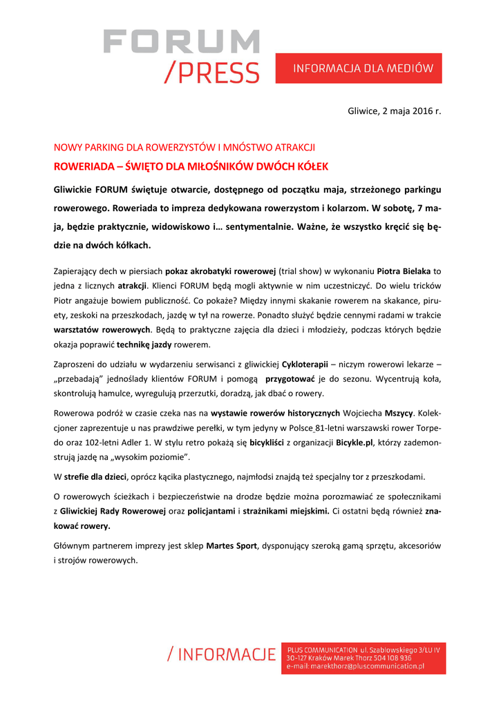 Gliwice, 2 maja 2016 r. NOWY PARKING DLA ROWERZYSTÓW I MNÓSTWO ATRAKCJI ROWERIADA – ŚWIĘTO DLA MIŁOŚNIKÓW DWÓCH KÓŁEK Gliwickie FORUM świętuje otwarcie, dostępnego od początku maja, strzeżonego parkingu rowerowego. Roweriada to impreza dedykowana rowerzystom i kolarzom. W sobotę, 7 maja, będzie praktycznie, widowiskowo i… sentymentalnie. Ważne, że wszystko kręcić się będzie na dwóch kółkach. Zapierający dech w piersiach pokaz akrobatyki rowerowej (trial show) w wykonaniu Piotra Bielaka to jedna z licznych atrakcji. Klienci FORUM będą mogli aktywnie w nim uczestniczyć. Do wielu tricków Piotr angażuje bowiem publiczność. Co pokaże? Między innymi skakanie rowerem na skakance, piruety, zeskoki na przeszkodach, jazdę w tył na rowerze. Ponadto służyć będzie cennymi radami w trakcie warsztatów rowerowych. Będą to praktyczne zajęcia dla dzieci i młodzieży, podczas których będzie okazja poprawić technikę jazdy rowerem. Zaproszeni do udziału w wydarzeniu serwisanci z gliwickiej Cykloterapii – niczym rowerowi lekarze – „przebadają” jednoślady klientów FORUM i pomogą przygotować je do sezonu. Wycentrują koła, skontrolują hamulce, wyregulują przerzutki, doradzą, jak dbać o rowery. Rowerowa podróż w czasie czeka nas na wystawie rowerów historycznych Wojciecha Mszycy. Kolekcjoner zaprezentuje u nas prawdziwe perełki, w tym jedyny w Polsce 81-letni warszawski rower Torpedo oraz 102-letni Adler 1. W stylu retro pokażą się bicykliści z organizacji Bicykle.pl, którzy zademonstrują jazdę na „wysokim poziomie”. W strefie dla dzieci, oprócz kącika plastycznego, najmłodsi znajdą też specjalny tor z przeszkodami. O rowerowych ścieżkach i bezpieczeństwie na drodze będzie można porozmawiać ze społecznikami z Gliwickiej Rady Rowerowej oraz policjantami i strażnikami miejskimi. Ci ostatni będą również znakować rowery. Głównym partnerem imprezy jest sklep Martes Sport, dysponujący szeroką gamą sprzętu, akcesoriów i strojów rowerowych. O CENTRUM HANDLOWYM FORUM W GLIWICACH FORUM: centrum handlowo-rozrywkowe położone w ścisłym centrum Gliwic. 43.000 m kw. pow. handlowej i 140 najemców czyni z niego jedno z największych na Górnym Śląsku i w Zagłębiu. Świetna lokalizacja, doskonałe połączenie z siecią drogową i transportem publicznym oraz rzesza lojalnych klientów to główne czynniki sukcesu FORUM. 70 proc. najemców FORUM to marki modowe i z sektora „zdrowie i uroda”, w tym tak znane firmy jak: H&M, Reserved, New Yorker, Zara, Bershka, Cubus, Douglas, KappAhl, Pull&Bear, C&A, Rossmann, CCC, Sephora, Stradivarius, SuperPharm. Inne branże także reprezentowane są przez wiodące marki: RTV Euro AGD, Martes Sport, Home&You. Część rozrywkowa FORUM to m.in. 13-ekranowe kino Cinema City oraz klub sieci Jatomi Fitness. Strefa restauracyjna „Pod chmurami” o oryginalnej architekturze i stylistyce to przyjemne miejsce spotkań mieszkańców Gliwic, dodatkowo stanowiące o atrakcyjności rynkowej centrum handlowego. Właścicielem FORUM w Gliwicach jest DEKA Immobilien GmbH. Zarządcą Centrum Handlowego FORUM Gliwice jest międzynarodowa firma doradcza JLL. FORUM Gliwice jest laureatem prestiżowych nagród branżowych. Najważniejsze z nich to: Silver Solal Marketing Awards by ICSC w 2014, 2013, 2012, 2010, 2009; 2011 International Property Awards – Highly Commended; Wyróżnienia w programie PRCH Retail Awards w 2011 i 2015 r.; Nagroda Główna w programie 2012 PRCH Retail Awards.