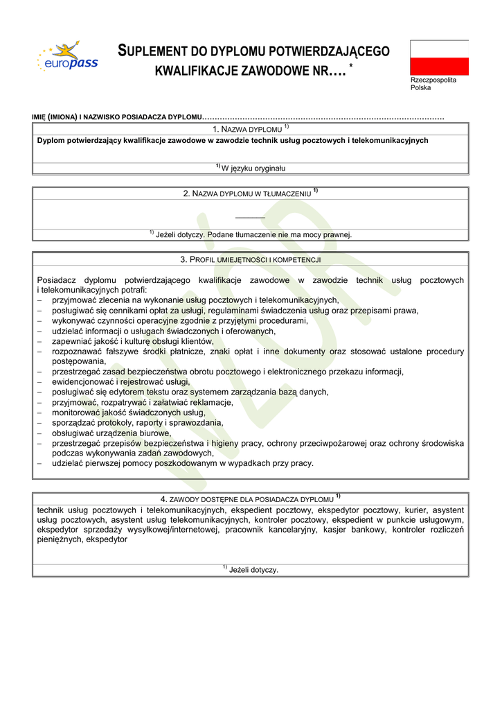 SUPLEMENT DO DYPLOMU POTWIERDZAJĄCEGO KWALIFIKACJE ZAWODOWE NR…. * Rzeczpospolita Polska IMIĘ (IMIONA) I NAZWISKO POSIADACZA DYPLOMU…………………………………………………………………………………… 1. NAZWA DYPLOMU 1) Dyplom potwierdzający kwalifikacje zawodowe w zawodzie technik usług pocztowych i telekomunikacyjnych 1) W języku oryginału 2. NAZWA DYPLOMU W TŁUMACZENIU 1) _______ 1) Jeżeli dotyczy. Podane tłumaczenie nie ma mocy prawnej. 3. PROFIL UMIEJĘTNOŚCI I KOMPETENCJI Posiadacz dyplomu potwierdzającego kwalifikacje zawodowe w zawodzie technik usług pocztowych i telekomunikacyjnych potrafi: − przyjmować zlecenia na wykonanie usług pocztowych i telekomunikacyjnych, − posługiwać się cennikami opłat za usługi, regulaminami świadczenia usług oraz przepisami prawa, − wykonywać czynności operacyjne zgodnie z przyjętymi procedurami, − udzielać informacji o usługach świadczonych i oferowanych, − zapewniać jakość i kulturę obsługi klientów, − rozpoznawać fałszywe środki płatnicze, znaki opłat i inne dokumenty oraz stosować ustalone procedury postępowania, − przestrzegać zasad bezpieczeństwa obrotu pocztowego i elektronicznego przekazu informacji, − ewidencjonować i rejestrować usługi, − posługiwać się edytorem tekstu oraz systemem zarządzania bazą danych, − przyjmować, rozpatrywać i załatwiać reklamacje, − monitorować jakość świadczonych usług, − sporządzać protokoły, raporty i sprawozdania, − obsługiwać urządzenia biurowe, − przestrzegać przepisów bezpieczeństwa i higieny pracy, ochrony przeciwpożarowej oraz ochrony środowiska podczas wykonywania zadań zawodowych, − udzielać pierwszej pomocy poszkodowanym w wypadkach przy pracy. 1) 4. ZAWODY DOSTĘPNE DLA POSIADACZA DYPLOMU technik usług pocztowych i telekomunikacyjnych, ekspedient pocztowy, ekspedytor pocztowy, kurier, asystent usług pocztowych, asystent usług telekomunikacyjnych, kontroler pocztowy, ekspedient w punkcie usługowym, ekspedytor sprzedaży wysyłkowej/internetowej, pracownik kancelaryjny, kasjer bankowy, kontroler rozliczeń pieniężnych, ekspedytor 1) Jeżeli dotyczy. 5. PODSTAWA WYDANIA DYPLOMU Nazwa podmiotu wydającego dyplom Okręgowa Komisja Egzaminacyjna w …………………………. Nazwa władz sprawujących nadzór nad podmiotem wydającym dyplom Minister Edukacji Narodowej Poziom wykształcenia (krajowy lub międzynarodowy) ISCED 4 Warunki zdania egzaminu kwalifikacje zawodowe potwierdzającego Egzamin podzielony jest na dwa etapy: Etap I pisemny Część I – co najmniej 50% punktów możliwych do uzyskania Część II – co najmniej 30% punktów możliwych do uzyskania Etap II praktyczny Co najmniej 75% punktów możliwych do uzyskania Dostęp do następnego poziomu kształcenia Jeżeli posiadacz dyplomu uzyskał świadectwo dojrzałości, może kontynuować kształcenie w szkole wyższej Umowy międzynarodowe _______ Podstawa prawna wydania dyplomu stosowne rozporządzenie 6. PRZEBIEG KSZTAŁCENIA ZAKOŃCZONEGO UZYSKANIEM DYPLOMU Posiadacz dyplomu zdał egzamin potwierdzający kwalifikacje zawodowe po uzyskaniu świadectwa ukończenia szkoły policealnej Opis uzyskanego wykształcenia / szkolenia zawodowego Udział procentowy w programie (%) • Kształcenie teoretyczne 35 • Kształcenie praktyczne 65 Informacje dodatkowe: Okręgowa Komisja Egzaminacyjna w ………………………, e-mail: Więcej informacji (w tym opis krajowego systemu kwalifikacji) można znaleźć w Internecie pod adresem: www.men.gov.pl, www.koweziu.edu.pl Krajowy punkt informacyjny: www.europass.org.pl * Nota objaśniająca Niniejszy dokument ma na celu dostarczenie dodatkowych informacji na temat dyplomu potwierdzającego kwalifikacje zawodowe i sam w sobie nie ma mocy prawnej. Podstawą opisu są następujące teksty: Rezolucja Rady nr 93/C 49/01 z dnia 3 grudnia 1992 r. dotycząca przejrzystości kwalifikacji, Rezolucja Rady nr 96/C 224/04 z dnia 15 lipca 1996 r. dotycząca przejrzystości dyplomów szkolenia zawodowego, Zalecenie Parlamentu Europejskiego oraz Rady nr 2001/613/EC z dnia 10 lipca 2001 r. w sprawie mobilności w ramach Wspólnoty studentów, osób przechodzących szkolenia, wolontariuszy, nauczycieli i instruktorów. Więcej informacji można uzyskać pod adresem: http://europass.cedefop.eu.int © European Communities 2002