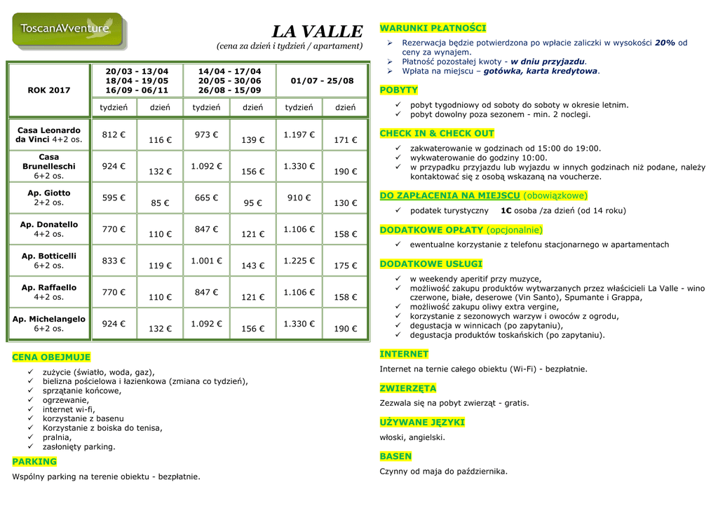LA VALLE (cena za dzień i tydzień / apartament) ROK 2017 20/03 - 13/04 18/04 - 19/05 16/09 - 06/11 tydzień Casa Leonardo da Vinci 4+2 os. 812 € Casa Brunelleschi 6+2 os. 924 € Ap. Giotto 2+2 os. 595 € Ap. Donatello 4+2 os. 770 € dzień 116 € 132 € 85 € 110 € 14/04 - 17/04 20/05 - 30/06 26/08 - 15/09 tydzień 973 € 1.092 € 665 € 847 € dzień 139 € 156 € 95 € 121 € WARUNKI PŁATNOŚCI Rezerwacja będzie potwierdzona po wpłacie zaliczki w wysokości 20% od ceny za wynajem. Płatność pozostałej kwoty - w dniu przyjazdu. Wpłata na miejscu – gotówka, karta kredytowa. 01/07 - 25/08 tydzień 1.197 € 1.330 € 910 € 1.106 € dzień 171 € 190 € 130 € 158 € POBYTY CHECK IN & CHECK OUT Ap. Raffaello 4+2 os. Ap. Michelangelo 6+2 os. 833 € 770 € 924 € 119 € 110 € 132 € 1.001 € 847 € 1.092 € 143 € 121 € 156 € CENA OBEJMUJE zużycie (światło, woda, gaz), bielizna pościelowa i łazienkowa (zmiana co tydzień), sprzątanie końcowe, ogrzewanie, internet wi-fi, korzystanie z basenu Korzystanie z boiska do tenisa, pralnia, zasłonięty parking. PARKING Wspólny parking na terenie obiektu - bezpłatnie. 1.225 € 1.106 € 1.330 € 175 € 158 € 190 € zakwaterowanie w godzinach od 15:00 do 19:00. wykwaterowanie do godziny 10:00. w przypadku przyjazdu lub wyjazdu w innych godzinach niż podane, należy kontaktować się z osobą wskazaną na voucherze. DO ZAPŁACENIA NA MIEJSCU (obowiązkowe) podatek turystyczny 1€ osoba /za dzień (od 14 roku) DODATKOWE OPŁATY (opcjonalnie) Ap. Botticelli 6+2 os. pobyt tygodniowy od soboty do soboty w okresie letnim. pobyt dowolny poza sezonem - min. 2 noclegi. ewentualne korzystanie z telefonu stacjonarnego w apartamentach DODATKOWE USŁUGI w weekendy aperitif przy muzyce, możliwość zakupu produktów wytwarzanych przez właścicieli La Valle - wino czerwone, białe, deserowe (Vin Santo), Spumante i Grappa, możliwość zakupu oliwy extra vergine, korzystanie z sezonowych warzyw i owoców z ogrodu, degustacja w winnicach (po zapytaniu), degustacja produktów toskańskich (po zapytaniu). INTERNET Internet na ternie całego obiektu (Wi-Fi) - bezpłatnie. ZWIERZĘTA Zezwala się na pobyt zwierząt - gratis. UŻYWANE JĘZYKI włoski, angielski. BASEN Czynny od maja do października.
