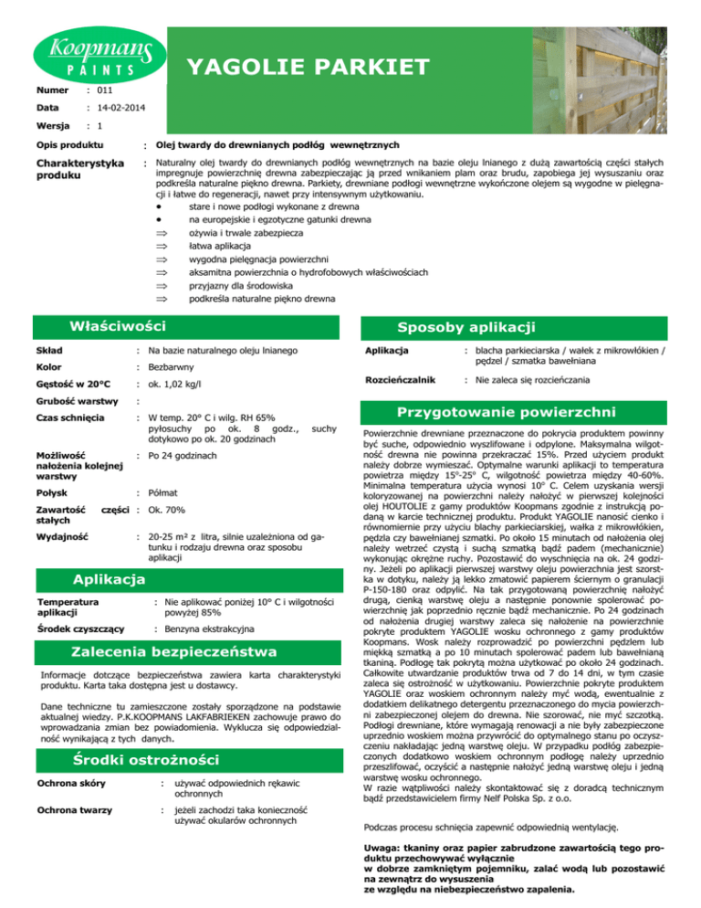 YAGOLIE PARKIET Numer : 011 Data : 14-02-2014 Wersja : 1 Opis produktu : Olej twardy do drewnianych podłóg wewnętrznych Charakterystyka produku : Naturalny olej twardy do drewnianych podłóg wewnętrznych na bazie oleju lnianego z dużą zawartością części stałych impregnuje powierzchnię drewna zabezpieczając ją przed wnikaniem plam oraz brudu, zapobiega jej wysuszaniu oraz podkreśla naturalne piękno drewna. Parkiety, drewniane podłogi wewnętrzne wykończone olejem są wygodne w pielęgnacji i łatwe do regeneracji, nawet przy intensywnym użytkowaniu. stare i nowe podłogi wykonane z drewna na europejskie i egzotyczne gatunki drewna ożywia i trwale zabezpiecza łatwa aplikacja wygodna pielęgnacja powierzchni aksamitna powierzchnia o hydrofobowych właściwościach przyjazny dla środowiska podkreśla naturalne piękno drewna Właściwości Sposoby aplikacji Skład : Na bazie naturalnego oleju lnianego Kolor : Bezbarwny Gęstość w 20°C : ok. 1,02 kg/l Grubość warstwy : Czas schnięcia : W temp. 20° C i wilg. RH 65% pyłosuchy po ok. 8 godz., dotykowo po ok. 20 godzinach Możliwość nałożenia kolejnej warstwy : Po 24 godzinach Połysk : Półmat Zawartość stałych suchy : 20-25 m² z litra, silnie uzależniona od gatunku i rodzaju drewna oraz sposobu aplikacji Aplikacja Temperatura aplikacji : Nie aplikować poniżej 10° C i wilgotności powyżej 85% Środek czyszczący : Benzyna ekstrakcyjna Zalecenia bezpieczeństwa Informacje dotczące bezpieczeństwa zawiera karta charakterystyki produktu. Karta taka dostępna jest u dostawcy. Dane techniczne tu zamieszczone zostały sporządzone na podstawie aktualnej wiedzy. P.K.KOOPMANS LAKFABRIEKEN zachowuje prawo do wprowadzania zmian bez powiadomienia. Wyklucza się odpowiedzialność wynikającą z tych danych. Środki ostrożności Ochrona skóry : używać odpowiednich rękawic ochronnych Ochrona twarzy : jeżeli zachodzi taka konieczność używać okularów ochronnych : blacha parkieciarska / wałek z mikrowłókien / pędzel / szmatka bawełniana Rozcieńczalnik : Nie zaleca się rozcieńczania Przygotowanie powierzchni części : Ok. 70% Wydajność Aplikacja Powierzchnie drewniane przeznaczone do pokrycia produktem powinny być suche, odpowiednio wyszlifowane i odpylone. Maksymalna wilgotność drewna nie powinna przekraczać 15%. Przed użyciem produkt należy dobrze wymieszać. Optymalne warunki aplikacji to temperatura powietrza między 15o-25o C, wilgotność powietrza między 40-60%. Minimalna temperatura użycia wynosi 10o C. Celem uzyskania wersji koloryzowanej na powierzchni należy nałożyć w pierwszej kolejności olej HOUTOLIE z gamy produktów Koopmans zgodnie z instrukcją podaną w karcie technicznej produktu. Produkt YAGOLIE nanosić cienko i równomiernie przy użyciu blachy parkieciarskiej, wałka z mikrowłókien, pędzla czy bawełnianej szmatki. Po około 15 minutach od nałożenia olej należy wetrzeć czystą i suchą szmatką bądź padem (mechanicznie) wykonując okrężne ruchy. Pozostawić do wyschnięcia na ok. 24 godziny. Jeżeli po aplikacji pierwszej warstwy oleju powierzchnia jest szorstka w dotyku, należy ją lekko zmatowić papierem ściernym o granulacji P-150-180 oraz odpylić. Na tak przygotowaną powierzchnię nałożyć drugą, cienką warstwę oleju a następnie ponownie spolerować powierzchnię jak poprzednio ręcznie bądź mechanicznie. Po 24 godzinach od nałożenia drugiej warstwy zaleca się nałożenie na powierzchnie pokryte produktem YAGOLIE wosku ochronnego z gamy produktów Koopmans. Wosk należy rozprowadzić po powierzchni pędzlem lub miękką szmatką a po 10 minutach spolerować padem lub bawełnianą tkaniną. Podłogę tak pokrytą można użytkować po około 24 godzinach. Całkowite utwardzanie produktów trwa od 7 do 14 dni, w tym czasie zaleca się ostrożność w użytkowaniu. Powierzchnie pokryte produktem YAGOLIE oraz woskiem ochronnym należy myć wodą, ewentualnie z dodatkiem delikatnego detergentu przeznaczonego do mycia powierzchni zabezpieczonej olejem do drewna. Nie szorować, nie myć szczotką. Podłogi drewniane, które wymagają renowacji a nie były zabezpieczone uprzednio woskiem można przywrócić do optymalnego stanu po oczyszczeniu nakładając jedną warstwę oleju. W przypadku podłóg zabezpieczonych dodatkowo woskiem ochronnym podłogę należy uprzednio przeszlifować, oczyścić a następnie nałożyć jedną warstwę oleju i jedną warstwę wosku ochronnego. W razie wątpliwości należy skontaktować się z doradcą technicznym bądź przedstawicielem firmy Nelf Polska Sp. z o.o. Podczas procesu schnięcia zapewnić odpowiednią wentylację. Uwaga: tkaniny oraz papier zabrudzone zawartością tego produktu przechowywać wyłącznie w dobrze zamkniętym pojemniku, zalać wodą lub pozostawić na zewnątrz do wysuszenia ze względu na niebezpieczeństwo zapalenia.