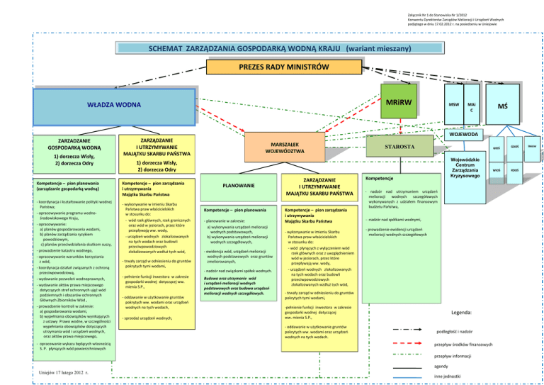 Załącznik Nr 1 do Stanowiska Nr 1/2012 Konwentu Dyrektorów Zarządów Melioracji i Urządzeo Wodnych podjętego w dniu 17.02.2012 r. na posiedzeniu w Uniejowie SCHEMAT ZARZĄDZANIA GOSPODARKĄ WODNĄ KRAJU (wariant mieszany) PREZES RADY MINISTRÓW MRiRW WŁADZA WODNA ZARZADZANIE GOSPODARKĄ WODNĄ 1) dorzecza Wisły, 2) dorzecza Odry Kompetencje – pion planowania (zarządzanie gospodarką wodną) DORZECZA ODRY - koordynacja i kształtowanie polityki wodnej Paostwa; - opracowywanie programu wodnośrodowiskowego Kraju, - opracowywanie: a) planów gospodarowania wodami, b) planów zarządzania ryzykiem powodziowym, c) planów przeciwdziałania skutkom suszy, - prowadzenie katastru wodnego, - opracowywanie warunków korzystania z wód, - koordynacja działao związanych z ochroną przeciwpowodziową, - wydawanie pozwoleo wodnoprawnych, - wydawanie aktów prawa miejscowego dotyczących stref ochronnych ujęd wód podziemnych i obszarów ochronnych Głównych Zbiorników Wód , - prowadzenie kontroli w zakresie: a) gospodarowania wodami, b) wypełniania obowiązków wynikających z ustawy Prawo wodne, w szczególności wypełniania obowiązków dotyczących utrzymania wód i urządzeo wodnych, oraz aktów prawa miejscowego, - opracowanie wykazu będących własnością S. P. płynących wód powierzchniowych ZARZĄDZANIE I UTRZYMYWANIE MAJĄTKU SKARBU PAOSTWA MARSZAŁEK WOJEWÓDZTWA MSW - wykonywanie w imieniu Skarbu Paostwa praw właścicielskich w stosunku do: - wód rzek głównych, rzek granicznych oraz wód w jeziorach, przez które przepływają ww. wody, - urządzeo wodnych zlokalizowanych na tych wodach oraz budowli przeciwpowodziowych zlokalizowanych wzdłuż tych wód, - trwały zarząd w odniesieniu do gruntów pokrytych tymi wodami, PLANOWANIE Kompetencje – pion planowania …………………………… - planowanie w zakresie: a) wykonywania urządzeo melioracji wodnych podstawowych, b) wykonywania urządzeo melioracji wodnych szczegółowych, - ewidencja wód, urządzeo melioracji wodnych podstawowych oraz gruntów zmeliorowanych, - nadzór nad związkami spółek wodnych. - pełnienie funkcji inwestora w zakresie gospodarki wodnej dotyczącej ww. mienia S.P., - oddawanie w użytkowanie gruntów pokrytych ww. wodami oraz urządzeo wodnych na tych wodach, - sprzedaż urządzeo wodnych, Budowa oraz utrzymanie wód i urządzeo melioracji wodnych podstawowych oraz budowa urządzeo melioracji wodnych szczegółowych. ZARZĄDZANIE I UTRZYMYWANIE MAJĄTKU SKARBU PAOSTWA Kompetencje – pion zarządzania i utrzymywania Majątku Skarbu Paostwa - wykonywanie w imieniu Skarbu Paostwa praw właścicielskich w stosunku do: - wód płynących z wyłączeniem wód rzek głównych oraz z uwzględnieniem wód w jeziorach, przez które przepływają ww. wody, - urządzeo wodnych zlokalizowanych na tych wodach oraz budowli przeciwpowodziowych zlokalizowanych wzdłuż tych wód, STAROSTA Wojewódzkie Centrum Zarządzania Kryzysowego Kompetencje - nadzór nad utrzymaniem urządzeo melioracji wodnych szczegółowych wykonywanych z udziałem finansowym budżetu Paostwa, - -nadzór nad spółkami wodnymi, - prowadzenie ewidencji urządzeo melioracji wodnych szczegółowych - trwały zarząd w odniesieniu do gruntów pokrytych tymi wodami, -pełnienie funkcji inwestora w zakresie gospodarki wodnej dotyczącej ww. mienia S.P., - oddawanie w użytkowanie gruntów pokrytych ww. wodami oraz urządzeo wodnych na tych wodach. Legenda: podległośd i nadzór przepływ środków finansowych przepływ informacji Uniejów 17 lutego 2012 r. MŚ WOJEWODA WOJEWODA 1) dorzecza Wisły, 2) dorzecza Odry Kompetencje – pion zarządzania i utrzymywania Majątku Skarbu Paostwa MAi C agendy agendy inne jednostki inne jednostki GIOŚ GDOŚ WiOŚ RDOŚ IMiGW
