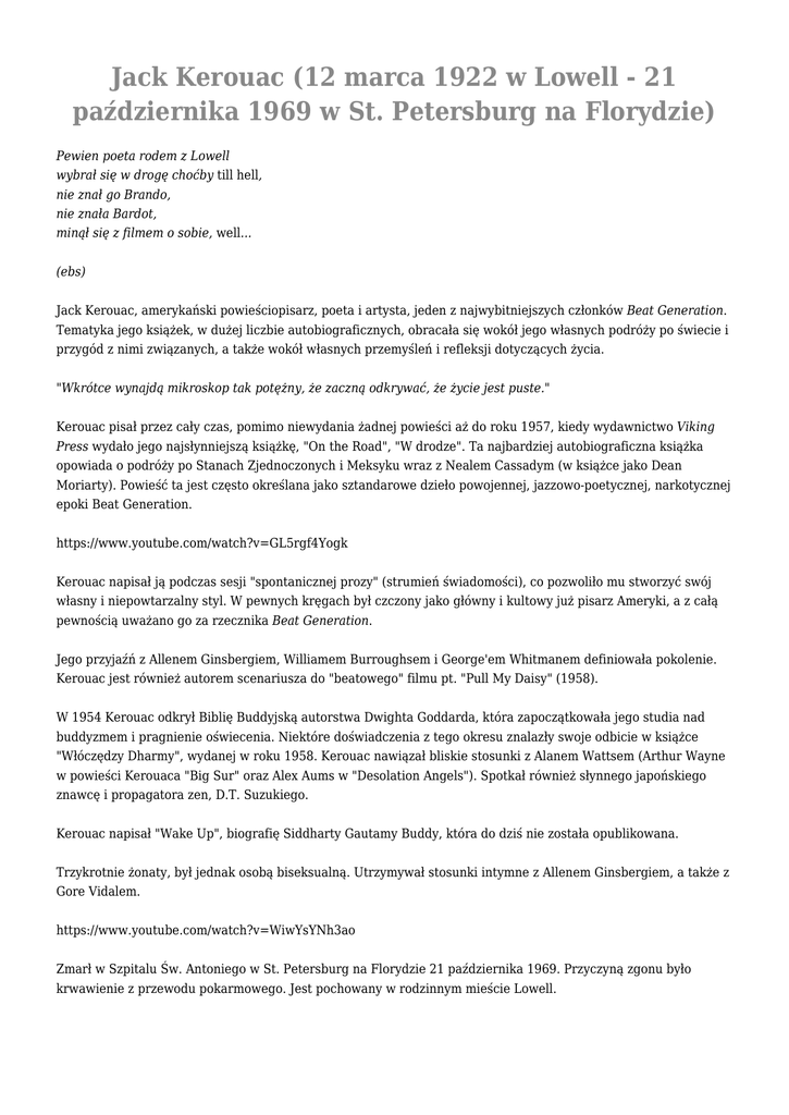 Jack Kerouac (12 marca 1922 w Lowell - 21 października 1969 w St. Petersburg na Florydzie) Pewien poeta rodem z Lowell wybrał się w drogę choćby till hell, nie znał go Brando, nie znała Bardot, minął się z filmem o sobie, well... (ebs) Jack Kerouac, amerykański powieściopisarz, poeta i artysta, jeden z najwybitniejszych członków Beat Generation. Tematyka jego książek, w dużej liczbie autobiograficznych, obracała się wokół jego własnych podróży po świecie i przygód z nimi związanych, a także wokół własnych przemyśleń i refleksji dotyczących życia. "Wkrótce wynajdą mikroskop tak potężny, że zaczną odkrywać, że życie jest puste." Kerouac pisał przez cały czas, pomimo niewydania żadnej powieści aż do roku 1957, kiedy wydawnictwo Viking Press wydało jego najsłynniejszą książkę, "On the Road", "W drodze". Ta najbardziej autobiograficzna książka opowiada o podróży po Stanach Zjednoczonych i Meksyku wraz z Nealem Cassadym (w książce jako Dean Moriarty). Powieść ta jest często określana jako sztandarowe dzieło powojennej, jazzowo-poetycznej, narkotycznej epoki Beat Generation. https://www.youtube.com/watch?v=GL5rgf4Yogk Kerouac napisał ją podczas sesji "spontanicznej prozy" (strumień świadomości), co pozwoliło mu stworzyć swój własny i niepowtarzalny styl. W pewnych kręgach był czczony jako główny i kultowy już pisarz Ameryki, a z całą pewnością uważano go za rzecznika Beat Generation. Jego przyjaźń z Allenem Ginsbergiem, Williamem Burroughsem i George'em Whitmanem definiowała pokolenie. Kerouac jest również autorem scenariusza do "beatowego" filmu pt. "Pull My Daisy" (1958). W 1954 Kerouac odkrył Biblię Buddyjską autorstwa Dwighta Goddarda, która zapoczątkowała jego studia nad buddyzmem i pragnienie oświecenia. Niektóre doświadczenia z tego okresu znalazły swoje odbicie w książce "Włóczędzy Dharmy", wydanej w roku 1958. Kerouac nawiązał bliskie stosunki z Alanem Wattsem (Arthur Wayne w powieści Kerouaca "Big Sur" oraz Alex Aums w "Desolation Angels"). Spotkał również słynnego japońskiego znawcę i propagatora zen, D.T. Suzukiego. Kerouac napisał "Wake Up", biografię Siddharty Gautamy Buddy, która do dziś nie została opublikowana. Trzykrotnie żonaty, był jednak osobą biseksualną. Utrzymywał stosunki intymne z Allenem Ginsbergiem, a także z Gore Vidalem. https://www.youtube.com/watch?v=WiwYsYNh3ao Zmarł w Szpitalu Św. Antoniego w St. Petersburg na Florydzie 21 października 1969. Przyczyną zgonu było krwawienie z przewodu pokarmowego. Jest pochowany w rodzinnym mieście Lowell. Napisał kiedyś do Neala Cassady'ego: "Zrewolucjonizuję literaturę amerykańską i będę pił szampana z gwiazdami Hollywoodu." Udało mu się spełnić tę pierwszą zapowiedź, ale co do drugiej, to przegrał w przedbiegach, choć wcale nie dlatego, że nie starał się zrealizować swoich planów. Kiedy w 1957 roku z maszyn drukarskich schodziły jeszcze ciepłe egzemplarze "W drodze", pewny siebie Kerouac wziął pióro do ręki i napisał list do Marlona Brando (odnaleziony w 2005 roku). Podsunął aktorowi pomysł: Brando kupi prawa do "W drodze", żeby nakręcić film na podstawie tej powieści. Marlon zagra Deana, a Jack - Sala. (opis do DVD filmu "W drodze")