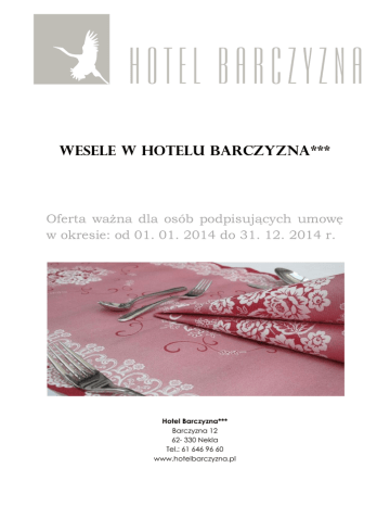 WESELE W HOTELU BARCZYZNA*** Oferta ważna dla osób podpisujących umowę w okresie: od 01. 01. 2014 do 31. 12. 2014 r. Hotel Barczyzna*** Barczyzna 12 62- 330 Nekla Tel.: 61 646 96 60 www.hotelbarczyzna.pl PROPOZYCJA I Obiad Zupa: Rosół z makaronem II danie 3 porcje/1os. Kotlet de Volaille Pierś z kurczaka ze szpinakiem i serem pleśniowym w panierce Roladka drobiowa z mozzarellą i suszonymi pomidorami w sosie porowym Kotlet schabowy panierowany Pieczeń wieprzowa z karkówki Zraz wieprzowy Dodatki: Ziemniaki gotowane z koperkiem Pyzy drożdżowe Frytki Bukiet surówek (trzy rodzaje) Kapusta zasmażana biała Warzywa gotowane Sos pieczeniowy ciemny Deser Deser lodowy z sosem truskawkowym i bitą śmietaną Ciasto 1,5 porcji / 1os. Kawa, herbata b/o Zimne zakąski 3 porcje/1 os. Barszcz czysty Galaretka z kurczaka Mozaika mięsna Indyk faszerowany warzywami Wędliny faszerowane Ryba opiekana w sosie pomidorowym Sałatka grecka Sałatka brokułowa Pieczywo mieszane jasne i ciemne, masło Kolacja 1,5 porcji/1os. Szaszłyk drobiowy Golonki po bawarsku i peklowane Strogonow wieprzowy z kluseczkami Kapusta kwaszona zasmażana Pieczywo jasne i ciemne, masło Musztarda, chrzan, ketchup Cena Propozycji I – 180 zł/ 1 os. PROPOZYCJA II Obiad Zupa: Rosół z makaronem II danie 3, 5 porcje /1os. Kotlet de Volaille Pierś z kurczaka faszerowana szynką, serem i czerwoną papryką, panierowana w sezamie Roladka drobiowa z mozzarellą i suszonymi pomidorami w sosie porowym Kotlet schabowy panierowany z pieczarkami Pieczeń wieprzowa z karkówki Zraz wieprzowy Dodatki: Ziemniaki gotowane z koperkiem Pyzy drożdżowe Frytki Kluski śląskie Bukiet surówek (3 rodzaje) Buraczki na zimno Kapusta zasmażana czerwona Warzywa gotowane Sos pieczeniowy ciemny Deser Deser lodowy z owocami z sosem jagodowym i bitą śmietaną Ciasto 2 porcje / 1os. Kawa, herbata b/o Zimne zakąski 3 porcje/ 1os. Barszcz z pasztecikiem Galaretka z kurczaka Filet z kurczaka faszerowany szpinakiem Wędliny faszerowane Schab w otoczce chrzanowej Ryba opiekana w sosie pomidorowym Paluszki rybne w sosie tatarskim Sałatka grecka Pieczywo jasne i ciemne, masło Kolacja 1,5 porcji / 1os. Żeberka w miodzie Golonki po bawarsku i peklowane Fileciki drobiowe w sosie grzybowym Kapusta kwaszona zasmażana Sałatka jarzynowa Pieczywo jasne i ciemne, masło Musztarda, chrzan, ketchup Cena propozycji II 205 zł / 1 os. PROPOZYCJA III Aperitif Wino musujące Obiad Zupa Krem szparagowy II danie 4 porcje / 1os. Filet z indyka w płatkach kukurydzianych Roladka drobiowa z mozzarellą i suszonymi pomidorami otulona szynką parmeńską Kotlet wieprzowy po amerykańsku zapiekany z serem Zraz wołowy Pieczeń wieprzowa Kaczka po polsku Grillowany łosoś Dodatki: Ziemniaki gotowane z koperkiem Pyzy drożdżowe Frytki Kluski półfrancuskie Bukiet surówek (3 rodzaje) Kapusta zasmażana biała i czerwona Buraczki na zimno Warzywa gotowane Sos pieczeniowy ciemny Deser Sorbet pomarańczowy z dodatkiem alkoholu podany w owocu Ciasto 2 porcje / 1os. Kawa, herbata b/o Zimne zakąski 3 porcje/ 1os. Barszcz z pasztecikiem Galaretka z kurczaka Indyk faszerowany warzywami Schab pieczony w otoczce chrzanowej Ryba opiekana w sosie pomidorowym Pstrąg faszerowany łososiem i krewetkami Sałatka grecka Sałatka ziemniaczana z suszonymi pomidorami i ogórkiem Pieczywo jasne i ciemne, masło Kolacja 1,5 porcji / 1os. Żurek z jajkiem lub flaki wołowe Szaszłyk drobiowy Żeberka w miodzie Golonki po bawarsku i peklowane Gołąbki w sosie pomidorowym Kapusta kwaszona zasmażana Sałatka jarzynowa Pieczywo jasne i ciemne, masło Musztarda, chrzan, ketchup Cena Propozycji III – 230 zł /1 os. DANIA NA ZAMÓWIENIE POTRAWKA (udko z kurczaka, roladka drobiowa, ryż, marchewka z groszkiem, sos potrawkowy) Cena: 12 zł/ porcja Staropolski udziec wieprzowy, podany z ziemniakami opiekanymi w ziołach oraz sosami: żurawinowym i czosnkowym Cena: 18 zł/ porcja Jesiotr na sałatce jarzynowej Cena: 22 zł/ porcja Prosię faszerowane kaszą i warzywami, podane z opiekanymi ziemniakami oraz sosami: czosnkowym i salsa Cena: 25 zł/ porcja W CENIE: Apartament dla Państwa Młodych. Standardowy wystrój stołów i sali (kurtyna świetlna, falbany, menu weselne na stołach, serwetki bawełniane, kwiaty i świece- kolor do uzgodnienia). Czerwony dywan przed wejściem głównym. Powitanie chlebem i solą. OPŁATY DODATKOWE: Tort weselny. Za wniesienie własnego alkoholu nie pobierana jest dodatkowa opłata. Napoje: Pakiet (napoje gazowane, soki, woda – bez ograniczeń) – 25 zł/ os. Ceny wg spożycia – napoje gazowane (Pepsi, 7UP, Mirinda) – 10 zł/1 l, soki owocowe – 10 zł/1 l, woda niegazowana 6 zł/1, 5 l. Pokrowce na krzesła: 6 zł/ os. Poprawiny (15. 00- 20. 00): 50 zł/ os. NOCLEG Cennik pokoi dla Gości Weselnych (bez śniadania): pokój 1- os.: 140 zł, pokój 2- os.: 180 zł, pokój 3- os.: 220 zł, pokój 4- os.: 260 zł, dostawka: 60 zł Śniadanie dla Gości Weselnych I (jedzenie pozostałe z wesela, pieczywo, masło, kawa, herbata): 10 zł/ os. Śniadanie dla Gości Weselnych II (standardowe śniadanie hotelowe- podane w bufecie): 25 zł/ os.