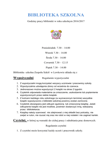 BIBLIOTEKA SZKOLNA Godziny pracy biblioteki w roku szkolnym 2016/2017 Poniedziałek: 7.30 – 14.00 Wtorek 7.30 – 14.00 Środa 7.30 – 14.00 Czwartek 7.30 – 12.15 Piątek 7.30 – 14.00 Biblioteka szkolna Zespołu Szkół w Lewkowie składa się z Wypożyczalni Regulamin wypożyczalni Z wypożyczalni mogą korzystać wszyscy uczniowie i pracownicy szkoły. Wypożyczalnia udostępnia zbiory od września do czerwca. Jednorazowo można wypożyczyć 2 książki na okres 2 tygodni. Czytelnik odpowiada materialnie za zniszczenie, uszkodzenie lub poplamienie wypożyczonych przez siebie książek. 5. Z końcem każdego roku szkolnego (w wyznaczonym terminie) wszystkie książki wypożyczone z biblioteki szkolnej powinny zostać zwrócone. 6. Czytelnik obowiązany jest odkupić zgubioną lub zniszczoną książkę. Jeżeli odkupienie książki nie jest możliwe, powinien dostarczyć inną, wskazaną przez bibliotekarza. 7. Książkę należy szanować nie zdejmować z niej okładki bez potrzeby, nie zwijać w rulon, nie rzucać nią oraz nie robić w niej notatek i nie zaginać kartek. 1. 2. 3. 4. Czytelni, w której są warunki do cichej pracy i odrabiania prac domowych. Regulamin czytelni 1. Z czytelni może korzystać każdy uczeń i pracownik szkoły. 2. Zabrania się wnoszenia jedzenia i picia. 3. W czytelni obowiązuje cisza. 4. W czytelni można korzystać ze zbiorów całej biblioteki Biblioteka szkolna służy uczniom i nauczycielom naszej szkoły. Z księgozbioru mogą korzystać także rodzice . Biblioteka jest miejscem, w którym możemy wypożyczyć książki. Wypożyczyć, to znaczy zabrać je do domu, przeczytać i zwrócić do biblioteki. Kto jest najważniejszy w bibliotece? Bez obecności kogo - każda, nawet najlepiej wyposażona biblioteka jest martwa? Czytelnik - to w bibliotece osoba najważniejsza! W roku 2016 biblioteka została zmodernizowana i odnowiona ponieważ bardzo chcemy, by była ona wyjątkowo przyjazna dla uczniów, nauczycieli oraz wszystkich pracowników szkoły.. Biblioteka to niezwykle ważne centrum informacji szkoły. Główne cele pracy biblioteki to: 1. Przygotowanie uczniów do samodzielnego wyszukiwania informacji, samokształcenia oraz korzystania z różnego rodzaju zborów na dalszych etapach edukacji. 2. Zapewnienie prawidłowego przebiegu informacji na temat istniejących w bibliotece pozycji metodycznych. 3. Wspieranie realizacji zadań dydaktycznych, wychowawczych i opiekuńczych szkoły. 4. Rozwijanie kreatywności uczniów. Wydarzenia z życia biblioteki - pasowanie uczniów klas I na czytelnika. - lekcje biblioteczne dla Przedszkolaków - „Z książką mi do twarzy” - „Okładki jak żywe” „Andrzejki w bibliotece” - Miesiąc Bibliotek Szkolnych