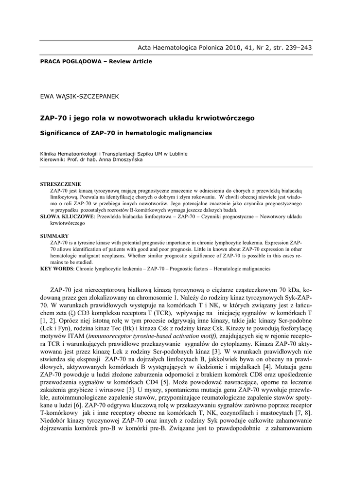 Acta Haematologica Polonica 2010, 41, Nr 2, str. 239–243 PRACA POGLĄDOWA – Review Article EWA WĄSIK-SZCZEPANEK ZAP-70 i jego rola w nowotworach układu krwiotwórczego Significance of ZAP-70 in hematologic malignancies Klinika Hematoonkologii i Transplantacji Szpiku UM w Lublinie Kierownik: Prof. dr hab. Anna Dmoszyńska STRESZCZENIE ZAP-70 jest kinazą tyrozynową mającą prognostyczne znaczenie w odniesieniu do chorych z przewlekłą białaczką limfocytową. Pozwala na identyfikację chorych o dobrym i złym rokowaniu. W chwili obecnej niewiele jest wiadomo o roli ZAP-70 w przebiegu innych nowotworów. Jego potencjalne znaczenie jako czynnika prognostycznego w przypadku pozostałych rozrostów B-komórkowych wymaga jeszcze dalszych badań. SŁOWA KLUCZOWE: Przewlekła białaczka limfocytowa – ZAP-70 – Czynniki prognostyczne – Nowotwory układu krwiotwórczego SUMMARY ZAP-70 is a tyrosine kinase with potential prognostic importance in chronic lymphocytic leukemia. Expression ZAP70 allows identification of patients with good and poor prognosis. Little in known about ZAP-70 expression in other hematologic malignant neoplasms. Whether similar prognostic significance of ZAP-70 is possible in this cases remains to be studied. KEY WORDS: Chronic lymphocytic leukemia – ZAP-70 – Prognostic factors – Hematologic malignancies ZAP-70 jest niereceptorową białkową kinazą tyrozynową o cięŜarze cząsteczkowym 70 kDa, kodowaną przez gen zlokalizowany na chromosomie 1. NaleŜy do rodziny kinaz tyrozynowych Syk-ZAP70. W warunkach prawidłowych występuje na komórkach T i NK, w których związany jest z łańcuchem zeta (ζ) CD3 kompleksu receptora T (TCR), wpływając na inicjację sygnałów w komórkach T [1, 2]. Oprócz niej istotną rolę w tym procesie odgrywają inne kinazy, takie jak: kinazy Scr-podobne (Lck i Fyn), rodzina kinaz Tec (ltk) i kinaza Csk z rodziny kinaz Csk. Kinazy te powodują fosforylację motywów ITAM (immunoreceptor tyrosine-based activation motif), znajdujących się w rejonie receptora TCR i warunkujących prawidłowe przekazywanie sygnałów do cytoplazmy. Kinaza ZAP-70 aktywowana jest przez kinazę Lck z rodziny Scr-podobnych kinaz [3]. W warunkach prawidłowych nie stwierdza się ekspresji ZAP-70 na dojrzałych limfocytach B, jakkolwiek bywa on obecny na prawidłowych, aktywowanych komórkach B występujących w śledzionie i migdałkach [4]. Mutacja genu ZAP-70 powoduje u ludzi złoŜone zaburzenia odporności z brakiem komórek CD8 oraz upośledzenie przewodzenia sygnałów w komórkach CD4 [5]. MoŜe powodować nawracające, oporne na leczenie zakaŜenia grzybicze i wirusowe [3]. U myszy, spontaniczna mutacja genu ZAP-70 wywołuje przewlekłe, autoimmunologiczne zapalenie stawów, przypominające reumatologiczne zapalenie stawów spotykane u ludzi [6]. ZAP-70 odgrywa kluczową rolę w przekazywaniu sygnałów zarówno poprzez receptor T-komórkowy jak i inne receptory obecne na komórkach T, NK, eozynofilach i mastocytach [7, 8]. Niedobór kinazy tyrozynowej ZAP-70 oraz innych z rodziny Syk powoduje całkowite zahamowanie dojrzewania komórek pro-B w komórki pre-B. Związane jest to prawdopodobnie z zahamowaniem 240 E. WĄSIK-SZCZEPANEK przewodnictwa sygnałów. Ponadto, dochodzi do zaburzenia innych waŜnych procesów komórkowych [9, 10, 11]. Zainteresowanie ZAP-70 znacząco wzrosło od kiedy poprzez określenie profilu ekspresji genów wykazano, iŜ występuje w niektórych przypadkach przewlekłej białaczki limfocytowej B-komórkowej (PBL-B). Gen ZAP-70 znajdował się w niewielkiej grupie ok. 240 genów wykazujących róŜnice w ekspresji pomiędzy dwoma grupami chorych z PBL-B, zróŜnicowanych na podstawie stanu mutacji genu IgVH . Potwierdzenie tej zaleŜności równieŜ na poziomie białka ZAP-70 stanowiło podstawę do załoŜenia, iŜ moŜe stanowić swoisty „ekwiwalent” stanu mutacji genu IgVH [12]. Jakkolwiek dają one wiele cennych informacji dotyczących przebiegu choroby, to jednak obserwuje się pewną niezgodność pomiędzy tymi dwoma parametrami. Jej zakres jest zróŜnicowany w zaleŜności od źródła. Na podstawie badań Crespo i wsp. oraz Orcharda i wsp. jej poziom wynosi 5–6% [12, 13], natomiast wg Rassenti i wsp. osiąga 23% [14]. Występowanie rozbieŜności w tym zakresie moŜe świadczyć o tym, iŜ oba te zjawiska występują niezaleŜnie. Fernandez i wsp. w grupie chorych z PBL-B, u których występowały rozbieŜne wyniki badań oceniające stan mutacji genu IgVH i poziom ekspresji ZAP-70 (ZAP-70–, UMIgVH), stwierdzili częstsze występowanie delecji TP53 oraz 11q, dwóch aberracji genetycznych o niekorzystnym rokowaniu [15]. Zjawisko to znalazło potwierdzenie w obserwacjach innych autorów [16]. Jednocześnie wykazano, iŜ w grupie chorych z niską ekspresją ZAP-70, delecja 13q występowała w 59%, trisomia 12 w 18%, natomiast delecja 11q w 3% przypadków. U chorych ZAP-70+ najczęściej obserwowaną aberracją genetyczną była trisomia 12 (38%), a w dalszej kolejności delecja 11q, która występowała z podobną częstotliwością jak przypadki stwierdzenia braku zaburzeń (21%) [17]. Wyniki te są zbieŜne z tymi, jakie uzyskali inni autorzy [18, 19]. Jednocześnie zdaniem Rassenti i wsp. ZAP70 stanowi bardziej znaczący niŜ brak mutacji genu IgVH, czynnik prognostyczny określający konieczność szybszego rozpoczęcia leczenia chorych z PBL-B [14]. Wykazano, Ŝe wysoka ekspresja ZAP-70 wiąŜe się ze zwiększoną fosforylacją tyrozyny oraz ze wzmoŜonym przekazywaniem sygnałów przez receptor komórki B (BCR), a to z kolei moŜe oddziaływać na proliferację i czas przeŜycia białaczkowych komórek [20]. Przez długi okres czasu uwaŜano, Ŝe ZAP-70 jest stabilnym markerem białaczkowych limfocytów B [21], w odróŜnieniu do ekspresji CD38, która moŜe zmieniać się w pewnych okresach choroby [22].Utrzymywanie się ekspresji ZAP-70 w komórkach białaczkowych na stałym poziomie, j