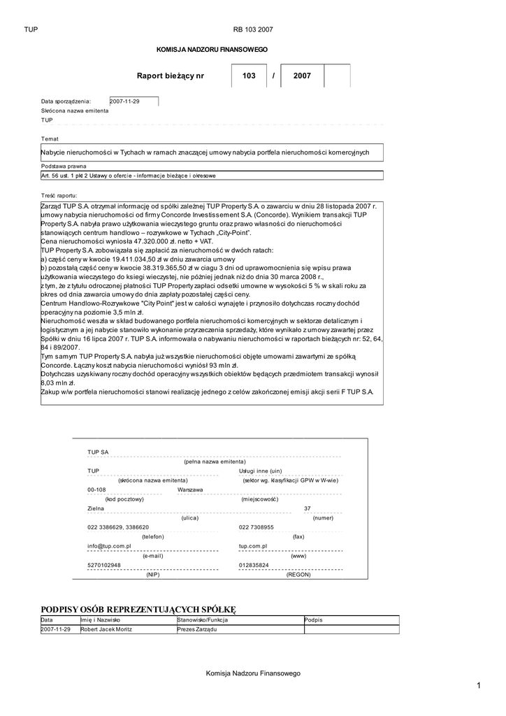TUP RB 103 2007 KOMISJA NADZORU FINANSOWEGO Raport bieŜący nr 103 / 2007 2007-11-29 Data sporządzenia: Skrócona nazwa emitenta TUP Temat Nabycie nieruchomości w Tychach w ramach znaczącej umowy nabycia portfela nieruchomości komercyjnych Podstawa prawna Treść raportu: Zarząd TUP S.A. otrzymał informację od spółki zaleŜnej TUP Property S.A. o zawarciu w dniu 28 listopada 2007 r. umowy nabycia nieruchomości od firmy Concorde Investissement S.A. (Concorde). Wynikiem transakcji TUP Property S.A. nabyła prawo uŜytkowania wieczystego gruntu oraz prawo własności do nieruchomości stanowiących centrum handlowo – rozrywkowe w Tychach „City-Point”. Cena nieruchomości wyniosła 47.320.000 zł. netto + VAT. TUP Property S.A. zobowiązała się zapłacić za nieruchomość w dwóch ratach: a) część ceny w kwocie 19.411.034,50 zł w dniu zawarcia umowy b) pozostałą część ceny w kwocie 38.319.365,50 zł w ciagu 3 dni od uprawomocnienia się wpisu prawa uŜytkowania wieczystego do ksiegi wieczystej, nie póŜniej jednak niŜ do dnia 30 marca 2008 r., z tym, Ŝe z tytułu odroczonej płatności TUP Property zapłaci odsetki umowne w wysokości 5 % w skali roku za okres od dnia zawarcia umowy do dnia zapłaty pozostałej części ceny. Centrum Handlowo-Rozrywkowe "City Point" jest w całości wynajęte i przynosiło dotychczas roczny dochód operacyjny na poziomie 3,5 mln zł. Nieruchomość weszła w skład budowanego portfela nieruchomości komercyjnych w sektorze detalicznym i logistycznym a jej nabycie stanowiło wykonanie przyrzeczenia sprzedaŜy, które wynikało z umowy zawartej przez Spółki w dniu 16 lipca 2007 r. TUP S.A. informowała o nabywaniu nieruchomości w raportach bieŜących nr: 52, 64, 84 i 89/2007. Tym samym TUP Property S.A. nabyła juŜ wszystkie nieruchomości objęte umowami zawartymi ze spółką Concorde. Łączny koszt nabycia nieruchomości wyniósł 93 mln zł. Dotychczas uzyskiwany roczny dochód operacyjny wszystkich obiektów będących przedmiotem transakcji wynosił 8,03 mln zł. Zakup w/w portfela nieruchomości stanowi realizację jednego z celów zakończonej emisji akcji serii F TUP S.A. TUP SA (pełna nazwa emitenta) TUP Usługi inne (uin) (skróc ona nazwa emitenta) 00-108 (sektor wg. klasyfikacji GPW w W-wie) Warszawa (kod pocztowy) (miejscowość) Zielna 37 (ulica) (numer) 022 3386629, 3386620 022 7308955 (telefon) (fax) [email protected] tup.c om.pl (e-mail) (www) 5270102948 012835824 (NIP) (REGON) PODPISY OSÓB REPREZENTUJĄCYCH SPÓŁKĘ Data Imię i Nazwisko Stanowisko/Funkc ja 2007-11-29 Robert Jacek Moritz Prezes Zarządu Podpis Komisja Nadzoru Finansowego 1