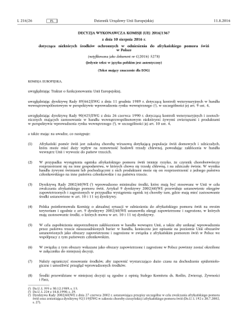 L 216/26 Dziennik Urzędowy Unii Europejskiej PL 11.8.2016 DECYZJA WYKONAWCZA KOMISJI (UE) 2016/1367 z dnia 10 sierpnia 2016 r. dotycząca niektórych środków ochronnych w odniesieniu do afrykańskiego pomoru świń w Polsce (notyfikowana jako dokument nr C(2016) 5278) (Jedynie tekst w języku polskim jest autentyczny) (Tekst mający znaczenie dla EOG) KOMISJA EUROPEJSKA, uwzględniając Traktat o funkcjonowaniu Unii Europejskiej, uwzględniając dyrektywę Rady 89/662/EWG z dnia 11 grudnia 1989 r. dotyczącą kontroli weterynaryjnych w handlu wewnątrzwspólnotowym w perspektywie wprowadzenia rynku wewnętrznego (1), w szczególności jej art. 9 ust. 4, uwzględniając dyrektywę Rady 90/425/EWG z dnia 26 czerwca 1990 r. dotyczącą kontroli weterynaryjnych i zootech nicznych mających zastosowanie w handlu wewnątrzwspólnotowym niektórymi żywymi zwierzętami i produktami w perspektywie wprowadzenia rynku wewnętrznego (2), w szczególności jej art. 10 ust. 4, a także mając na uwadze, co następuje: (1) Afrykański pomór świń jest zakaźną chorobą wirusową dotykającą populacje świń domowych i zdziczałych, która może mieć duży wpływ na rentowność hodowli trzody chlewnej, powodując zakłócenia w handlu wewnątrz Unii i wywozie do państw trzecich. (2) W przypadku wystąpienia ogniska afrykańskiego pomoru świń istnieje ryzyko, że czynnik chorobotwórczy rozprzestrzeni się na inne gospodarstwa, w których chowa się trzodę chlewną, i na zdziczałe świnie. W wyniku handlu żywymi świniami lub pochodzącymi z nich produktami może się on rozprzestrzenić z jednego państwa członkowskiego na inne państwa członkowskie i na państwa trzecie. (3) Dyrektywą Rady 2002/60/WE (3) wprowadzono minimalne środki, które mają być stosowane w Unii w celu zwalczania afrykańskiego pomoru świń. Artykuł 9 dyrektywy 2002/60/WE przewiduje ustanowienie okręgów zapowietrzonych i zagrożonych w przypadku wystąpienia ognisk tej choroby tam, gdzie mają mieć zastosowanie środki ustanowione w art. 10 i 11 tej dyrektywy. (4) Polska poinformowała Komisję o aktualnej sytuacji w odniesieniu do afrykańskiego pomoru świń na swoim terytorium i zgodnie z art. 9 dyrektywy 2002/60/WE ustanowiła okręgi zapowietrzone i zagrożone, w których mają zastosowanie środki, o których mowa w art. 10 i 11 tej dyrektywy. (5) W celu zapobieżenia niepotrzebnym zakłóceniom w handlu wewnątrz Unii, a także aby uniknąć wprowadzenia przez państwa trzecie nieuzasadnionych barier w handlu, konieczne jest opisanie na poziomie Unii obszarów ustanowionych jako obszary zapowietrzone i zagrożone w związku z afrykańskim pomorem świń w Polsce we współpracy z tym państwem członkowskim. (6) W związku z tym obszary wskazane jako obszary zapowietrzone i zagrożone w Polsce powinny zostać określone w załączniku do niniejszej decyzji. (7) Należy ograniczyć stosowanie środków, aby zapewnić wystarczająco dużo czasu na dochodzenie epidemiolo giczne i umożliwić przegląd wprowadzonych środków. (8) Środki przewidziane w niniejszej decyzji są zgodne z opinią Stałego Komitetu ds. Roślin, Zwierząt, Żywności i Pasz, (1) Dz.U. L 395 z 30.12.1989, s. 13. (2) Dz.U. L 224 z 18.8.1990, s. 29. (3) Dyrektywa Rady 2002/60/WE z dnia 27 czerwca 2002 r. ustanawiająca przepisy szczególne w celu zwalczania afrykańskiego pomoru świń oraz zmieniająca dyrektywę 92/119/EWG w zakresie choroby cieszyńskiej i afrykańskiego pomoru świń (Dz.U. L 192 z 20.7.2002, s. 27). 11.8.2016 PL Dziennik Urzędowy Unii Europejskiej L 216/27 PRZYJMUJE NINIEJSZĄ DECYZJĘ: Artykuł 1 Polska zapewnia, aby obszary zapowietrzone i zagrożone ustanowione zgodnie z art. 9 dyrektywy 2002/60/WE obejmowały co najmniej obszary wymienione jako obszary zapowietrzone i zagrożone w załączniku do niniejszej decyzji. Artykuł 2 Niniejszą decyzję stosuje się do dnia 30 września 2016 r. Artykuł 3 Niniejsza decyzja skierowana jest do Rzeczypospolitej Polskiej. Sporządzono w Brukseli dnia 10 sierpnia 2016 r. W imieniu Komisji Vytenis ANDRIUKAITIS Członek Komisji L 216/28 PL Dziennik Urzędowy Unii Europejskiej 11.8.2016 ZAŁĄCZNIK Polska Obszar zapowietrzony Obszary, o których mowa w art. 1 Zewnętrzna granica tego obszaru zapowietrzonego przebiega: a) od wschodu: od północnej granicy miejscowości Sanie Dąb na południe drogą łączącą miejscowość Sanie Dąb z miejscowością Kołaki Kościelne do przecięcia z rzeką Dąb, dalej wzdłuż rzeki Dąb na południowy wschód, następnie wzdłuż granicy lasu przy zachodniej granicy miejscowości TyboryOlszewo, następnie wzdłuż drogi łączącej miejscowość Tybory-Olszewo z miejscowością TyboryKamianka, następnie po zachodniej stronie miejscowości Tybory-Kamianka do drogi łączącej miejs cowość Tybory-Kamianka z miejscowością Jabłonka Kościelna, następnie na południe do cieku wodnego łączącego staw Kamianka z rzeką Jabłonka, następnie do ujścia cieku do rzeki Jabłonka, następnie w linii prostej na południe do skrzyżowania drogi nr 66 z drogą łączącą miejscowość Jabłonka Kościelna z miejscowością Miodusy-Litwa; b) od południa: drogą nr 66 w kierunku zachodnim do przecięcia rzeki Jabłonka z drogą nr 66, na stępnie wzdłuż południowej granicy miejscowości Faszcze do rzeki Jabłonka, dalej w kierunku za chodnim wzdłuż rzeki Jabłonka do granicy pomiędzy miejscowością Wdziękoń Pierwszy i Wdzię koń Drugi, a następnie w linii prostej na północ do drogi nr 66, dalej drogą nr 66 na zachód do przecięcia cieku wodnego z drogą nr 66 na wysokości miejscowości Wdziękoń Pierwszy; c) od zachodu: na północ wzdłuż cieku wodnego do granicy lasu, dalej wzdłuż wschodniej granicy re zerwatu „Grabówka”, a następnie wschodnią granicą lasu do drogi łączącej miejscowość Grabówka z miejscowością Wróble-Arciszewo; d) od północy: w linii prostej na wschód do rzeki Dąb poniże
