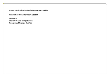 Futura – Policealna Szkoła dla Dorosłych w Lublinie Kierunek: technik informatyk 351203 Semestr: I Przedmiot: Sieci komputerowe Nauczyciel: Mirosław Ruciński Temat 6. Rodzaje środowisk sieciowych (klient-serwer I peer to peer) Sieci client-server (dedykowany serwer) Peer to peer Network Sieci client-server (dedykowany serwer) Peer to peer Network (sieć równorzędna) Sieć typu klient-serwer jest rozwiązaniem z dedykowanym serwerem zarządzającym. Komputery użytkowników są administrowane, monitorowane i zarządzane centralnie. Klienci serwera mogą pracować w środowisku Domenowym lub Grupie Roboczej Sieć peer to peer network. Wszystkie podłączone do sieci komputery są traktowane jednakowo (posiadają takie same prawa, wynikające z praw określonych na danym stanowisku komputerowym). Użytkownicy mogą pracować w Grupie Roboczej. Zalety sieci client-server - Dzięki centralnemu zarządzaniu bezpieczeństwem sieci oparte na serwerach są o wiele bezpieczniejsze od peer-to-peer. - Zmniejszenie ilości haseł wymaganych do zapamiętania przez użytkownika (najczęściej do jednego) - Zwiększenie wydajności pracujących w niej komputerów poprzez zdjęcie z nich ciężaru przetwarzania żądań innych klientów, żądania są przetwarzane przez serwer, który najczęściej ma większą moc obliczeniową niż zwykły komputer - Skalowalność sieci, łatwość zmieniania rozmiarów sieci. Zasoby są centralnie zabezpieczone i zarządzane znajdują się w jednym miejscu, przez co wydajność sieci nie spada wraz z jej powiększaniem. Wady sieci client-server - Duże koszty budowy i eksploatacji tego typu sieci wynikająca z konieczności zakupu, sieciowego systemu operacyjno oraz wyznaczenia administratora zarządzającego. - Awaria serwera powoduje unieruchomienie całej sieci. Można tego uniknąć poprzez np. grupowanie serwerów w celu uzyskania nadmierności. Jednak zwiększa to koszty budowy sieci. Zastosowanie sieci client-server Sieci oparte na serwerach są stosowane zwłaszcza w dużych sieciach, wymagających zwiększonego bezpieczeństwa oraz centralnego zarządzania zasobami. Zalety sieci peer-to-peer Sieci peer-to-peer są łatwe do wdrożenia, tanie w eksploatacji, ponieważ nie wymagają one skomplikowanych a co za tym idzie drogich serwerów. Nie wymagają opieki ze strony wykwalifikowanych administratorów. Wady sieci peer-to-peer Użytkownicy zmuszeni są pamiętać wiele haseł, zwykle po jednym dla każdego komputera pracującego w tego typu sieci. Brak centralnego składowania i udostępniania danych wymaga od użytkowników samodzielnego wyszukiwania danych rozproszonych na wielu komputerach. Mniejsza wydajność spowodowana, gdy zdalni użytkownicy współdzielą zasoby. Dostęp do zasobów danego użytkownika jest możliwy tylko wtedy, gdy jest on dostępny, (jeśli użytkownik wyłączy swój komputer jego zasoby będą niedostępne). Temat 7. Model ISO-OSI oraz DOD. Protokoły sieciowe ISO Międzynarodowa Organizacja Normalizacyjna (ang. International Organization for Standardization) OSI (ang. Open System Interconnection) Model OSI (pełna nazwa ISO OSI RM, ISO OSI Reference Model – model odniesienia łączenia systemów otwartych). Model ISO OSI RM jest traktowany, jako model odniesienia (wzorzec) dla większości rodzin protokołów komunikacyjnych. Podstawowym założeniem modelu jest podział systemów sieciowych na 7 warstw (ang. layers) współpracujących ze sobą w ściśle określony sposób. Model OSI Protokoły Model TCP/IP 7 Warstwa - Aplikacji HTTP, HTTPS, FTP, TFTP SMTP, POP3, TELNET, IMAP, SSH Aplikacji 6 Warstwa - Prezentacji 5 Warstwa - Sesji 4 Warstwa Transportowa TCP, UDP Transportowa 3 Warstwa - Sieciowa IP, RIP, ARP Internetu 2 Warstwa - Łącza danych MAC Dostępu do sieci 1 Warstwa - Fizyczna Ethernet, Token Ring, Frame Relay, ATM Warstwa aplikacji Warstwa aplikacji jest warstwą najwyższą, zajmuje się specyfikacją interfejsu, który wykorzystują aplikacje do przesyłania danych do sieci (poprzez kolejne warstwy modelu ISO/OSI). W przypadku sieci komputerowych aplikacje są zwykle procesami uruchomionymi na odległych hostach. Interfejs udostępniający programistom usługi dostarczane przez warstwę aplikacji opiera się na obiektach nazywanych gniazdami(ang. socket). Kiedy klient chce przesłać żądanie do serwera, przekazuje komunikat w dół do warstw niższych, które fizycznie przesyłają go do odpowiedniej maszyny, gdzie informacje ponownie wędrują w górę i są ostatecznie odbierane przez serwer. Jednocześnie zapewnia interfejs między aplikacjami, których używamy, a siecią (umożliwia komunikację). Warstwa prezentacji Podczas ruchu w dół zadaniem warstwy prezentacji jest przetworzenie danych od aplikacji do postaci kanonicznej (ang. canonical representation) zgodnej ze specyfikacją OSI-RM, dzięki czemu niższe warstwy zawsze otrzymują dane w tym samym formacie. Kiedy informacje płyną w górę, warstwa prezentacji tłumaczy format otrzymywanych danych na zgodny z wewnętrzną reprezentacją systemu docelowego. Warstwa ta odpowiada za kodowanie i konwersję danych oraz za kompresję / dekompresję; szyfrowanie / deszyfrowanie. Warstwa prezentacji obsługuje np. MPEG, JPG, GIF itp. Warstwa sesji Warstwa sesji otrzymuje od różnych aplikacji dane, które muszą zostać odpowiednio zsynchronizowane. Synchronizacja występuje między warstwami sesji systemu nadawcy i odbiorcy. Warstwa sesji "wie", która aplikacja łączy się z którą, dzięki czemu może zapewnić właściwy kierunek przepływu danych – nadzoruje połączenie. Wznawia je po przerwaniu. Warstwa transportowa Warstwa transportowa dba o poprawność przesyłania danych. W tej warstwie standardowa paczka danych oznaczana jest, jako TPDU (ang. Transport Protocol Data Unit). Aby informacje mogły zostać przesłane w dół, często muszą zostać podzielone na mniejsze fragmenty. Jeżeli informacji nie uda się przesłać popraw