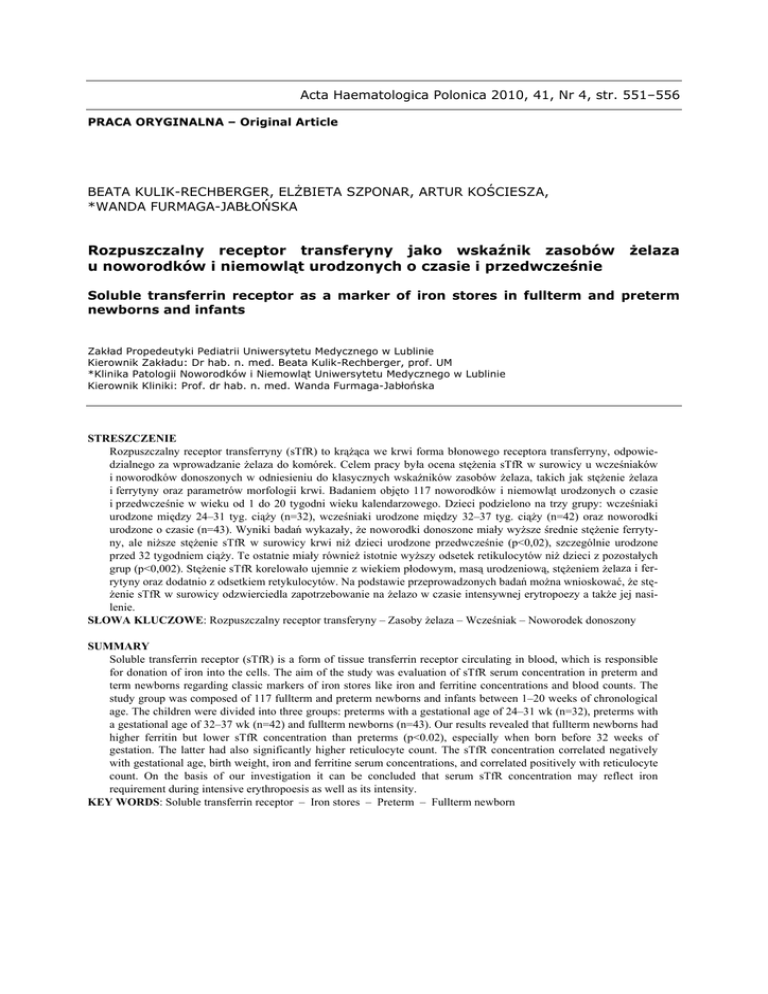 Acta Haematologica Polonica 2010, 41, Nr 4, str. 551–556 PRACA ORYGINALNA – Original Article BEATA KULIK-RECHBERGER, ELŻBIETA SZPONAR, ARTUR KOŚCIESZA, *WANDA FURMAGA-JABŁOŃSKA Rozpuszczalny receptor transferyny jako wskaźnik zasobów u noworodków i niemowląt urodzonych o czasie i przedwcześnie żelaza Soluble transferrin receptor as a marker of iron stores in fullterm and preterm newborns and infants Zakład Propedeutyki Pediatrii Uniwersytetu Medycznego w Lublinie Kierownik Zakładu: Dr hab. n. med. Beata Kulik-Rechberger, prof. UM *Klinika Patologii Noworodków i Niemowląt Uniwersytetu Medycznego w Lublinie Kierownik Kliniki: Prof. dr hab. n. med. Wanda Furmaga-Jabłońska STRESZCZENIE Rozpuszczalny receptor transferryny (sTfR) to krążąca we krwi forma błonowego receptora transferryny, odpowiedzialnego za wprowadzanie żelaza do komórek. Celem pracy była ocena stężenia sTfR w surowicy u wcześniaków i noworodków donoszonych w odniesieniu do klasycznych wskaźników zasobów żelaza, takich jak stężenie żelaza i ferrytyny oraz parametrów morfologii krwi. Badaniem objęto 117 noworodków i niemowląt urodzonych o czasie i przedwcześnie w wieku od 1 do 20 tygodni wieku kalendarzowego. Dzieci podzielono na trzy grupy: wcześniaki urodzone między 24–31 tyg. ciąży (n=32), wcześniaki urodzone między 32–37 tyg. ciąży (n=42) oraz noworodki urodzone o czasie (n=43). Wyniki badań wykazały, że noworodki donoszone miały wyższe średnie stężenie ferrytyny, ale niższe stężenie sTfR w surowicy krwi niż dzieci urodzone przedwcześnie (p<0,02), szczególnie urodzone przed 32 tygodniem ciąży. Te ostatnie miały również istotnie wyższy odsetek retikulocytów niż dzieci z pozostałych grup (p<0,002). Stężenie sTfR korelowało ujemnie z wiekiem płodowym, masą urodzeniową, stężeniem żelaza i ferrytyny oraz dodatnio z odsetkiem retykulocytów. Na podstawie przeprowadzonych badań można wnioskować, że stężenie sTfR w surowicy odzwierciedla zapotrzebowanie na żelazo w czasie intensywnej erytropoezy a także jej nasilenie. SŁOWA KLUCZOWE: Rozpuszczalny receptor transferyny – Zasoby żelaza – Wcześniak – Noworodek donoszony SUMMARY Soluble transferrin receptor (sTfR) is a form of tissue transferrin receptor circulating in blood, which is responsible for donation of iron into the cells. The aim of the study was evaluation of sTfR serum concentration in preterm and term newborns regarding classic markers of iron stores like iron and ferritine concentrations and blood counts. The study group was composed of 117 fullterm and preterm newborns and infants between 1–20 weeks of chronological age. The children were divided into three groups: preterms with a gestational age of 24–31 wk (n=32), preterms with a gestational age of 32–37 wk (n=42) and fullterm newborns (n=43). Our results revealed that fullterm newborns had higher ferritin but lower sTfR concentration than preterms (p<0.02), especially when born before 32 weeks of gestation. The latter had also significantly higher reticulocyte count. The sTfR concentration correlated negatively with gestational age, birth weight, iron and ferritine serum concentrations, and correlated positively with reticulocyte count. On the basis of our investigation it can be concluded that serum sTfR concentration may reflect iron requirement during intensive erythropoesis as well as its intensity. KEY WORDS: Soluble transferrin receptor – Iron stores – Preterm – Fullterm newborn 552 B. KULIK-RECHBERGER i wsp. WSTĘP Niedokrwistość jest najczęstszym zaburzeniem hematologicznym okresu noworodkowego i niemowlęcego. Szczególnie narażone są na nią wcześniaki i noworodki z małą urodzeniową masą ciała. Częstą przyczyną niedokrwistości jest niedobór żelaza. W okresie życia płodowego żelazo gromadzone jest głównie w ciągu ostatniego trymestru ciąży, stąd też dzieci przedwcześnie urodzone zwykle mają niedostatek tego pierwiastka. Dodatkowo do niedoboru żelaza prowadzą częste pobierania krwi do badań laboratoryjnych, ograniczenia żywieniowe, szybkie tempo rozwoju dziecka i wzmożona erytropoeza. Początkowo, niedobór żelaza jest utajony, bez widocznych objawów klinicznych. Tymczasem obserwacje dowodzą, że żelazo jest niezmiernie ważne dla prawidłowego rozwoju, a jego niedobór kojarzony jest z nieprawidłowościami w rozwoju psychomotorycznym, niekiedy nieodwracalnymi [1, 2]. Stąd też istnieje potrzeba określenia wskaźnika, który odzwierciedlałby zasoby żelaza dokładniej niż wskaźniki powszechnie stosowane takie jak stężenie ferrytyny, transferyny, żelaza w surowicy, wskaźnik wysycenia transferyny żelazem czy parametry układu czerwonokrwinkowego. Istnieją poglądy, że takim wskaźnikiem mógłby być rozpuszczalny monomer receptora transferyny (ang. soluble transferrin receptor – sTfR). Krąży on w połączeniu z transferyną, białkiem nośnikowym transportującym żelazo we krwi. Receptorem dla tego białka jest błonowy receptor transferyny (TfR), odpowiedzialny za wprowadzanie żelaza do komórek. Jest on dimerem glikoprotein składających się z 760 aminokwasów połączonych dwoma mostkami siarkowymi, tworzącym cząstkę wielkości 190 kDa. Receptor transferyny obecny jest w błonie prawie wszystkich komórek organizmu, oprócz dojrzałych erytrocytów. Najwięcej receptorów zlokalizowanych jest w komórkach łożyska, wątroby i szpiku kostnego. Niedobór żelaza w komórkach zwiększa, jego nadmiar zmniejsza syntezę TfR. Odzwierciedleniem ilości TfR w komórkach jest stężenie jego formy krążącej we krwi, powstającej w procesie proteolizy białka receptora. Stężenie sTfR we krwi jest proporcjonalne do ilości receptorów błonowych i zależy w dużej mierze od nasilenia erytropoezy, gdyż pokaźnym źródłem receptora we krwi są erytroblasty i częściowo retikulocyty. Przy zmniejszonej aktywności szpiku (niewydolność